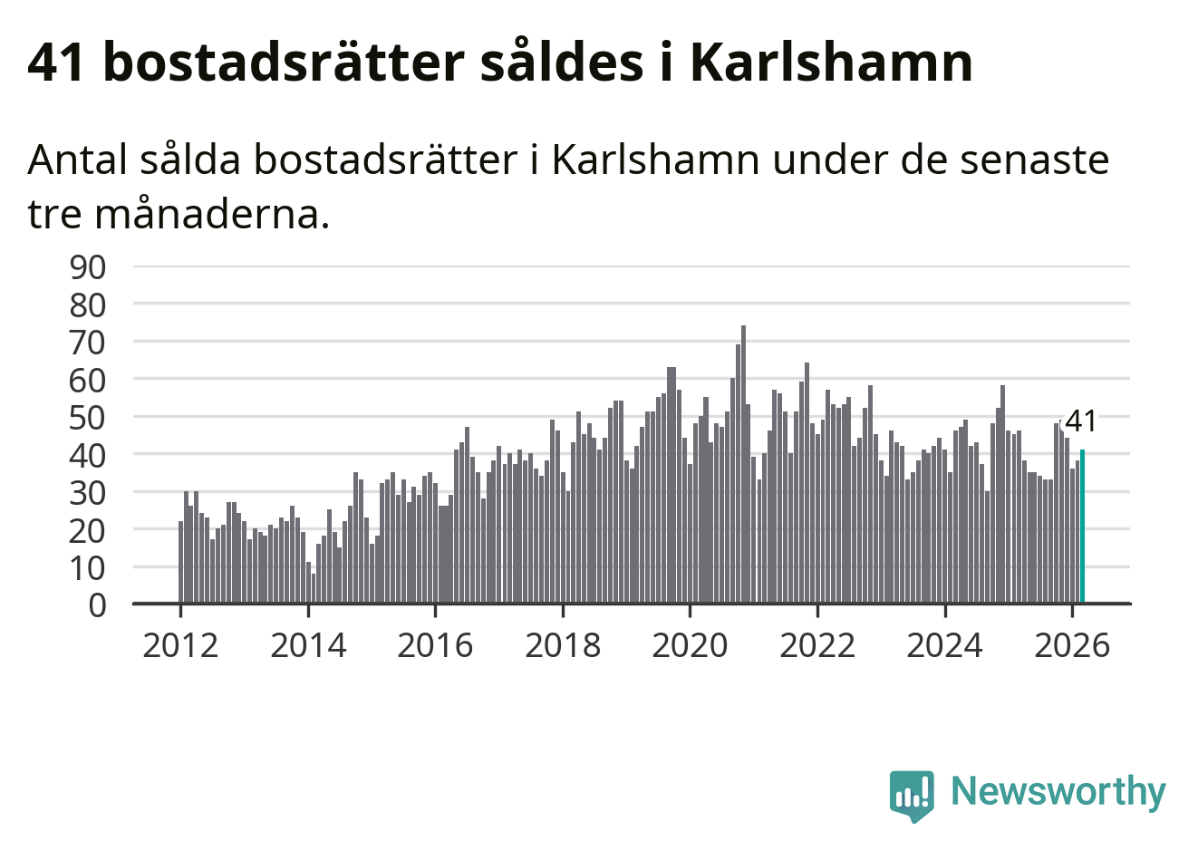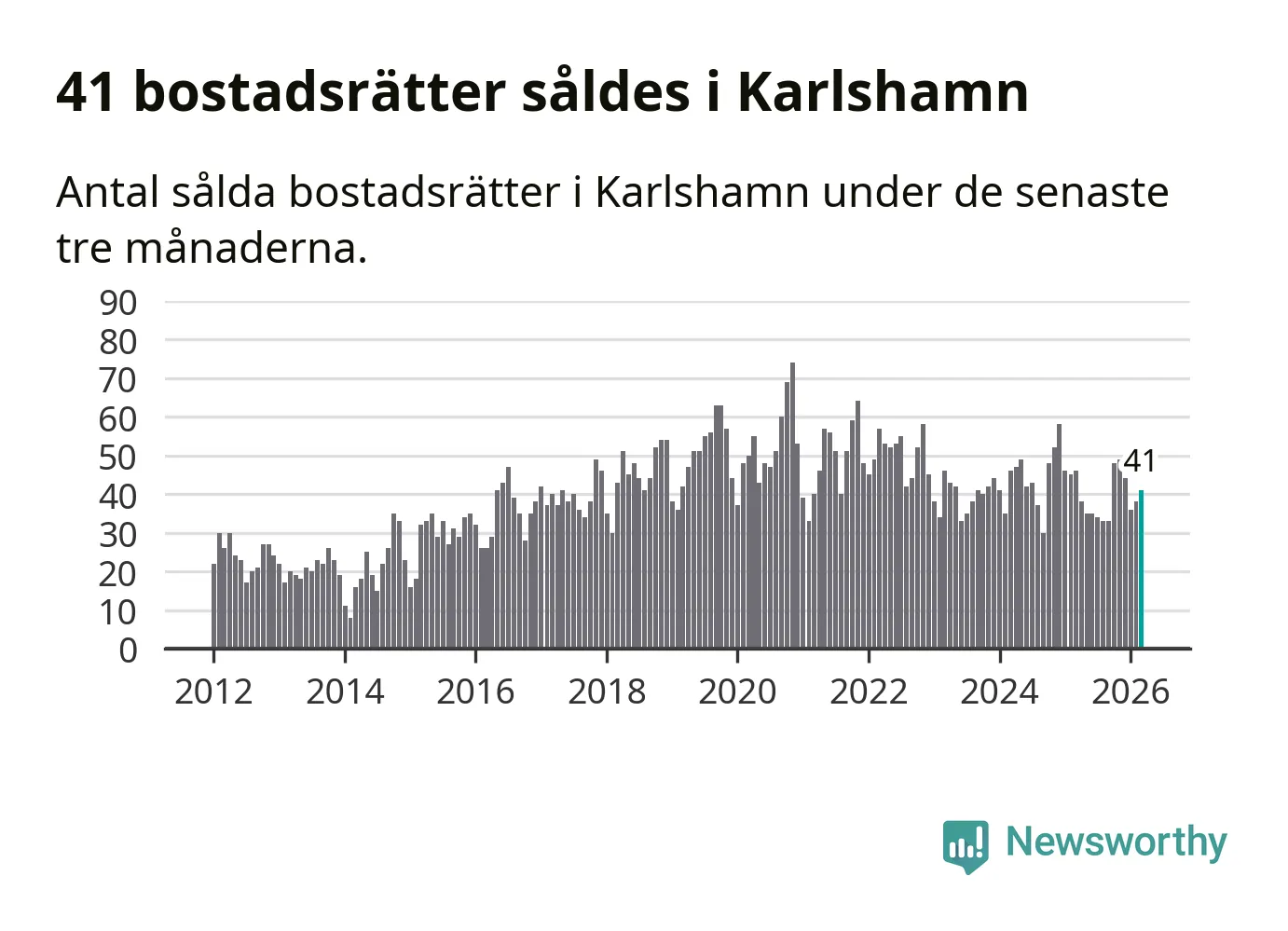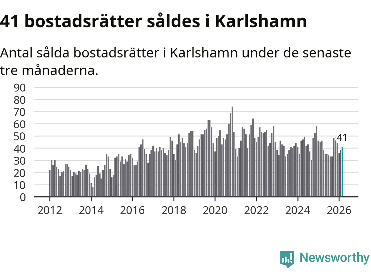 Sammanlagt såldes 41 bostadsrätter i Karlshamns kommun mellan januari och mars till ett genomsnittligt pris på 1,0 miljon kronor. I fjol gjordes 46 affärer vid den här tiden på året.