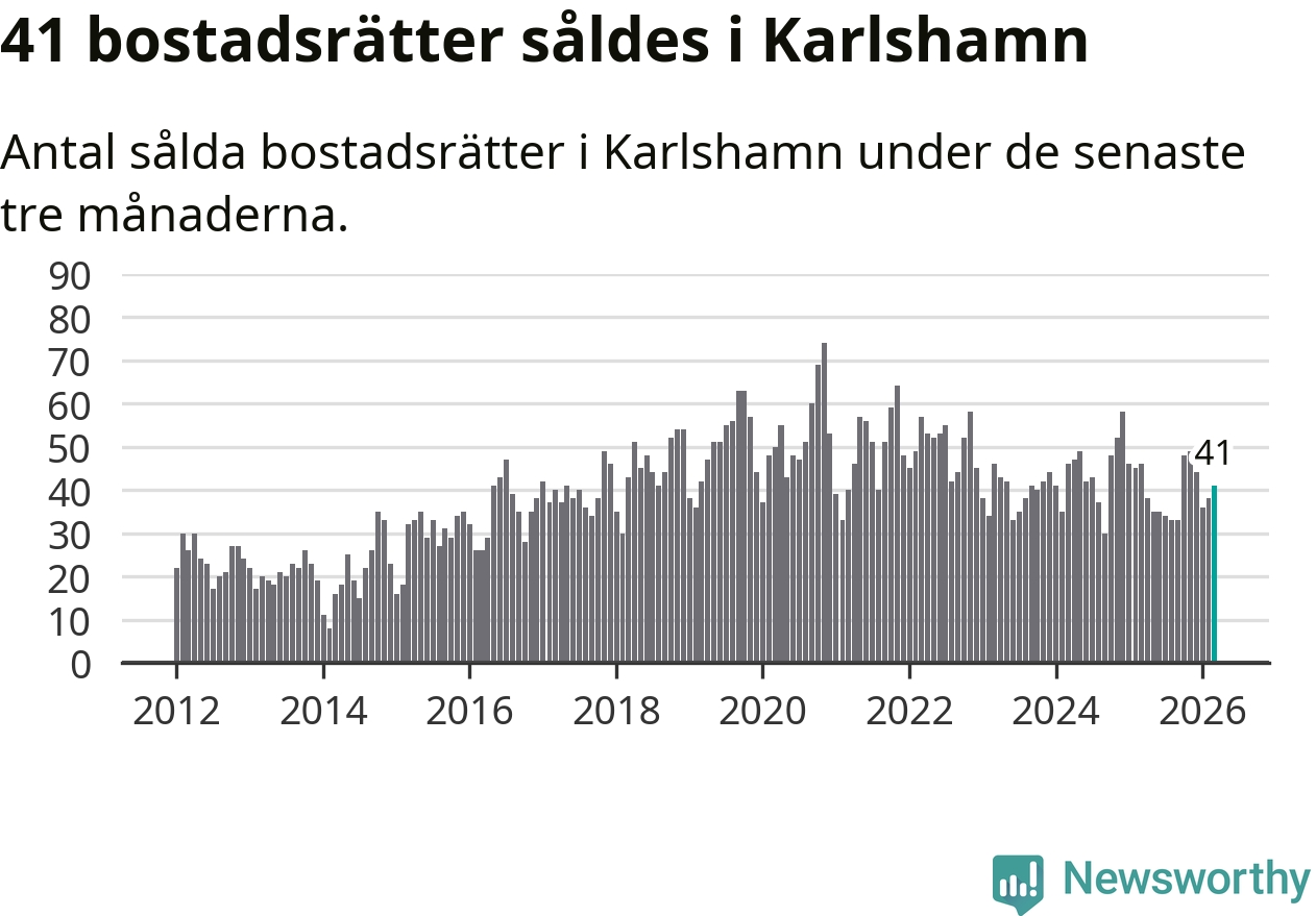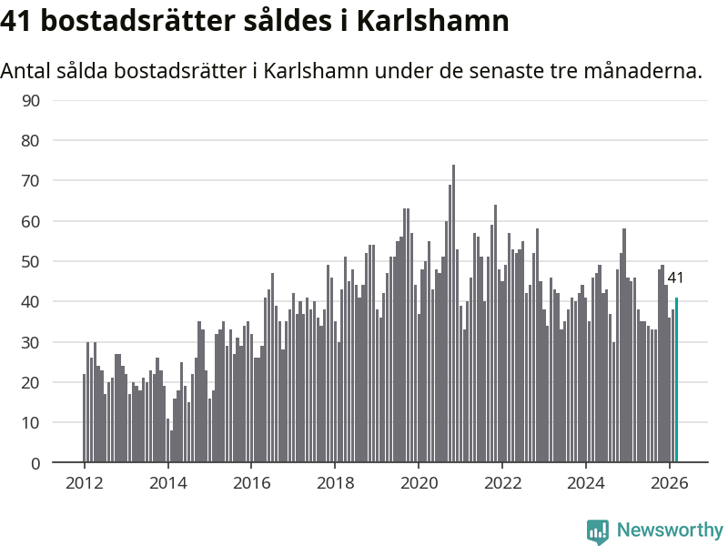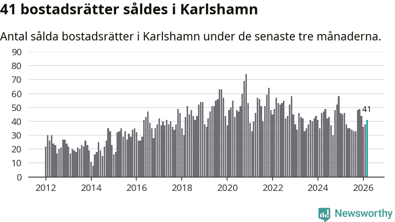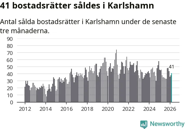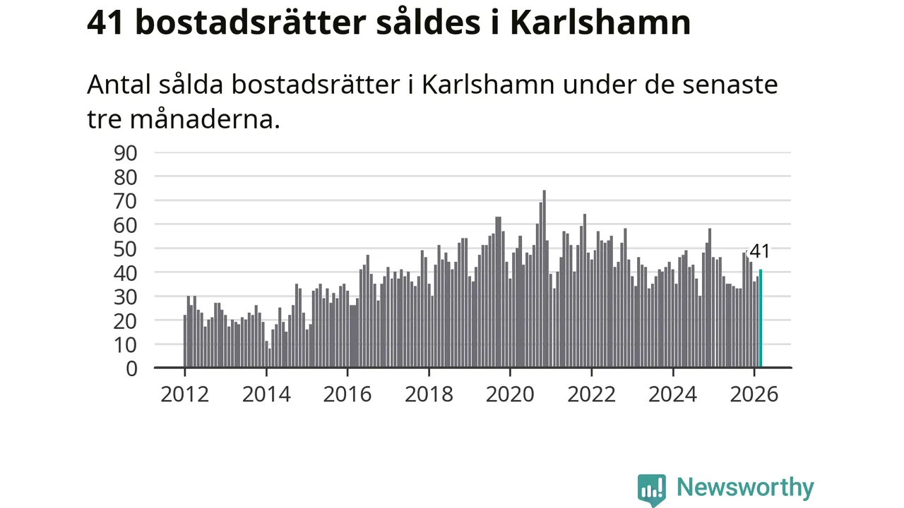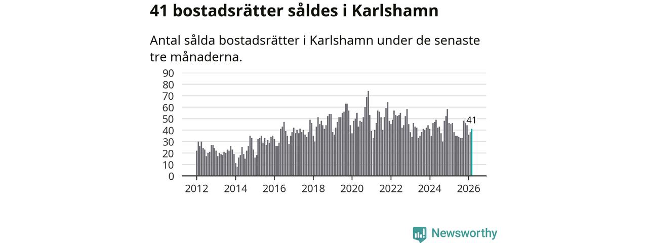 Sammanlagt såldes 41 bostadsrätter i Karlshamns kommun mellan januari och mars till ett genomsnittligt pris på 1,0 miljon kronor. I fjol gjordes 46 affärer vid den här tiden på året.