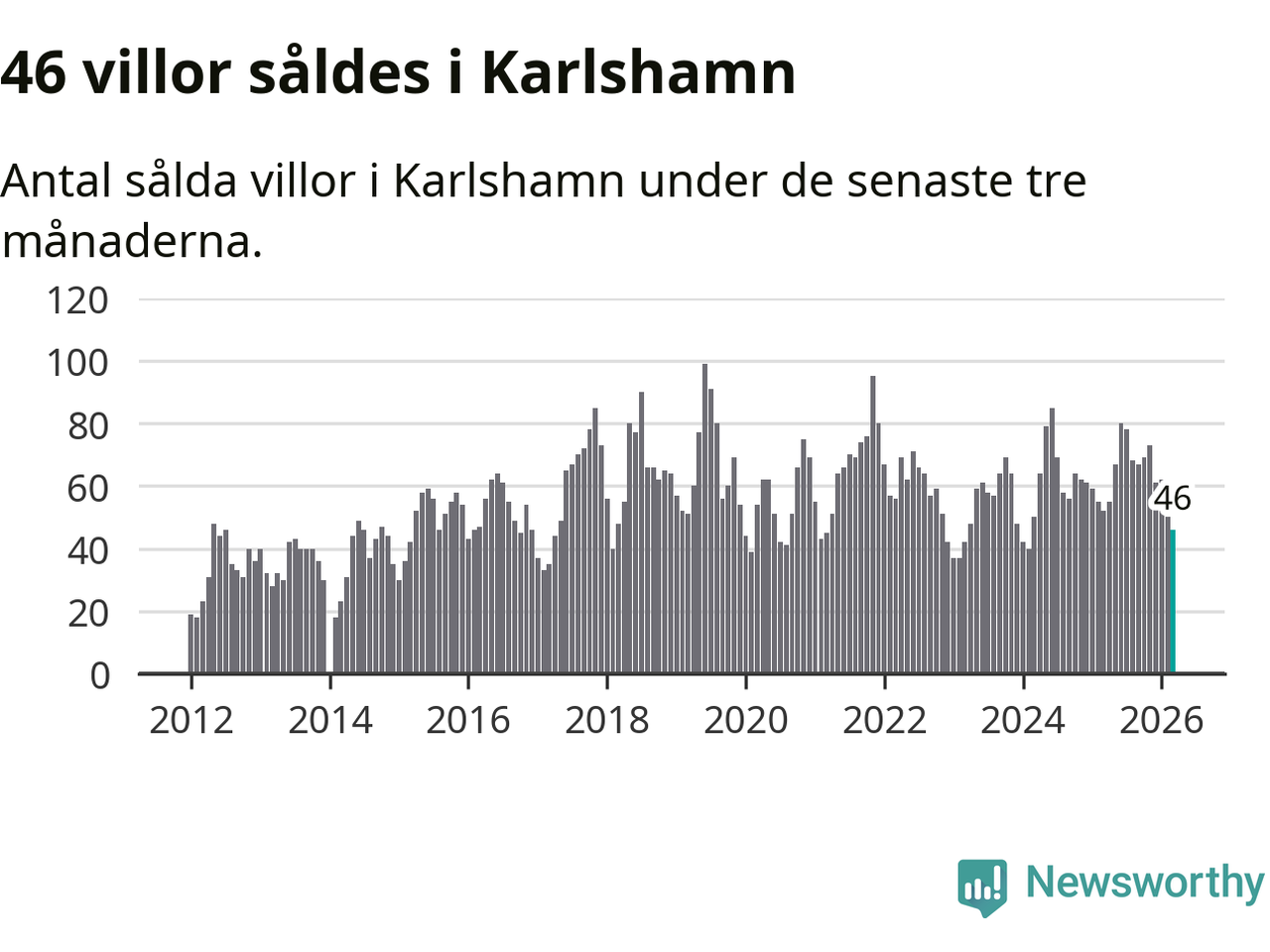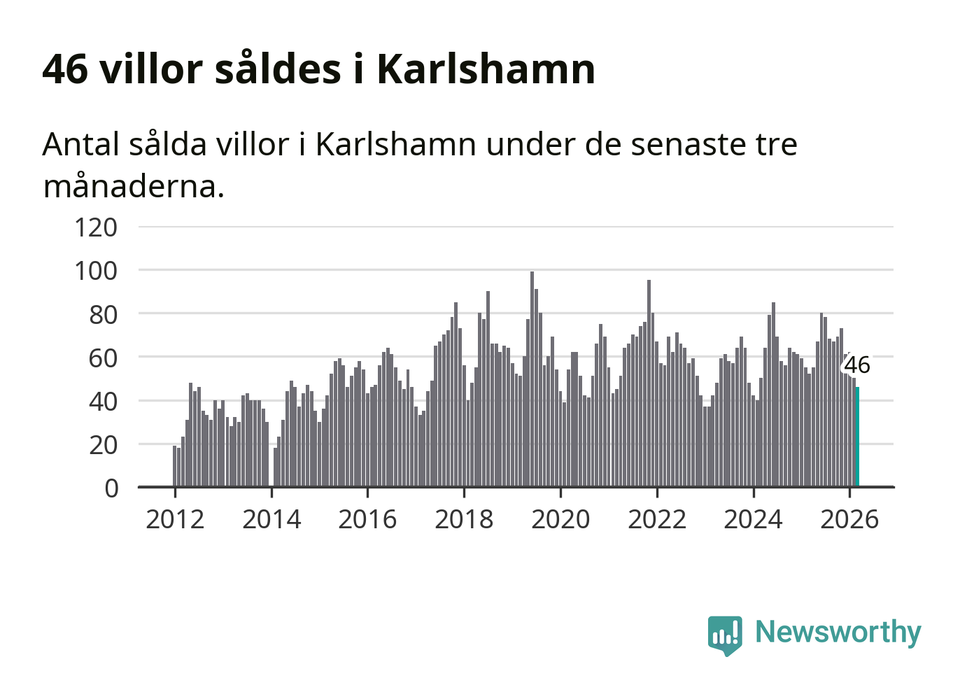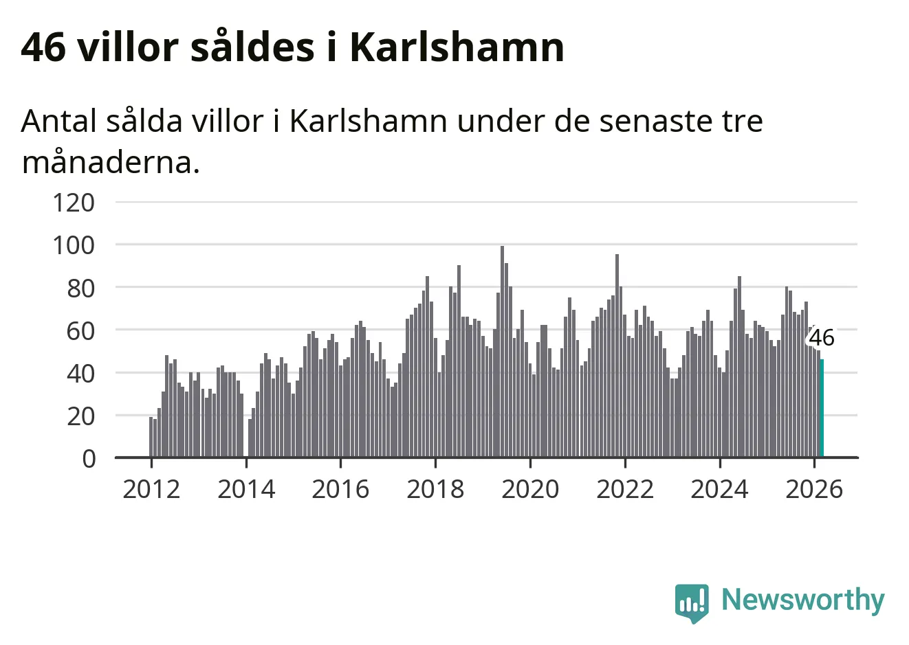 Sammanlagt såldes 46 villor i Karlshamns kommun mellan januari och mars till ett genomsnittligt pris på 1,8 miljoner kronor. I fjol gjordes 52 affärer vid den här tiden på året.