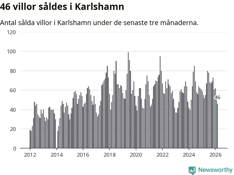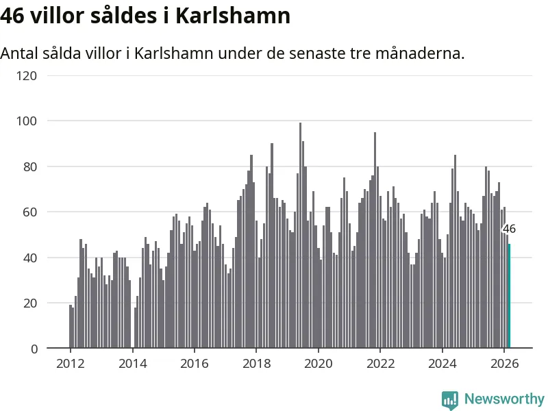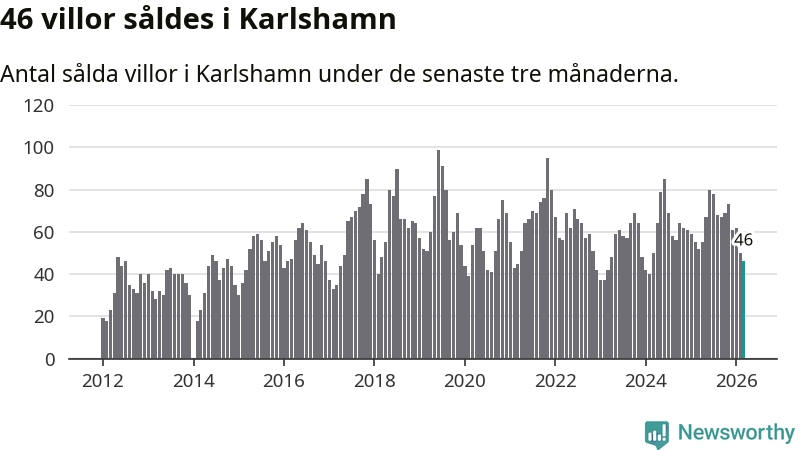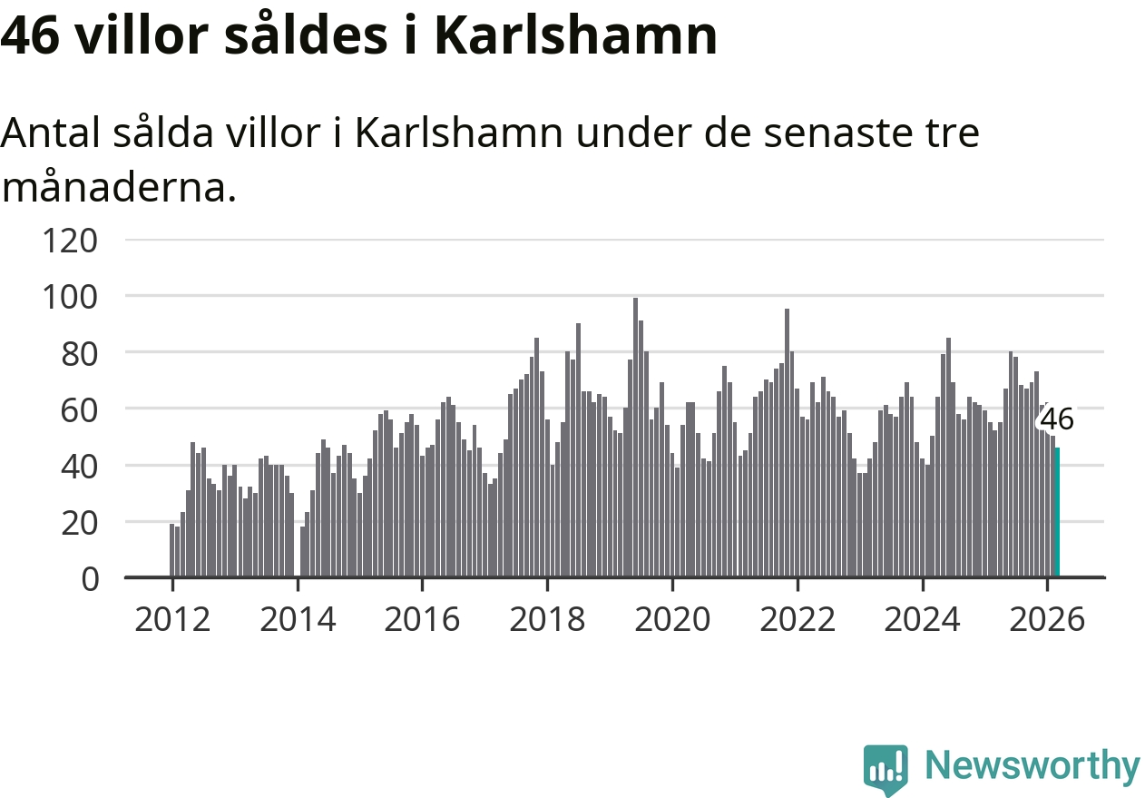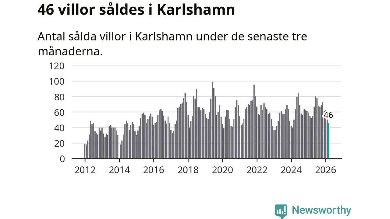 Sammanlagt såldes 46 villor i Karlshamns kommun mellan januari och mars till ett genomsnittligt pris på 1,8 miljoner kronor. I fjol gjordes 52 affärer vid den här tiden på året.