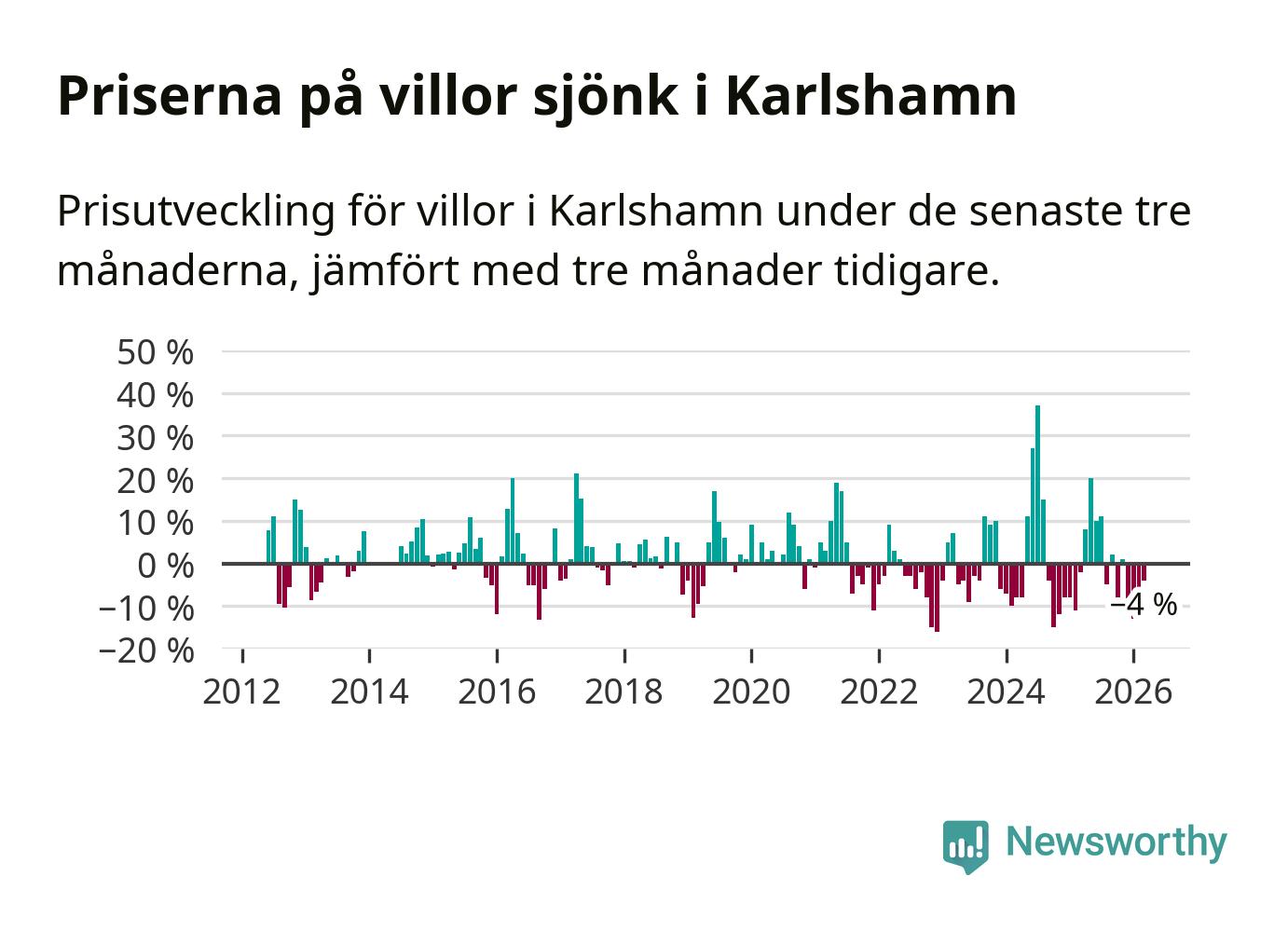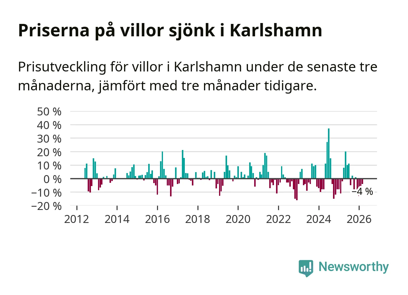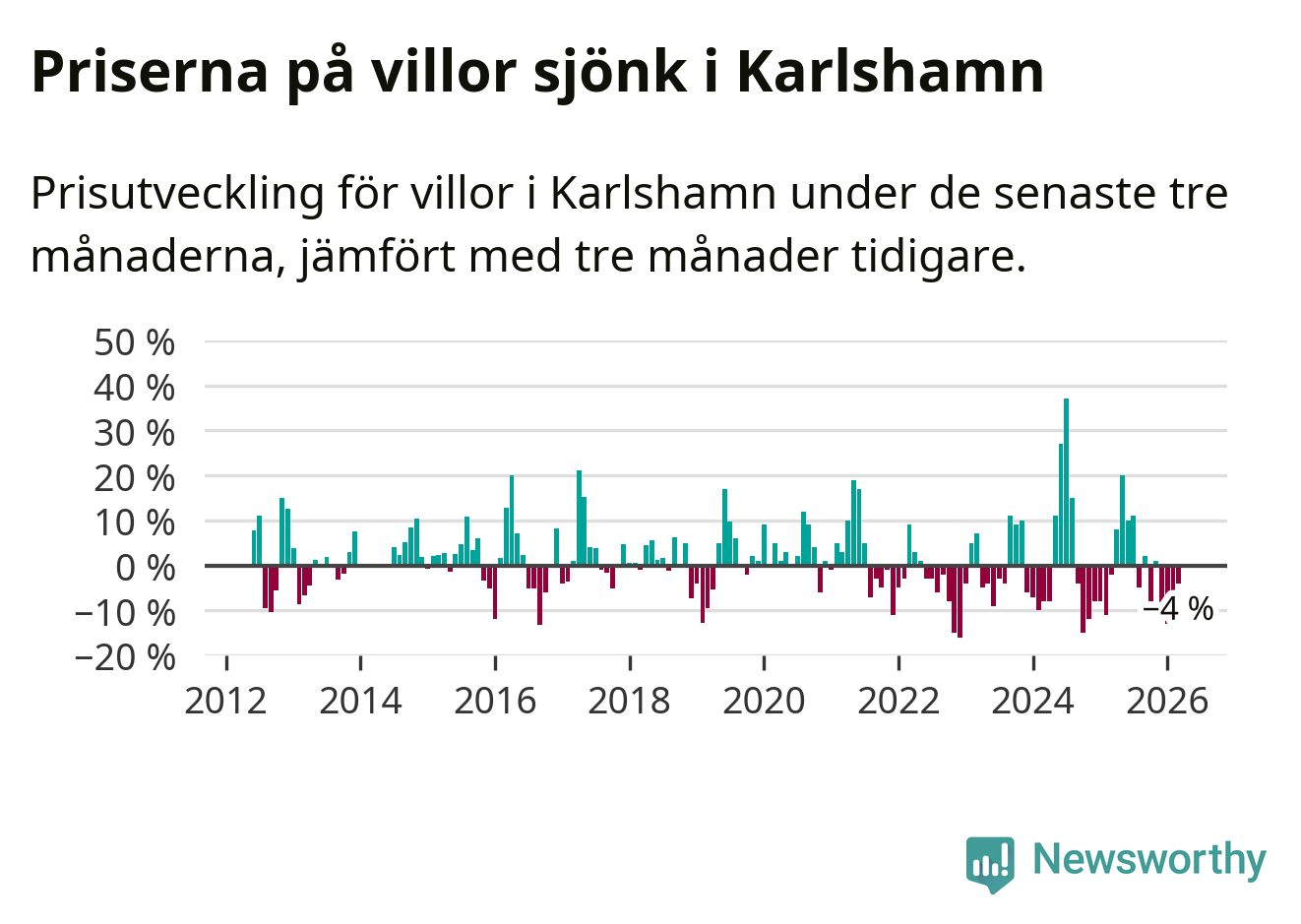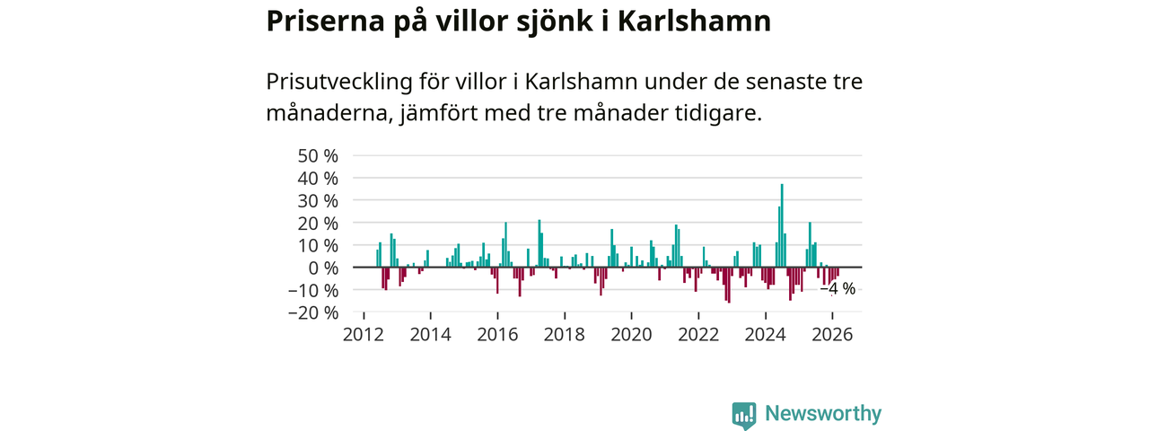 Villapriserna har gått ner i Karlshamns kommun. Medelpriset på försäljningarna under de senaste tre månaderna visar på en nedgång med 4 procent.