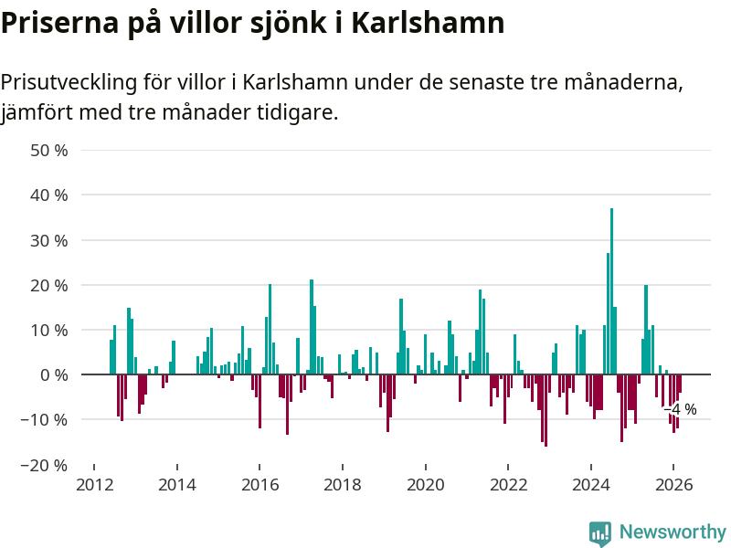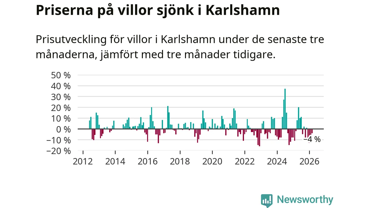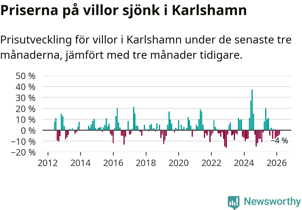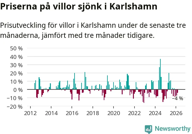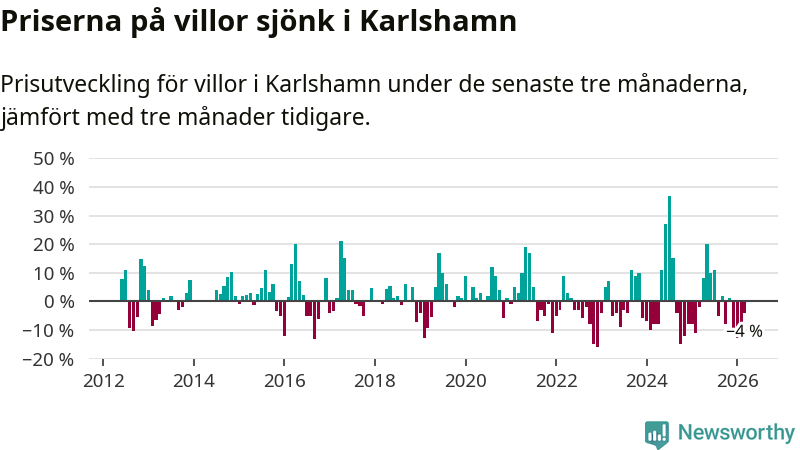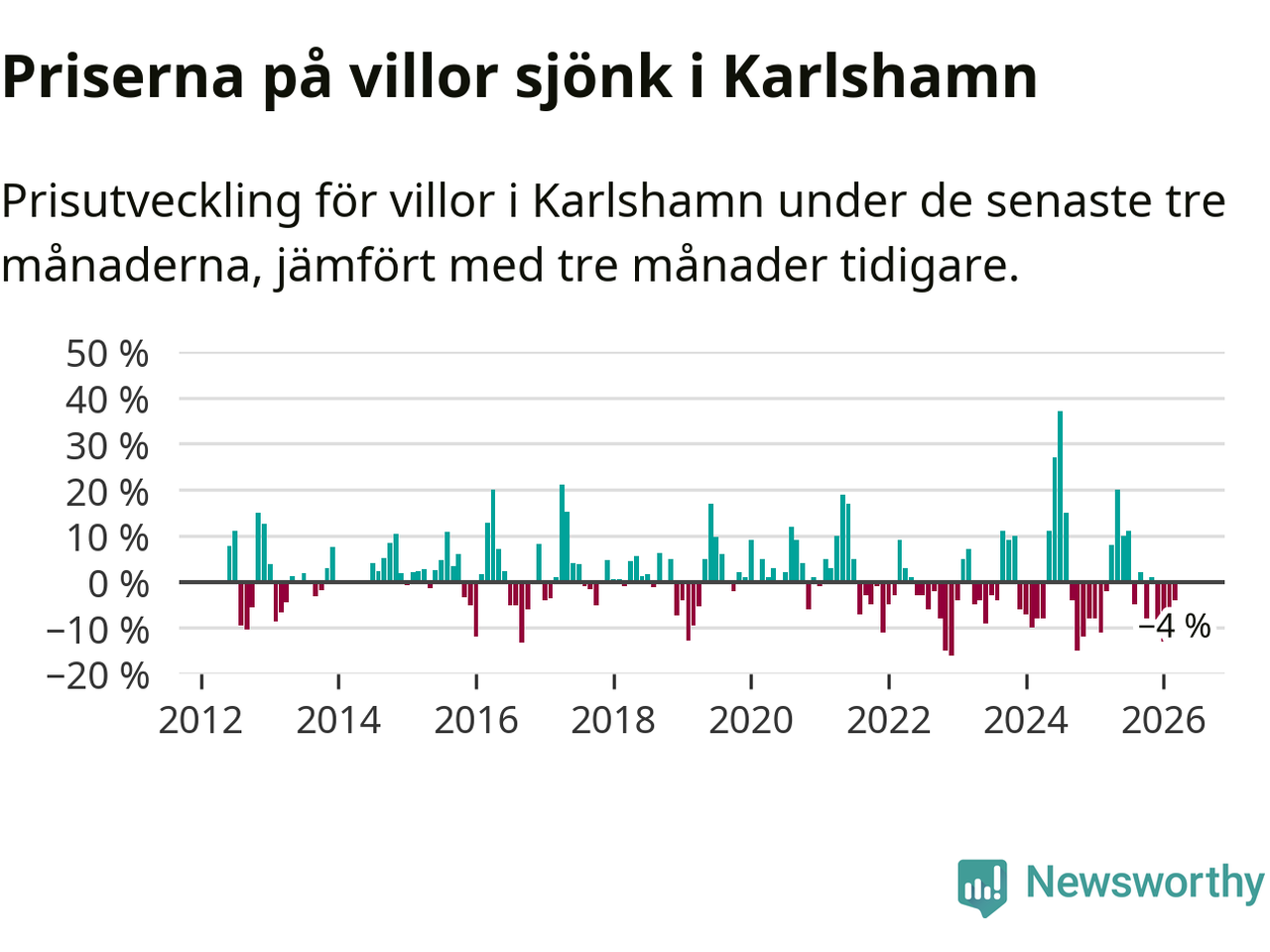Villapriserna har gått ner i Karlshamns kommun. Medelpriset på försäljningarna under de senaste tre månaderna visar på en nedgång med 4 procent.