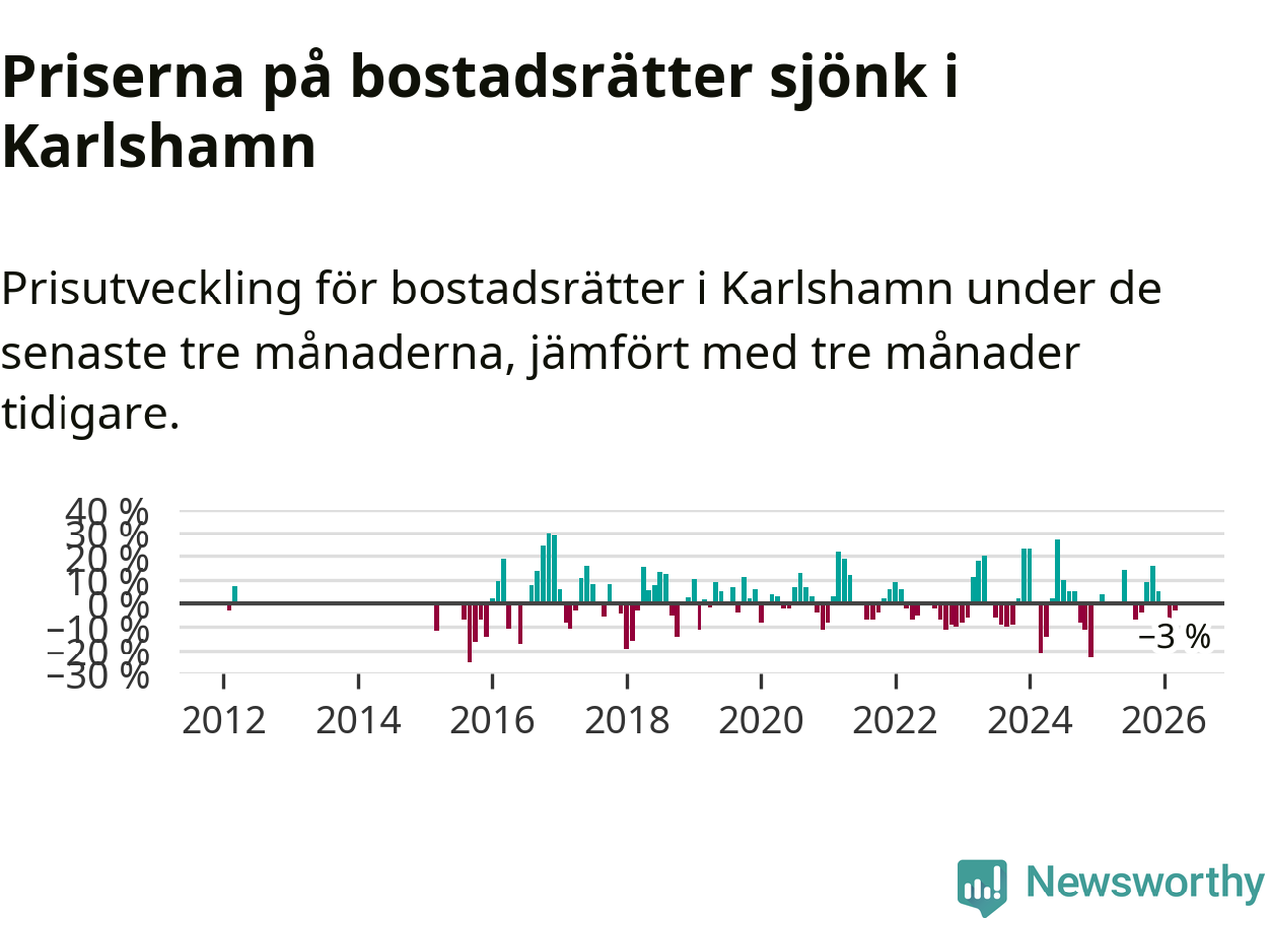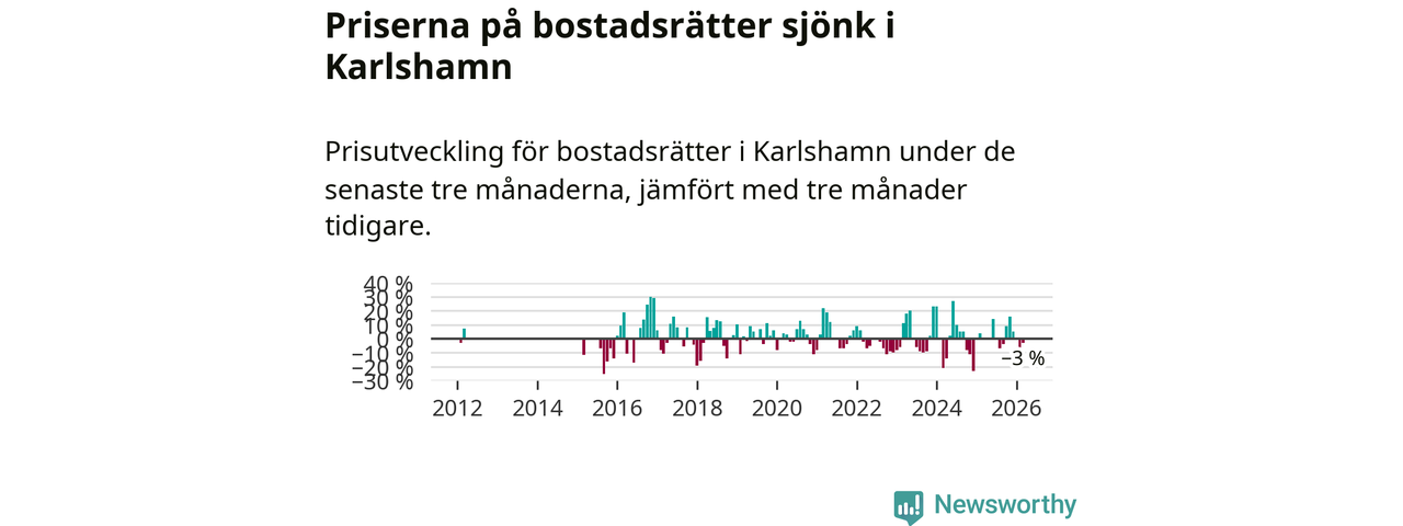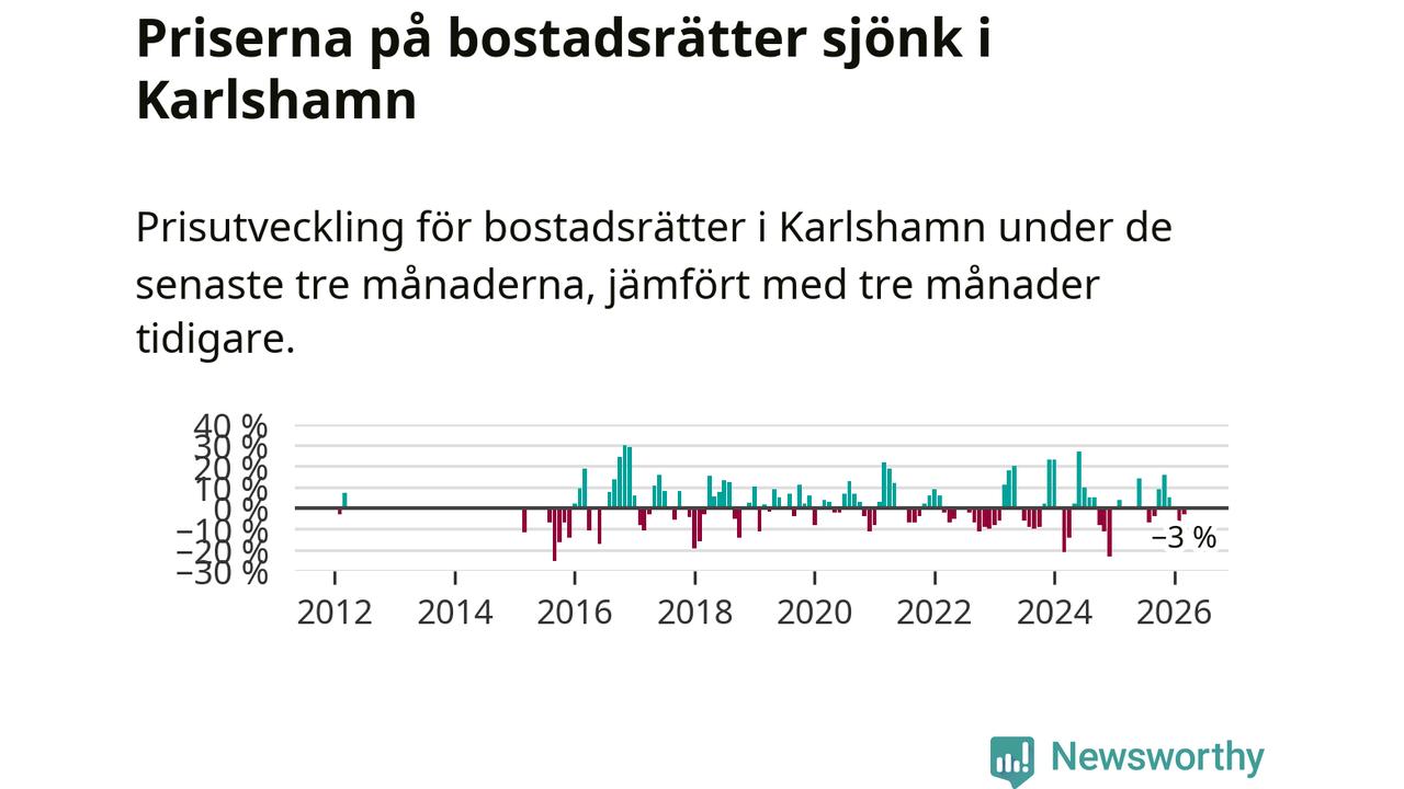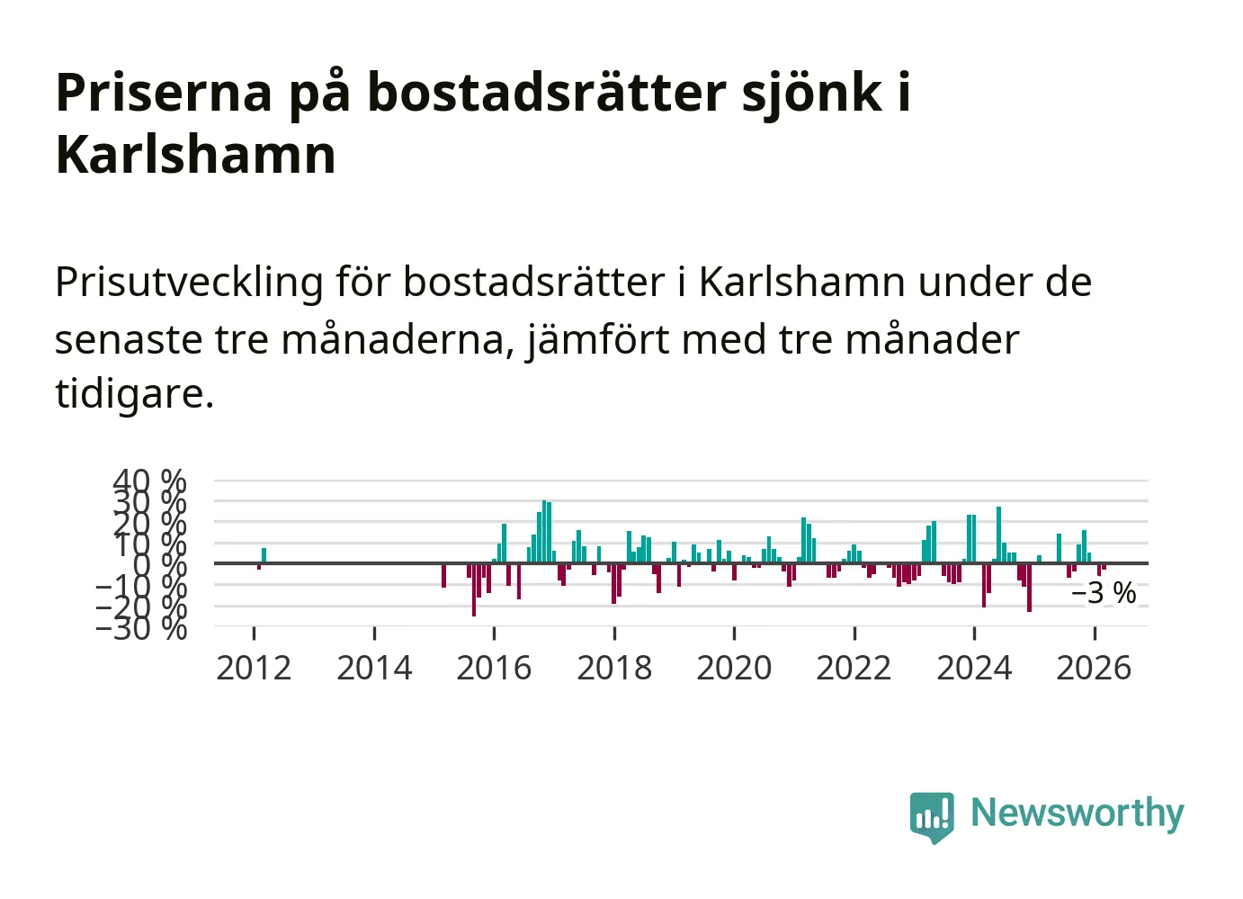 Priserna på bostadsrätter har gått ner i Karlshamns kommun. Medelpriset på försäljningarna under de senaste tre månaderna visar på en nedgång med 3 procent.