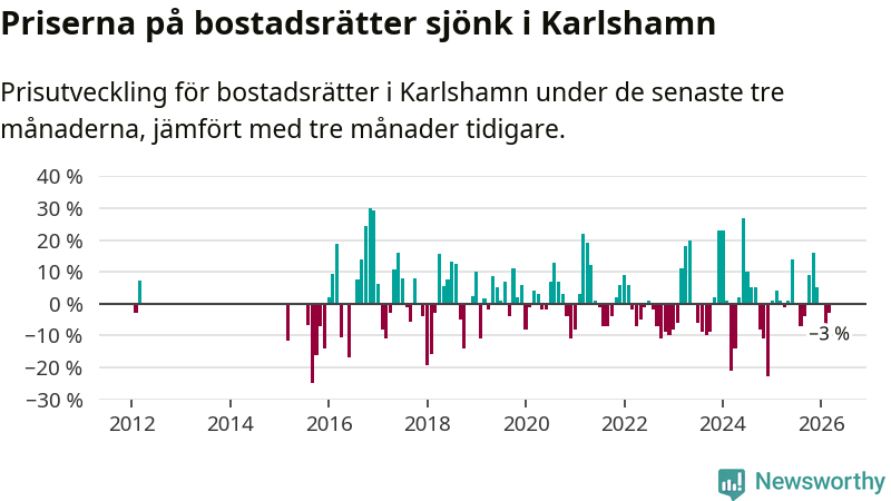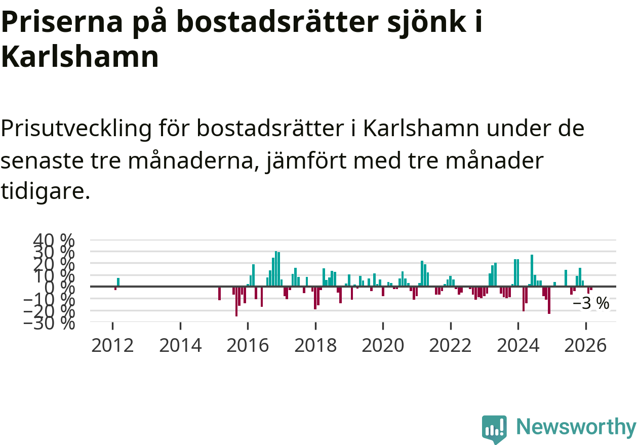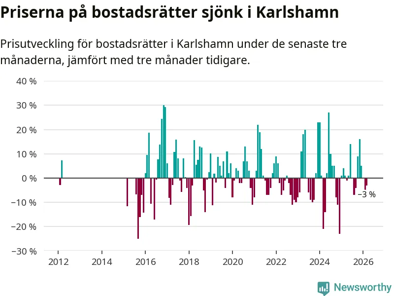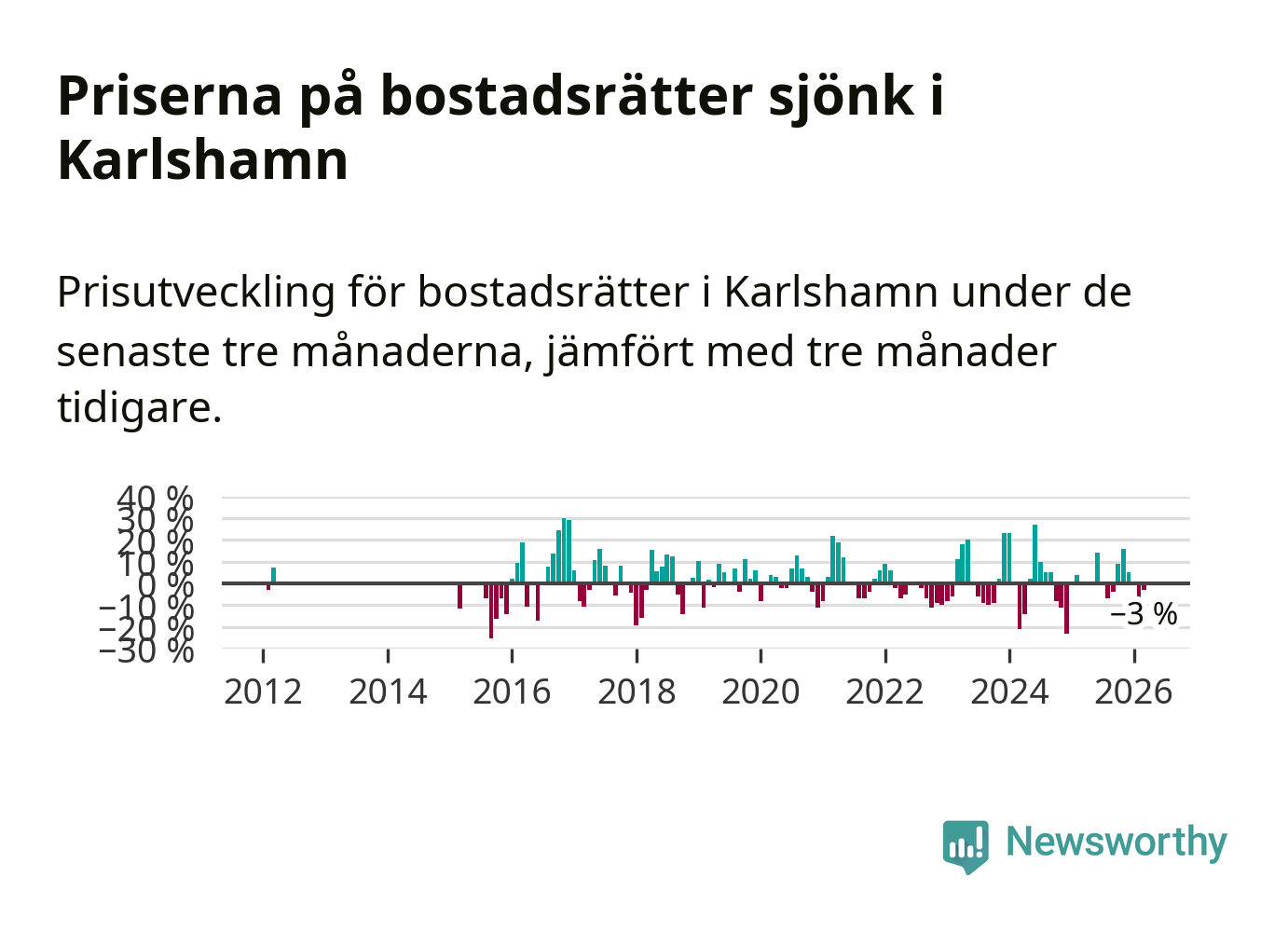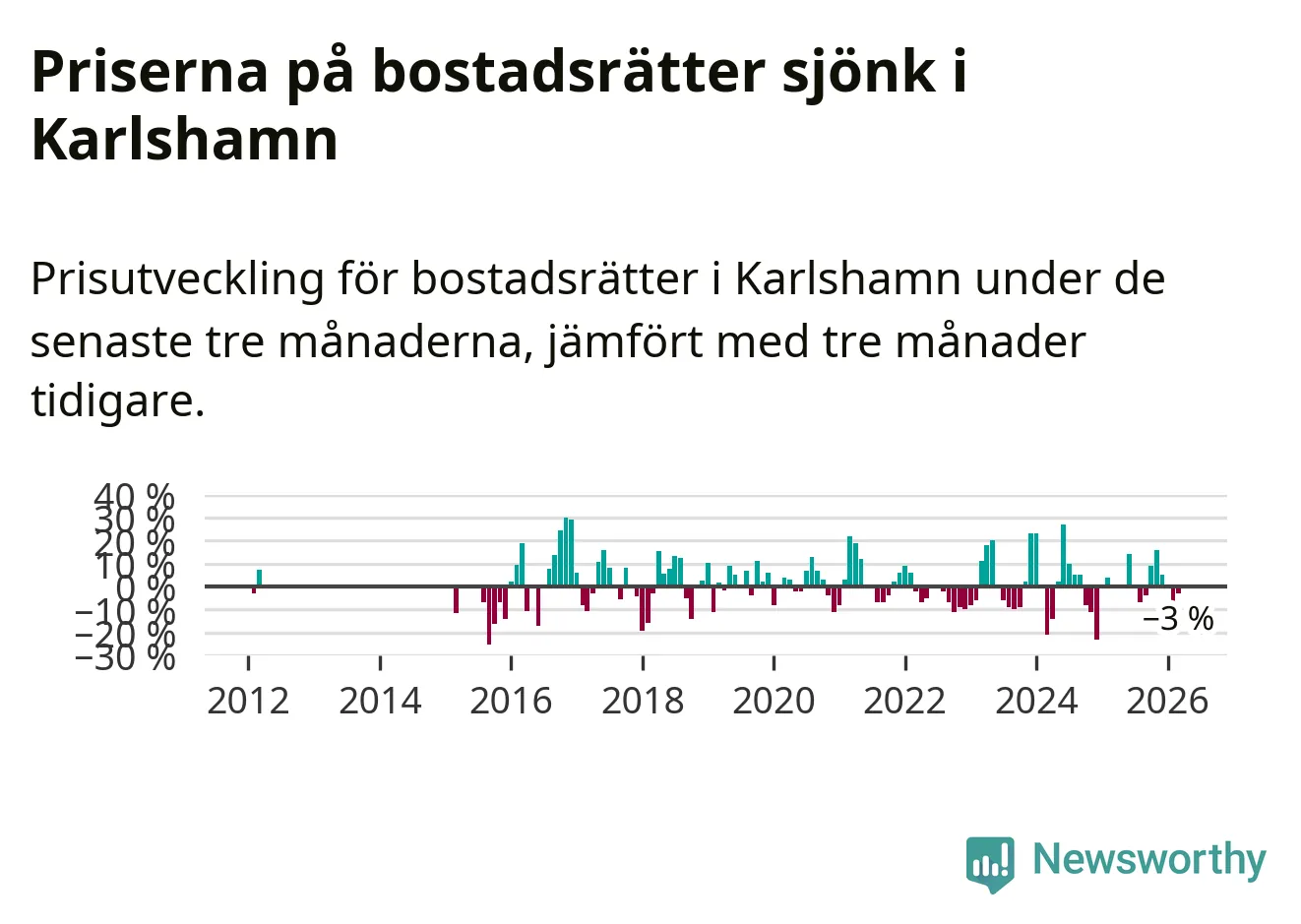 Priserna på bostadsrätter har gått ner i Karlshamns kommun. Medelpriset på försäljningarna under de senaste tre månaderna visar på en nedgång med 3 procent.