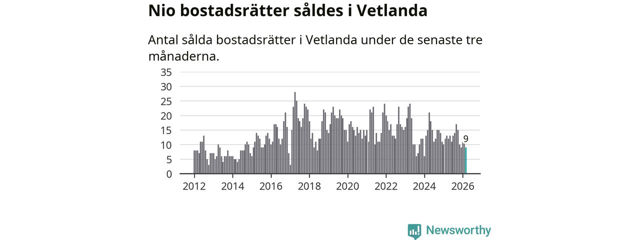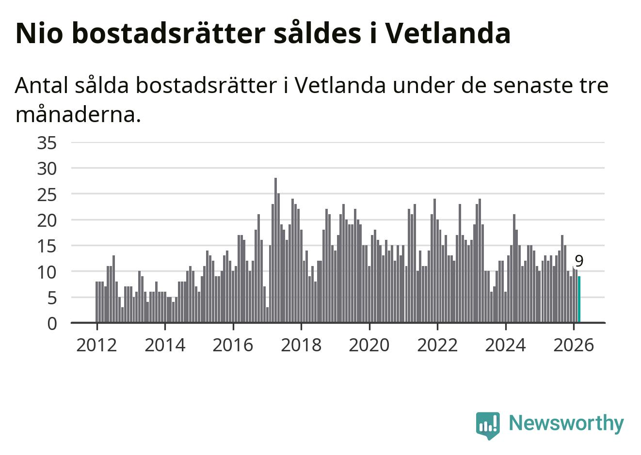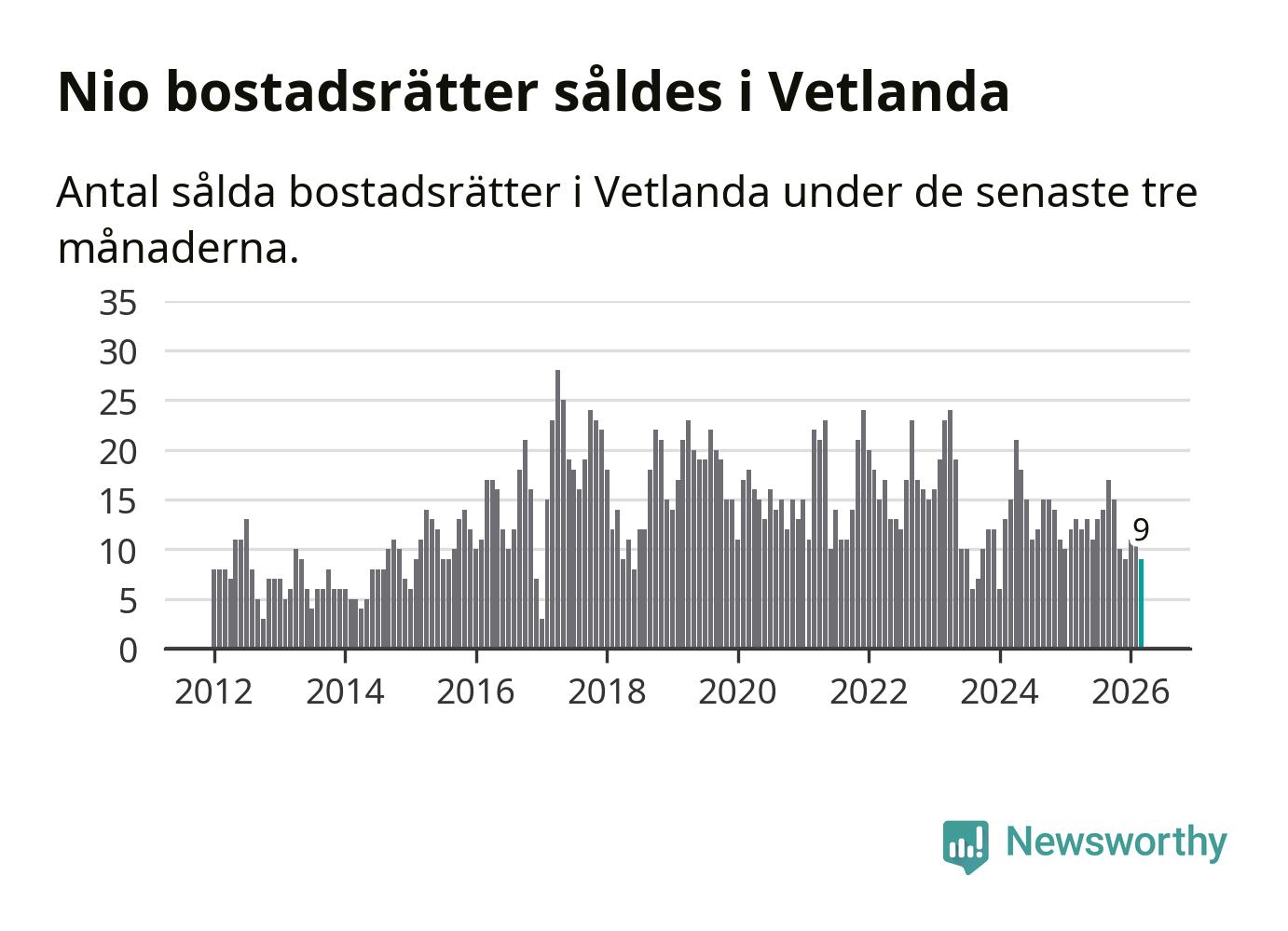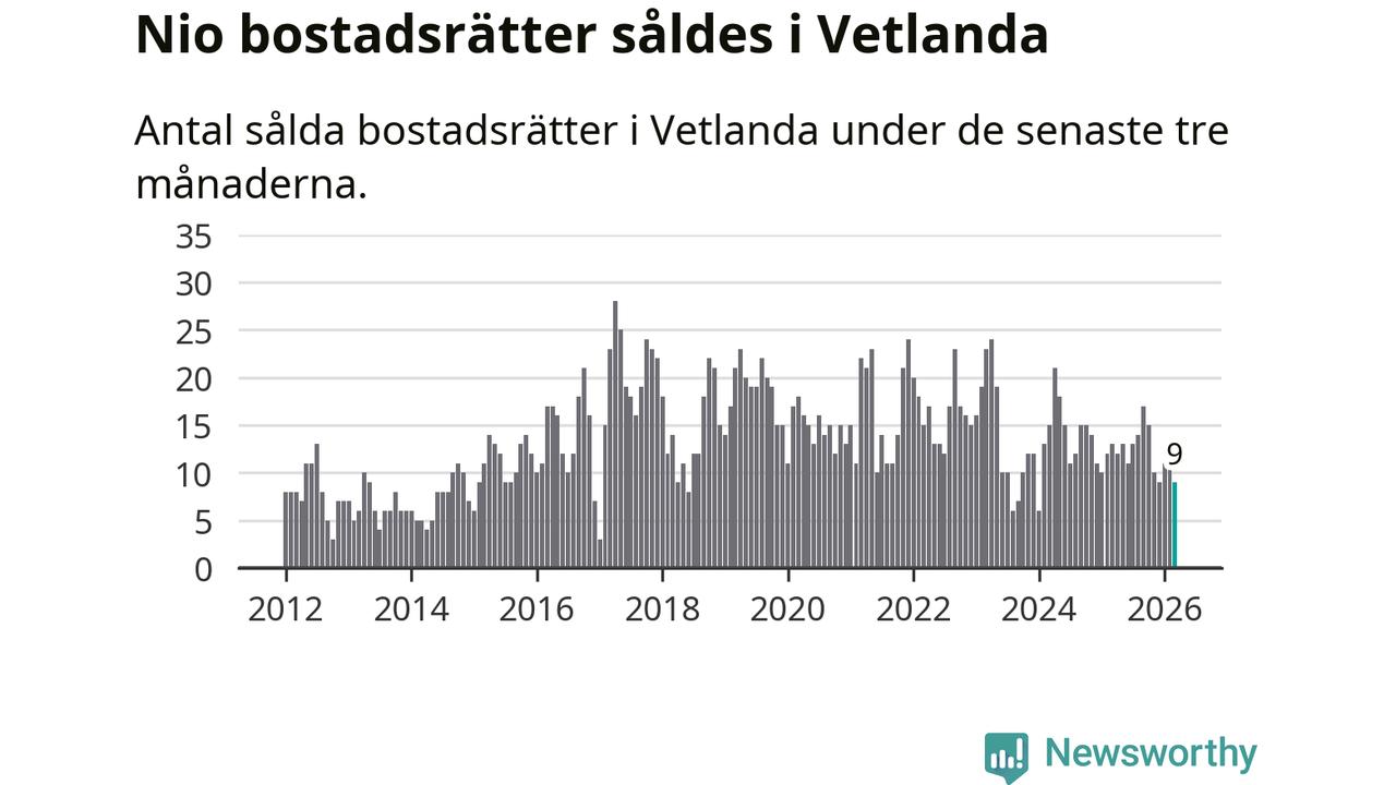 Mellan januari och mars gjordes sammanlagt nio affärer med bostadsrätter i Vetlanda kommun. Det kan jämföras med 13 vid motsvarande tid i fjol.