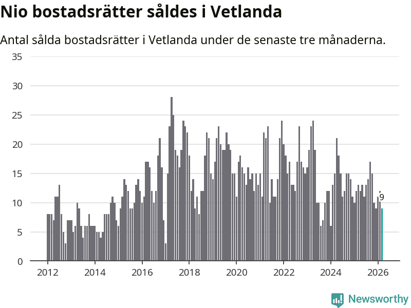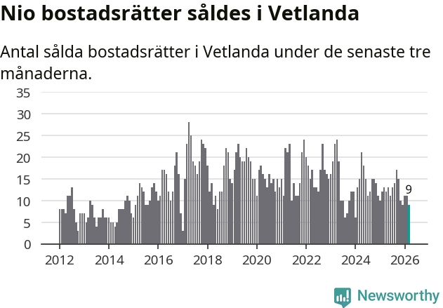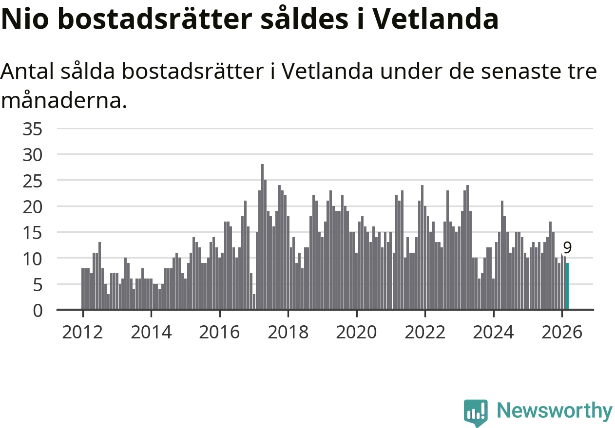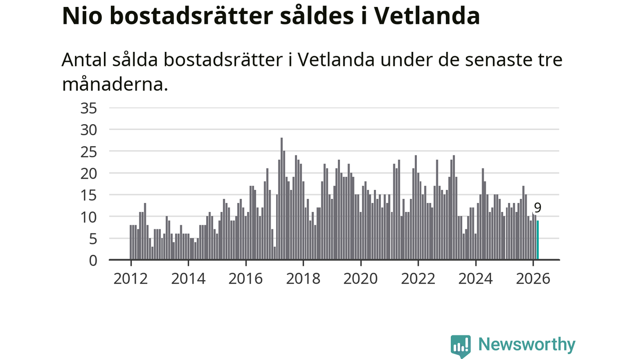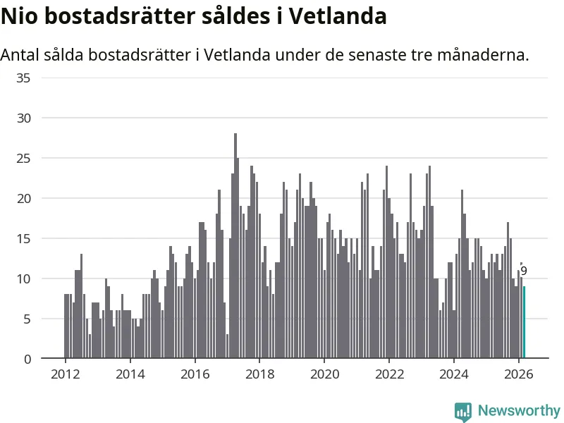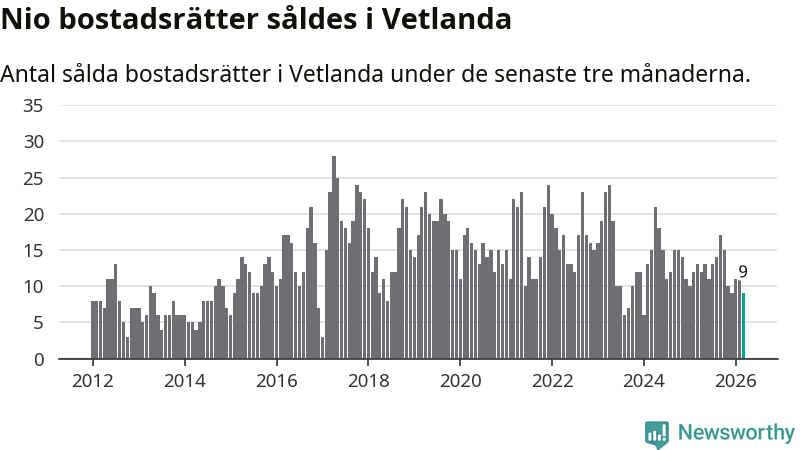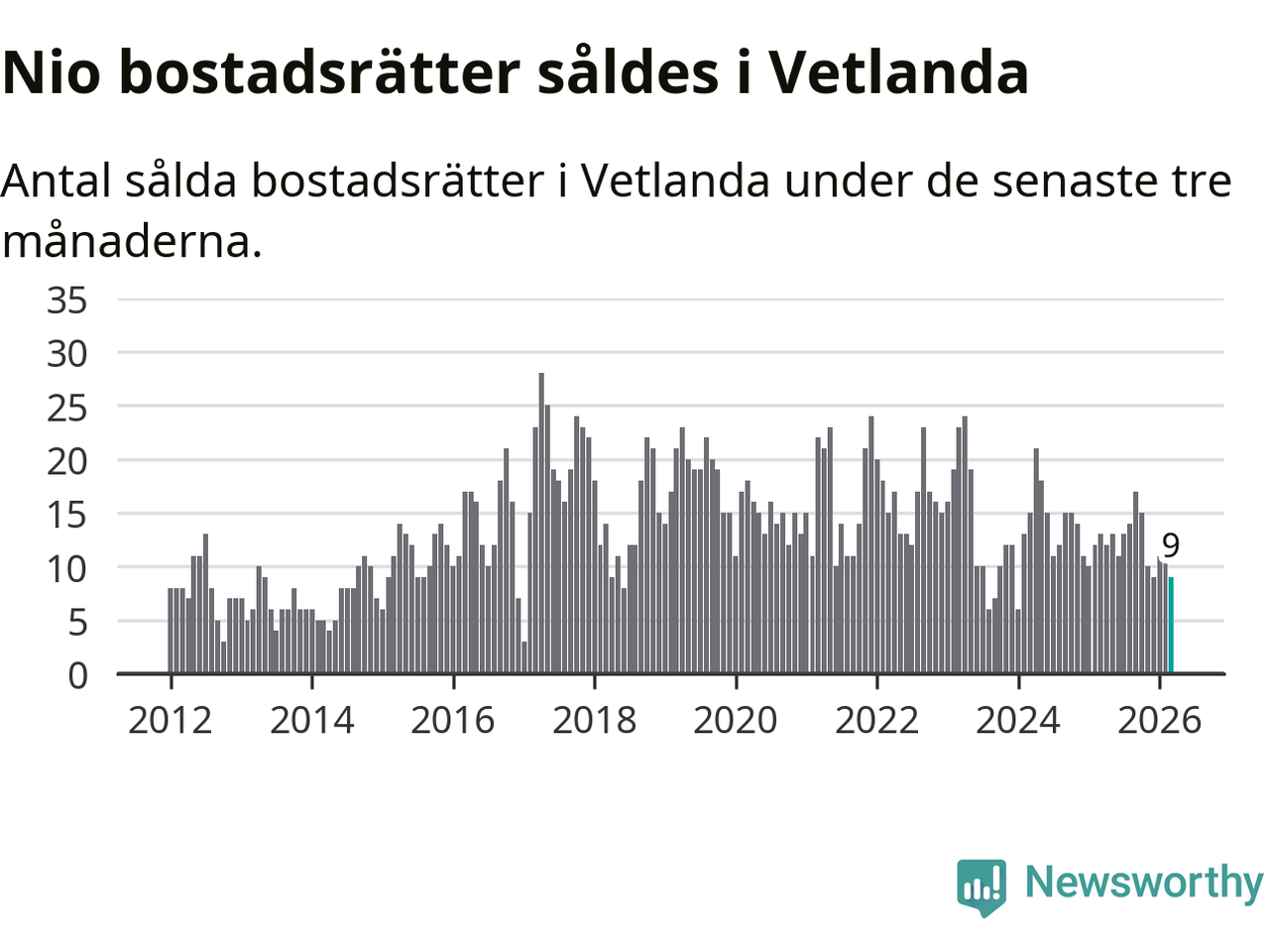 Mellan januari och mars gjordes sammanlagt nio affärer med bostadsrätter i Vetlanda kommun. Det kan jämföras med 13 vid motsvarande tid i fjol.
