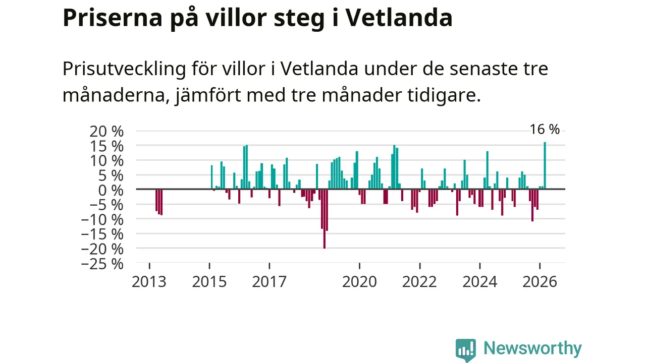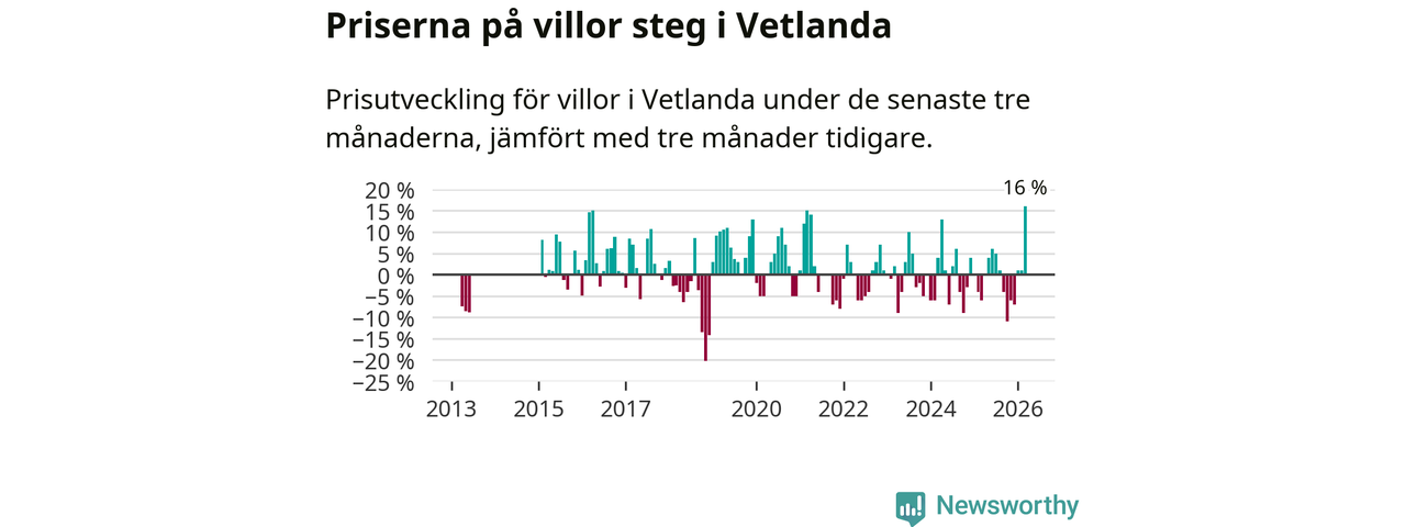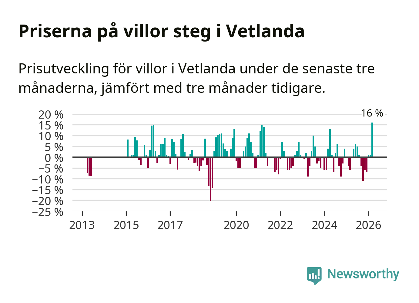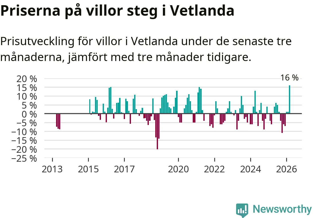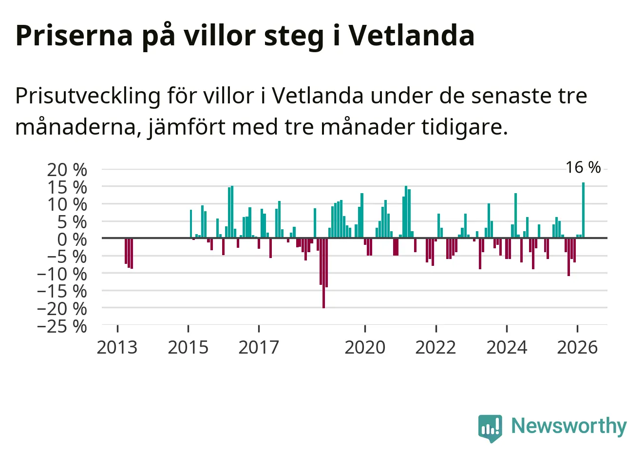 Villapriserna steg med 16 procent i Vetlanda kommun under de senaste tre månaderna. Det är den starkaste prisutvecklingen sedan 2013.