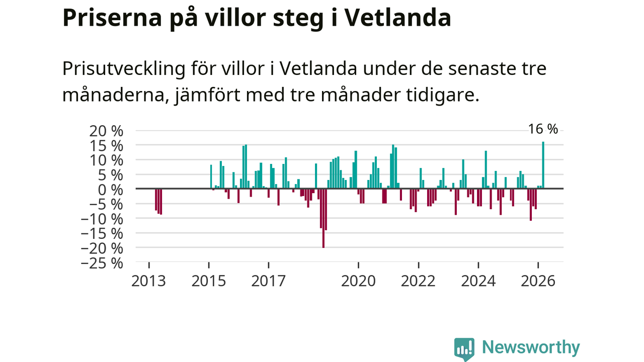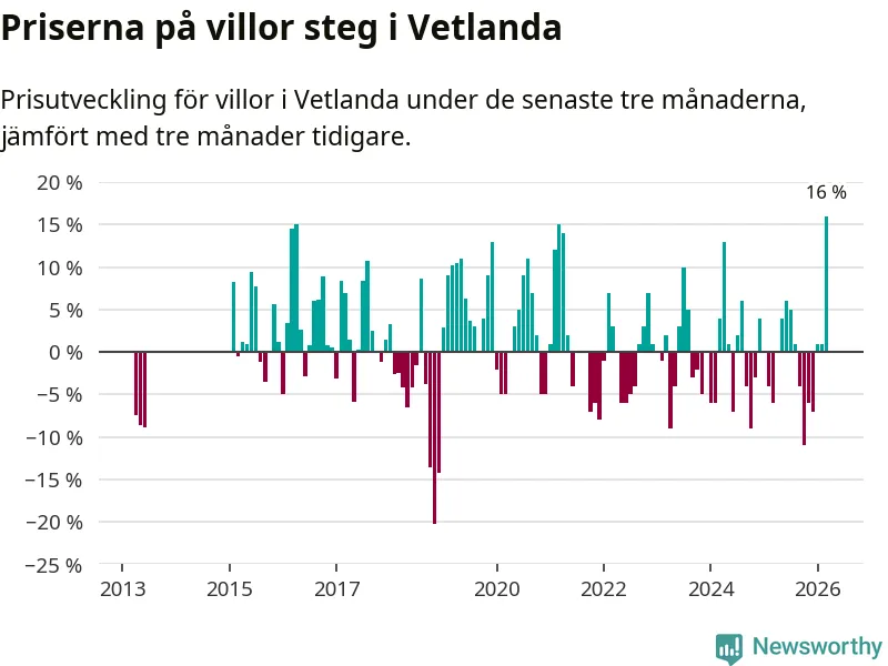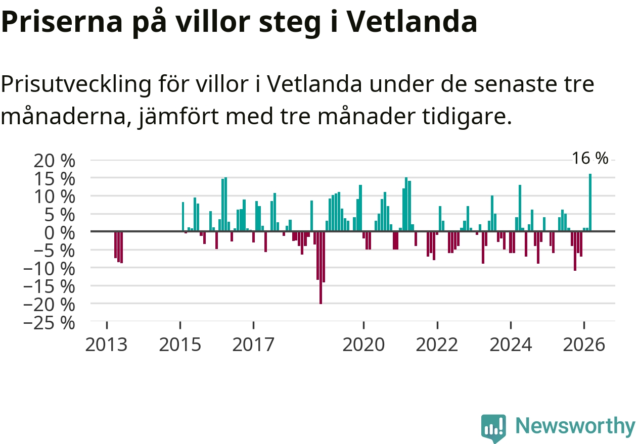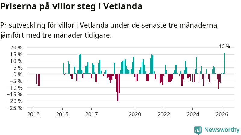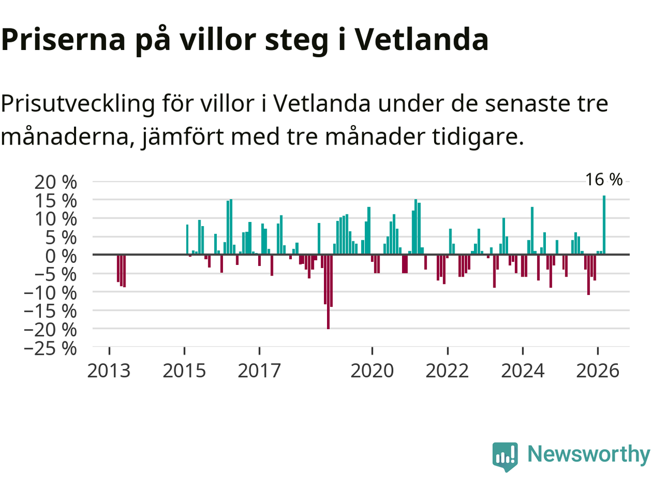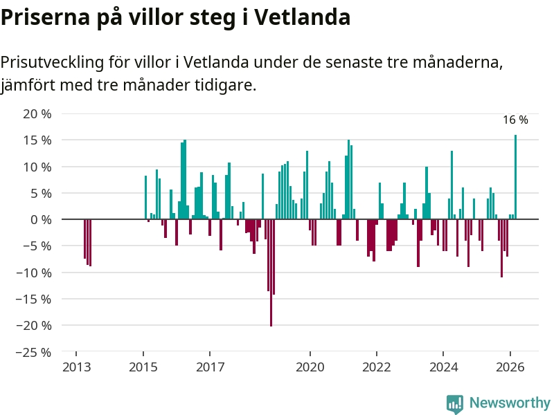 Villapriserna steg med 16 procent i Vetlanda kommun under de senaste tre månaderna. Det är den starkaste prisutvecklingen sedan 2013.