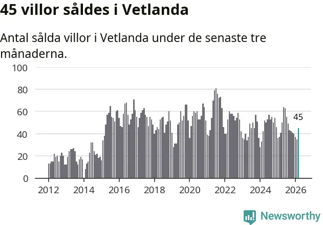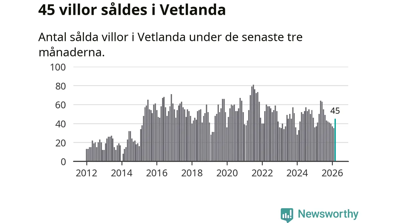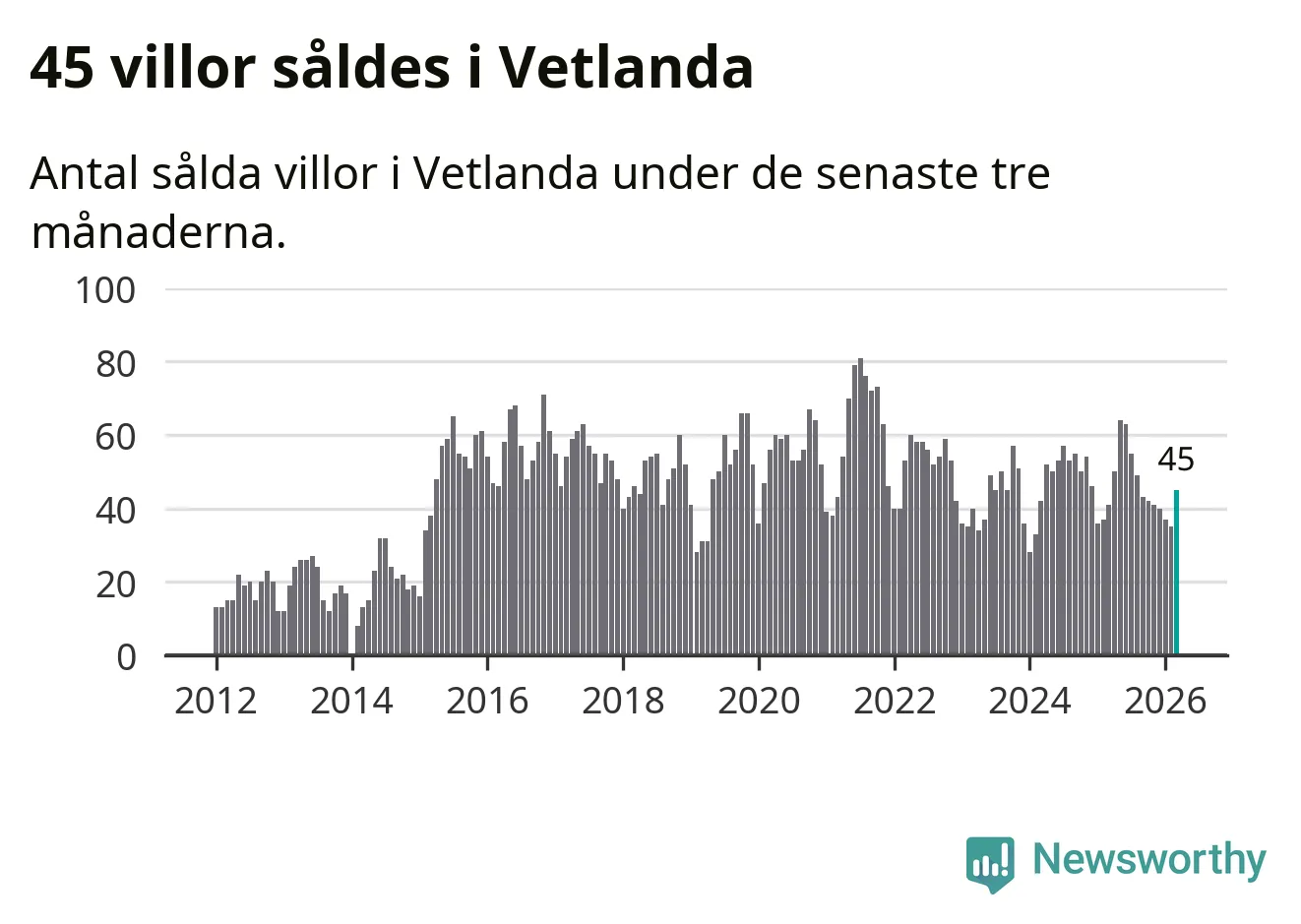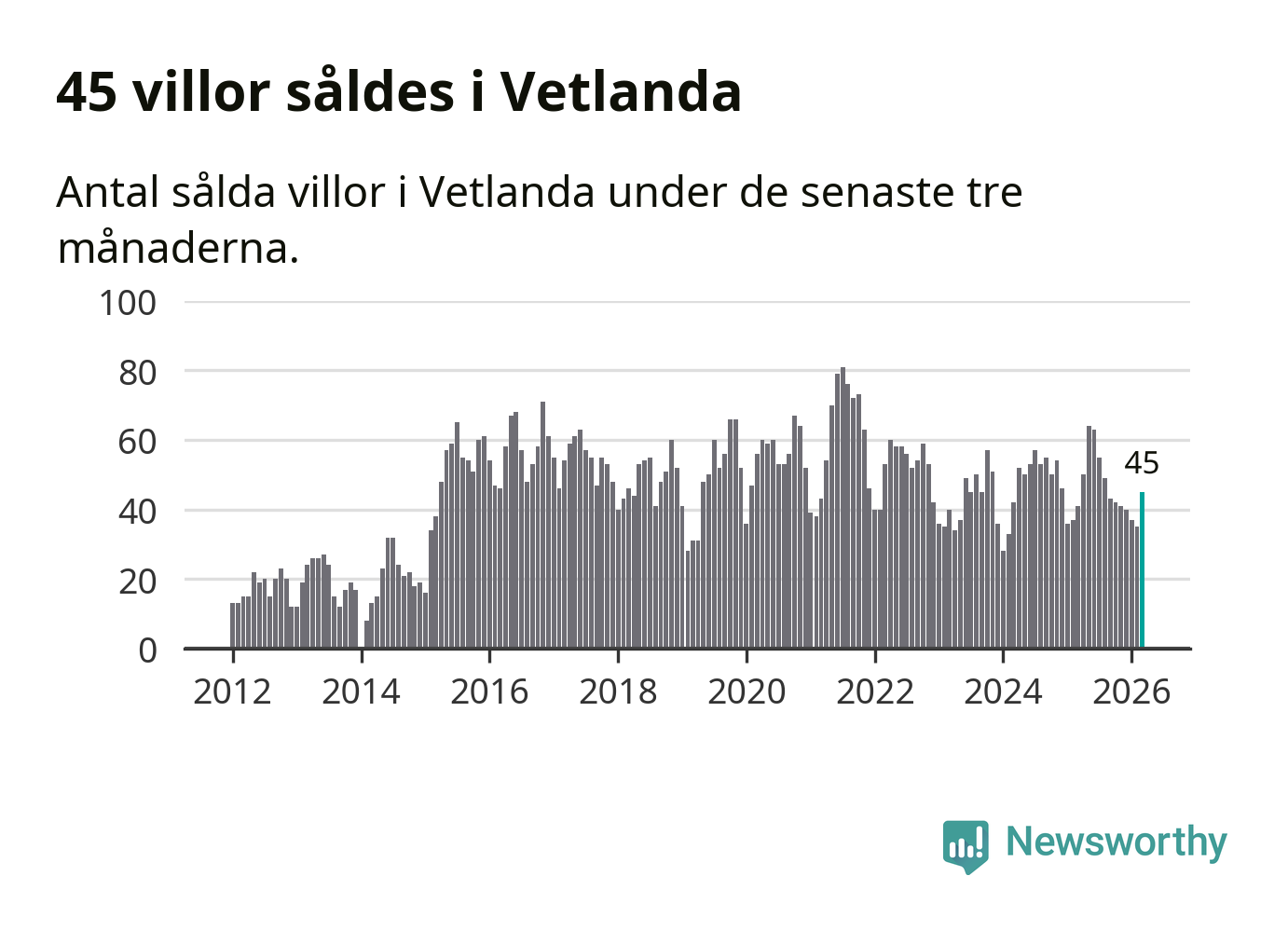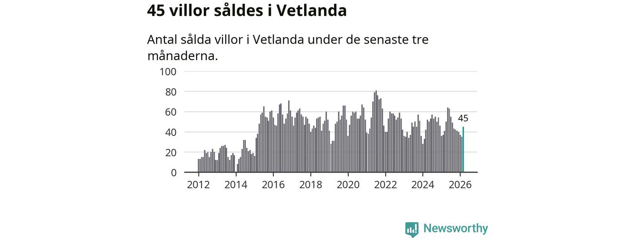 Sammanlagt såldes 45 villor i Vetlanda kommun mellan januari och mars till ett genomsnittligt pris på 1,6 miljoner kronor. I fjol gjordes 41 affärer vid den här tiden på året.