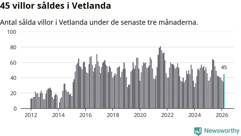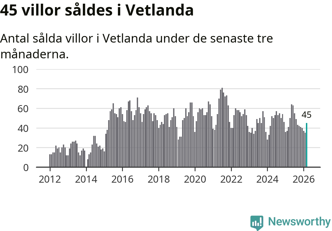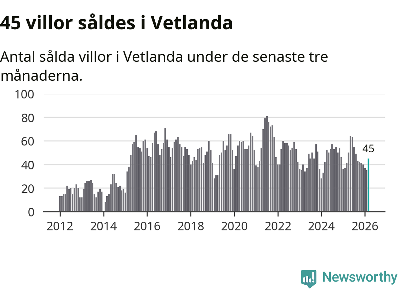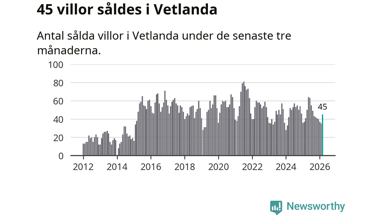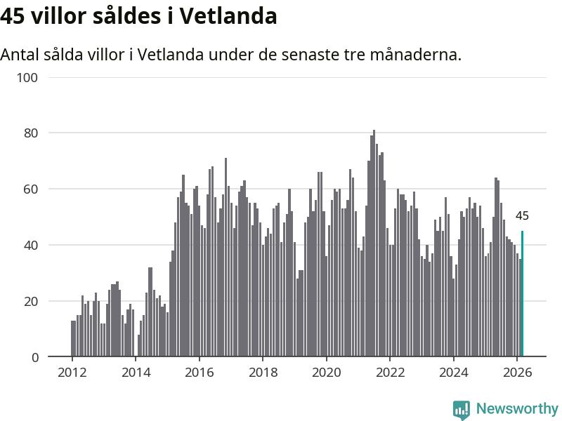 Sammanlagt såldes 45 villor i Vetlanda kommun mellan januari och mars till ett genomsnittligt pris på 1,6 miljoner kronor. I fjol gjordes 41 affärer vid den här tiden på året.