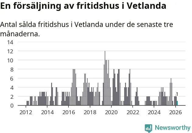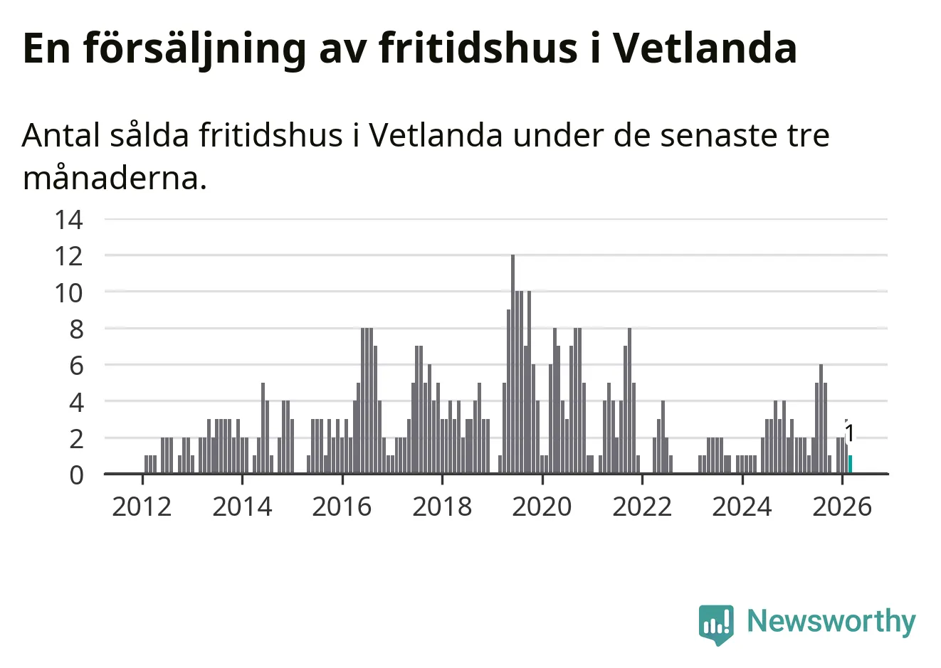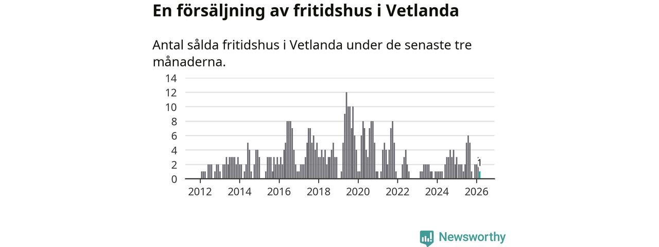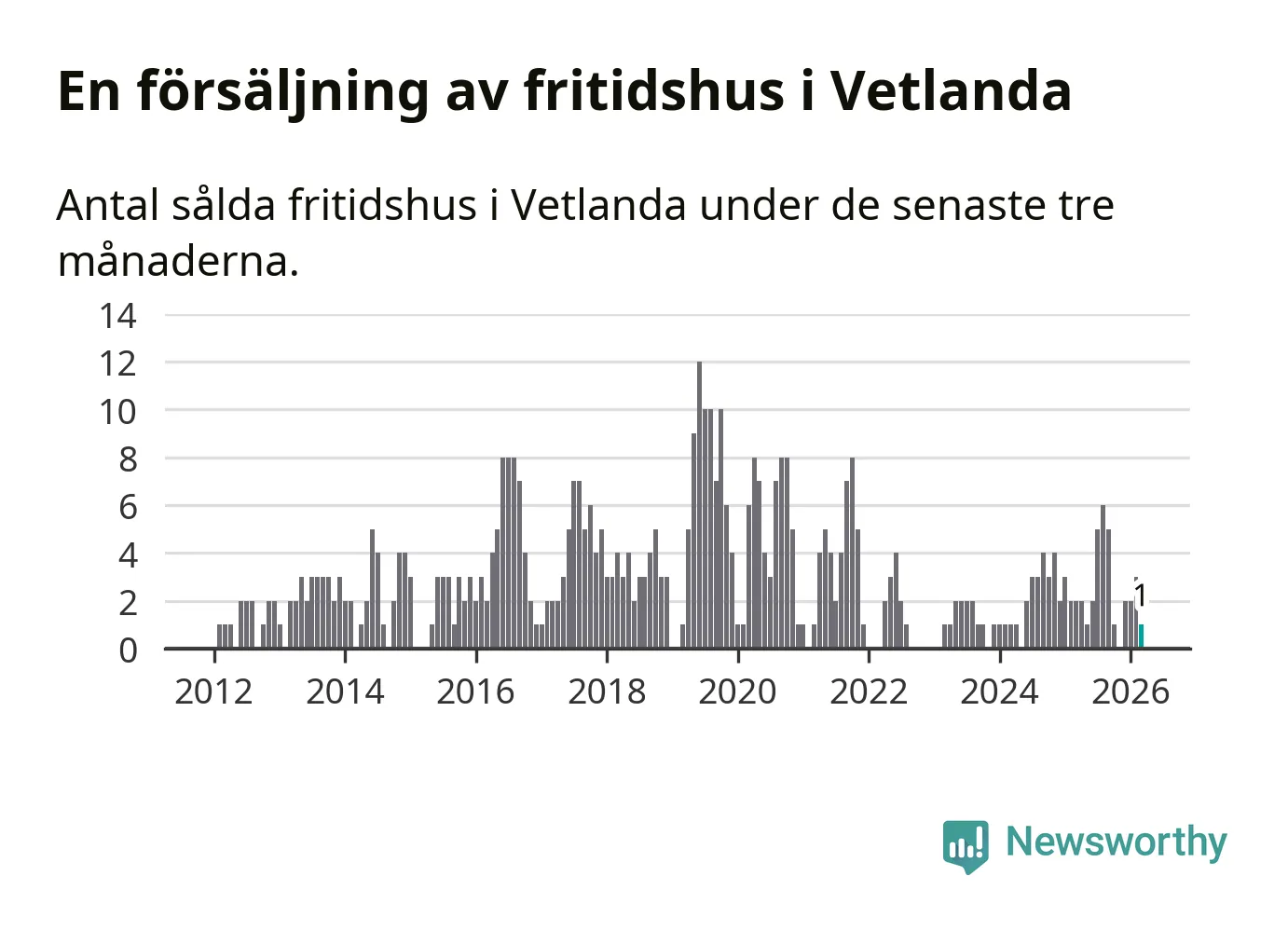 Mellan januari och mars gjordes sammanlagt en affär med fritidshus i Vetlanda kommun. Det kan jämföras med två vid motsvarande tid i fjol.