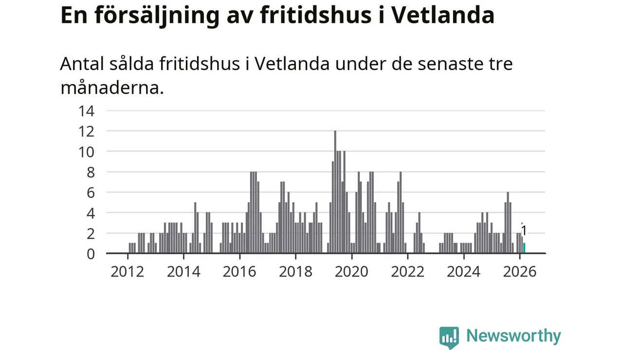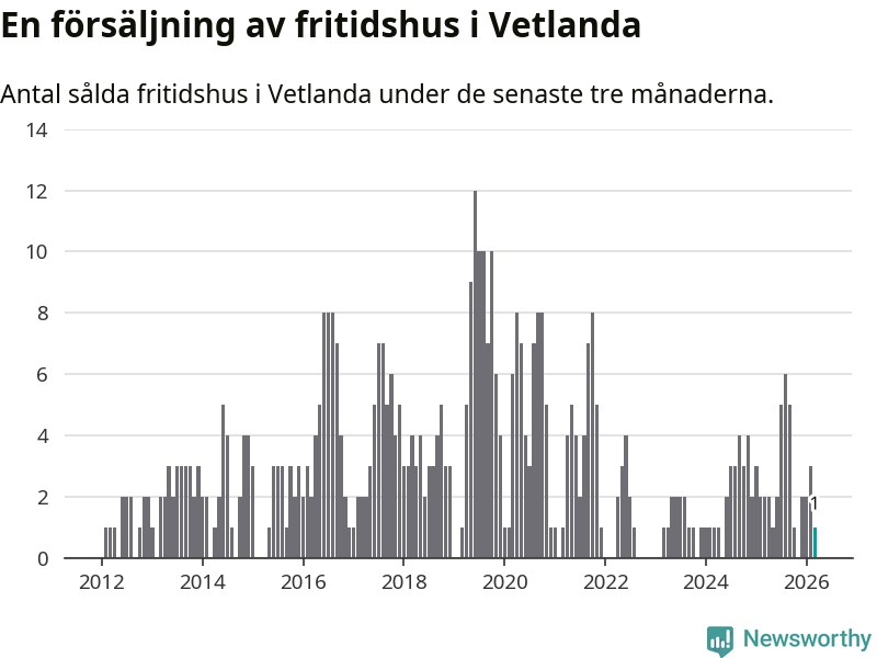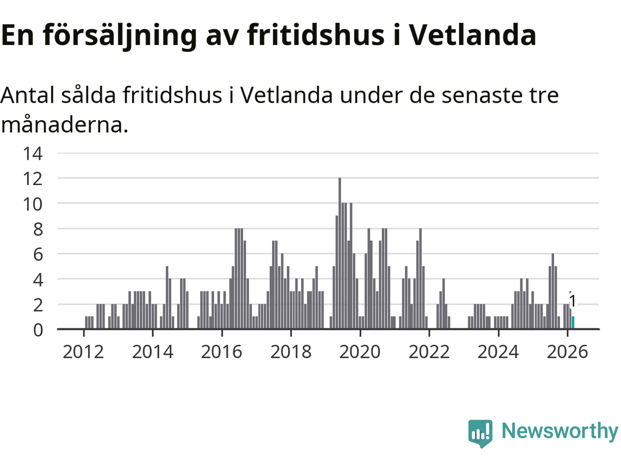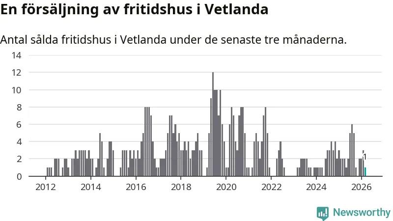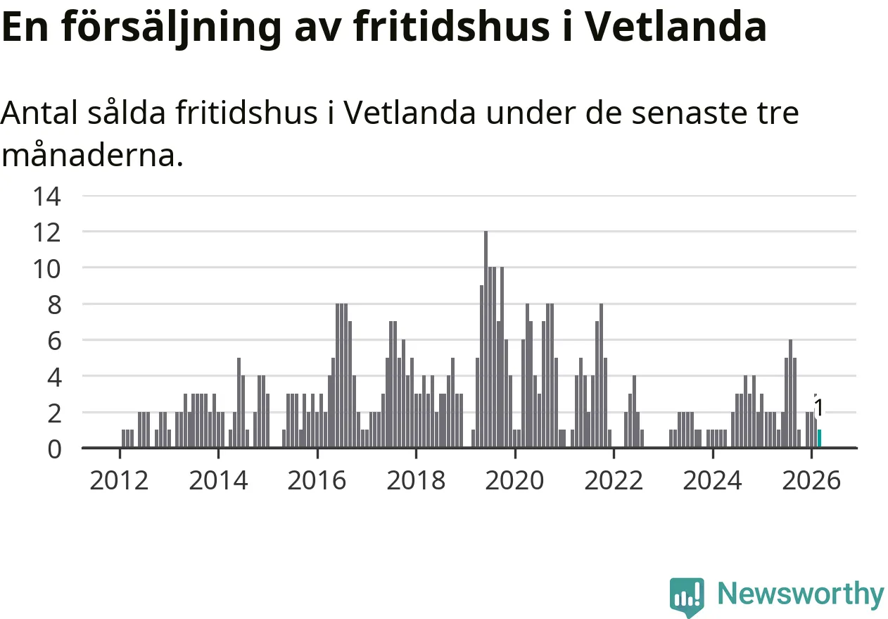 Mellan januari och mars gjordes sammanlagt en affär med fritidshus i Vetlanda kommun. Det kan jämföras med två vid motsvarande tid i fjol.