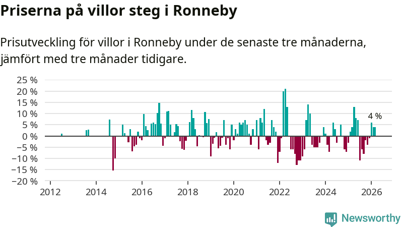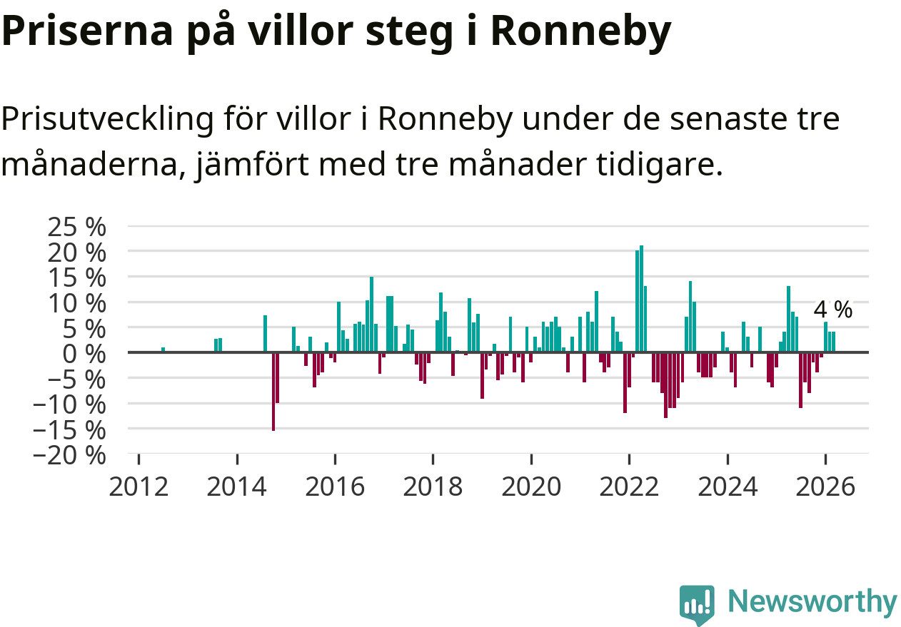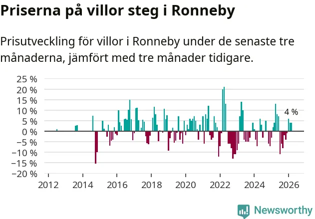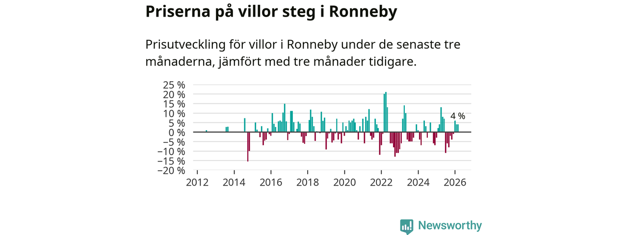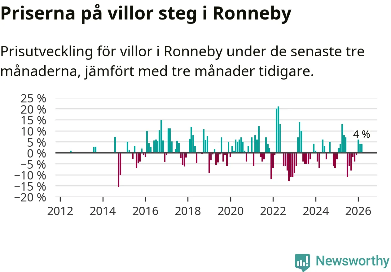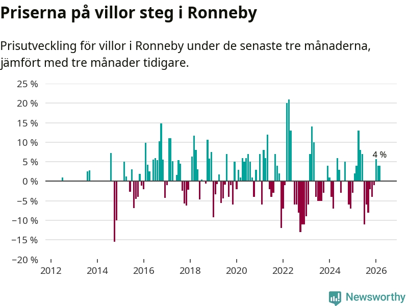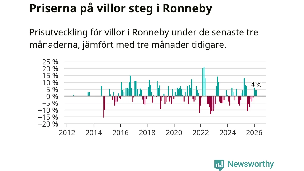 Villapriserna har gått upp i Ronneby kommun. Medelpriset på försäljningarna under de senaste tre månaderna visar på en uppgång med 4 procent.