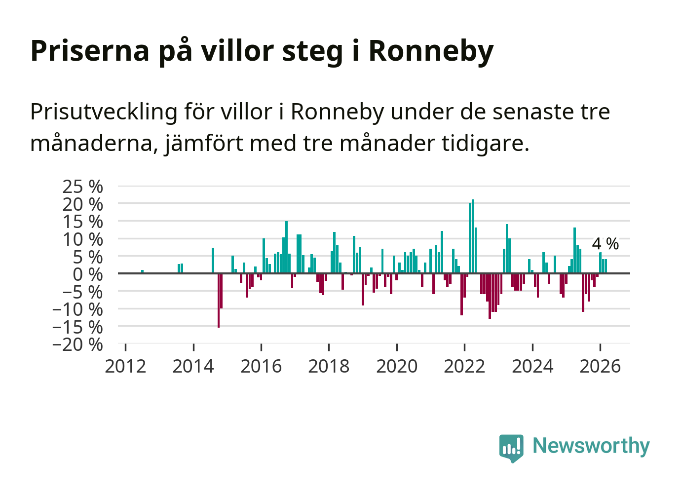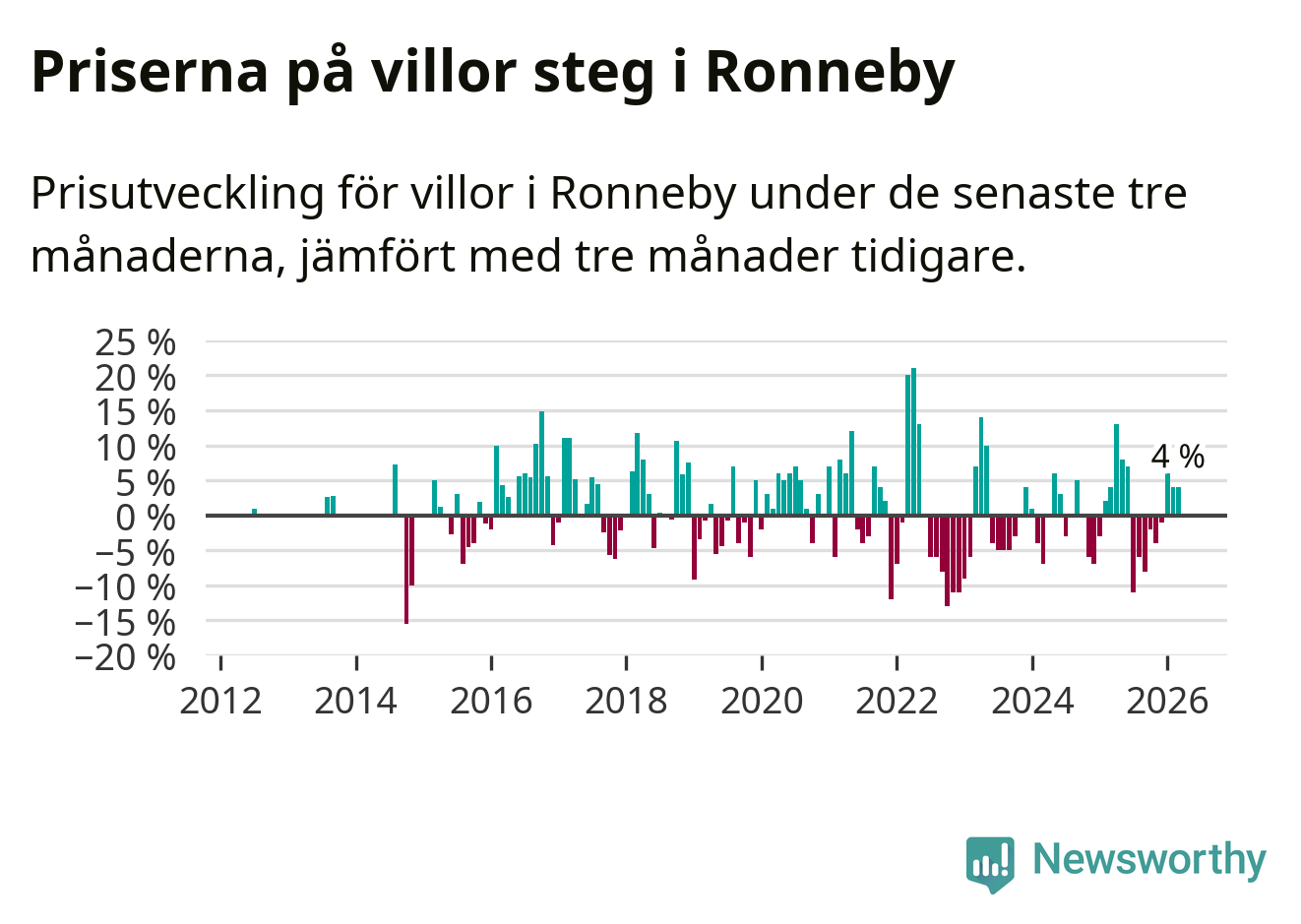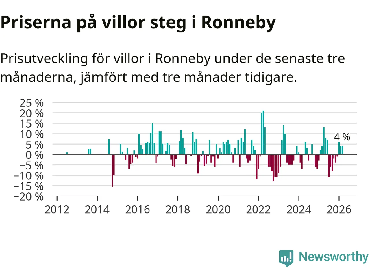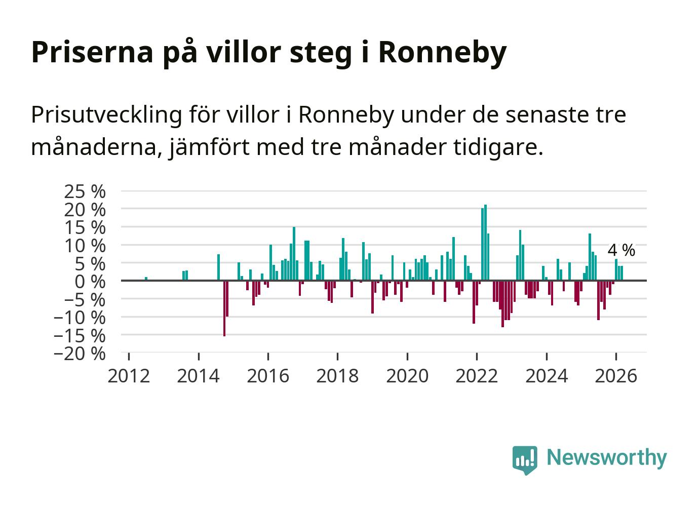 Villapriserna har gått upp i Ronneby kommun. Medelpriset på försäljningarna under de senaste tre månaderna visar på en uppgång med 4 procent.