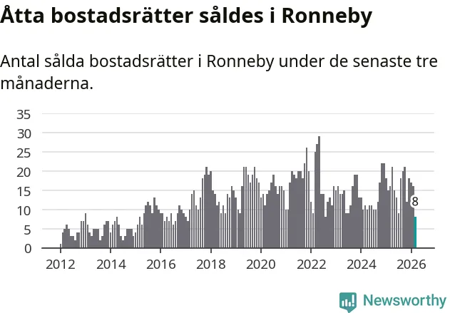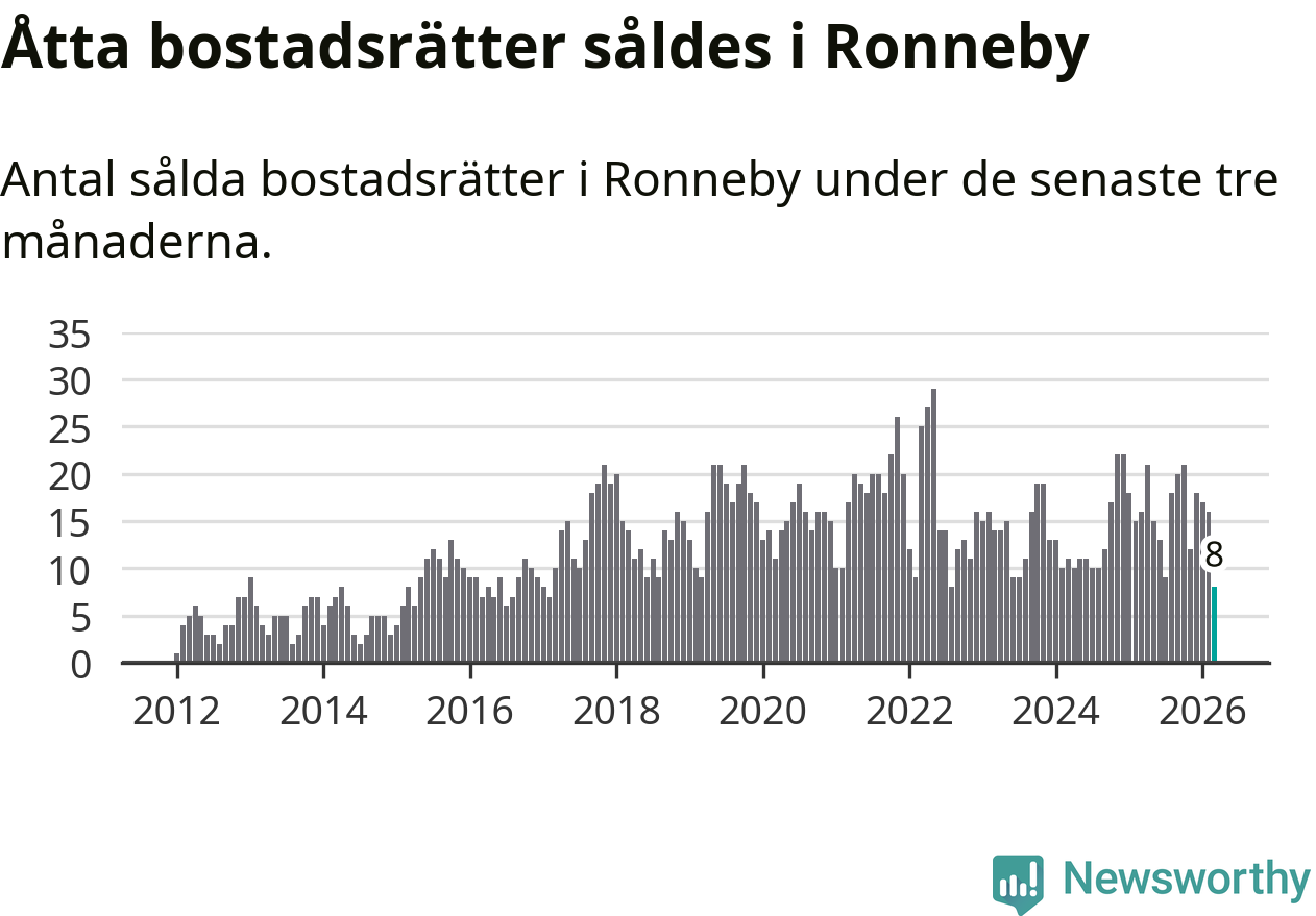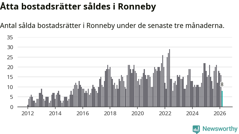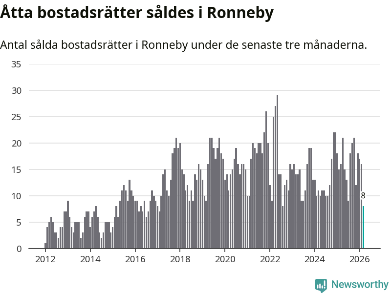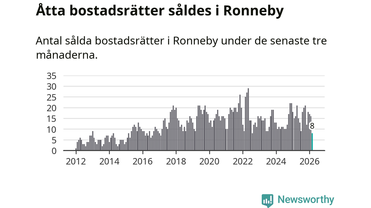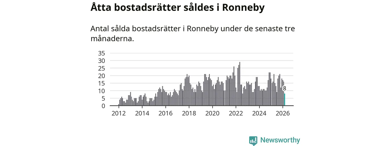 Mellan januari och mars gjordes sammanlagt åtta affärer med bostadsrätter i Ronneby kommun. Det kan jämföras med 16 vid motsvarande tid i fjol.