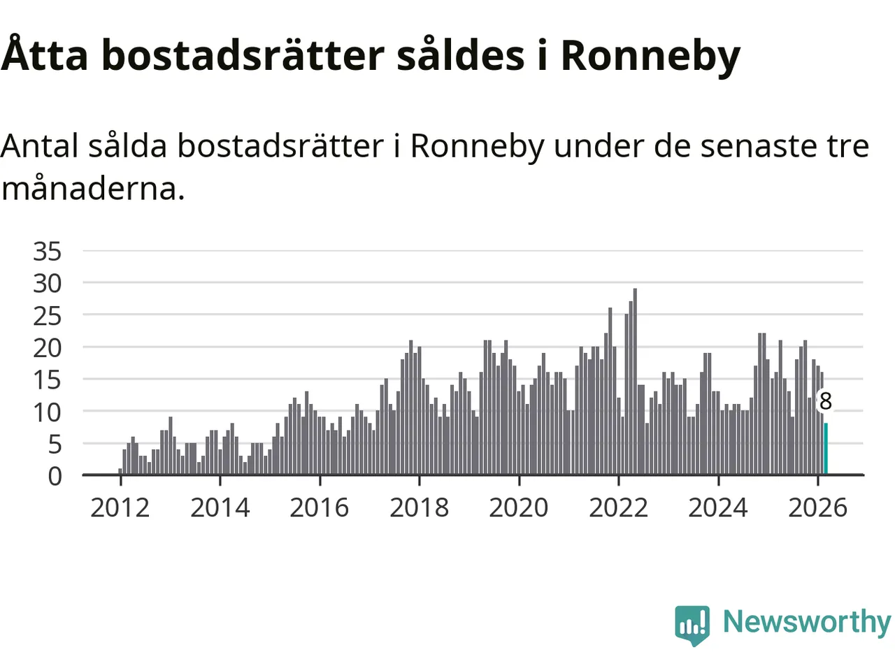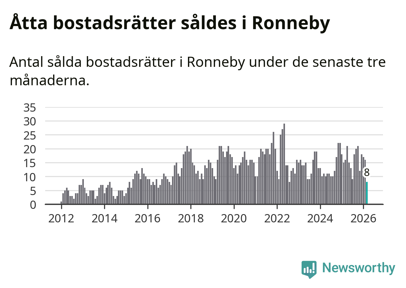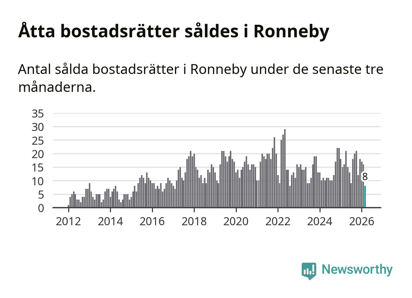 Mellan januari och mars gjordes sammanlagt åtta affärer med bostadsrätter i Ronneby kommun. Det kan jämföras med 16 vid motsvarande tid i fjol.