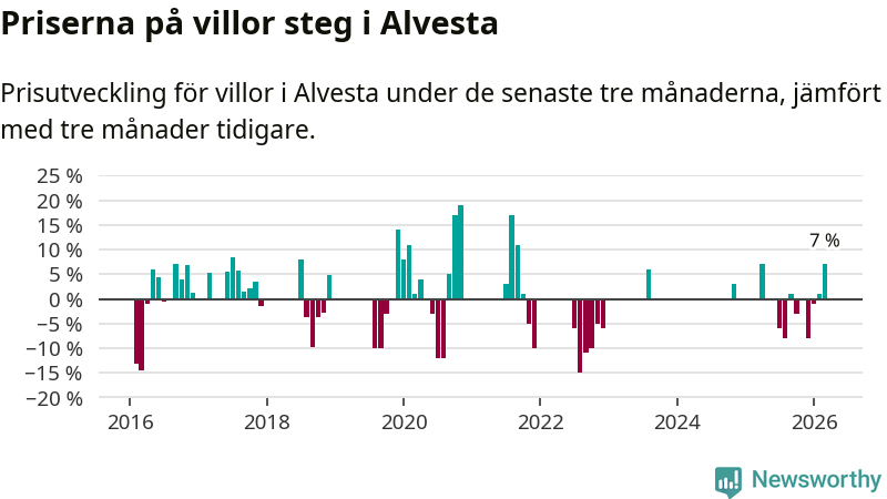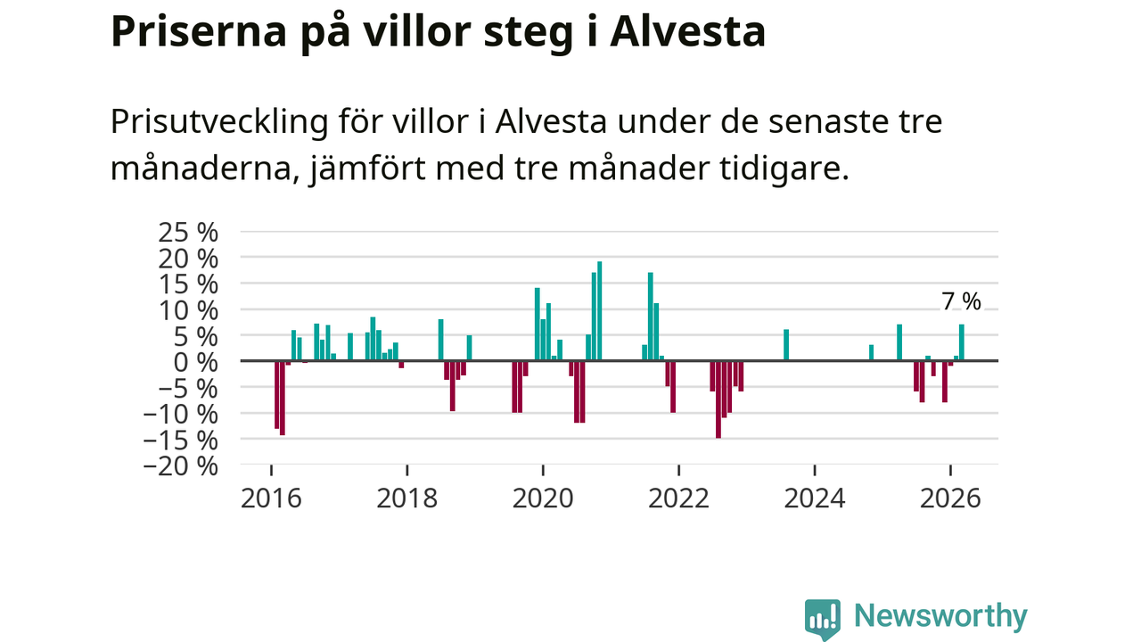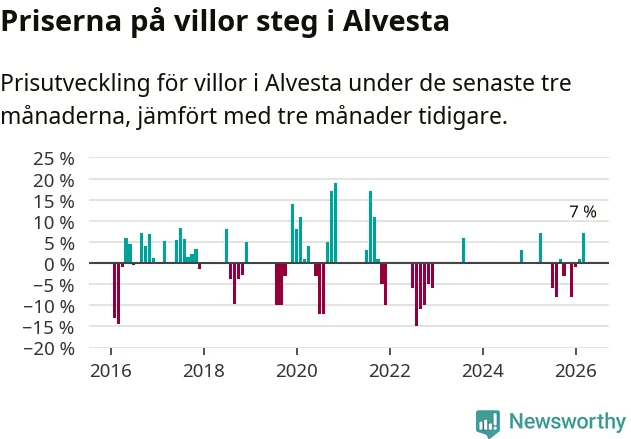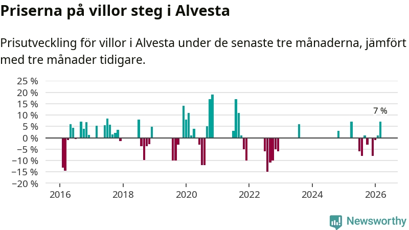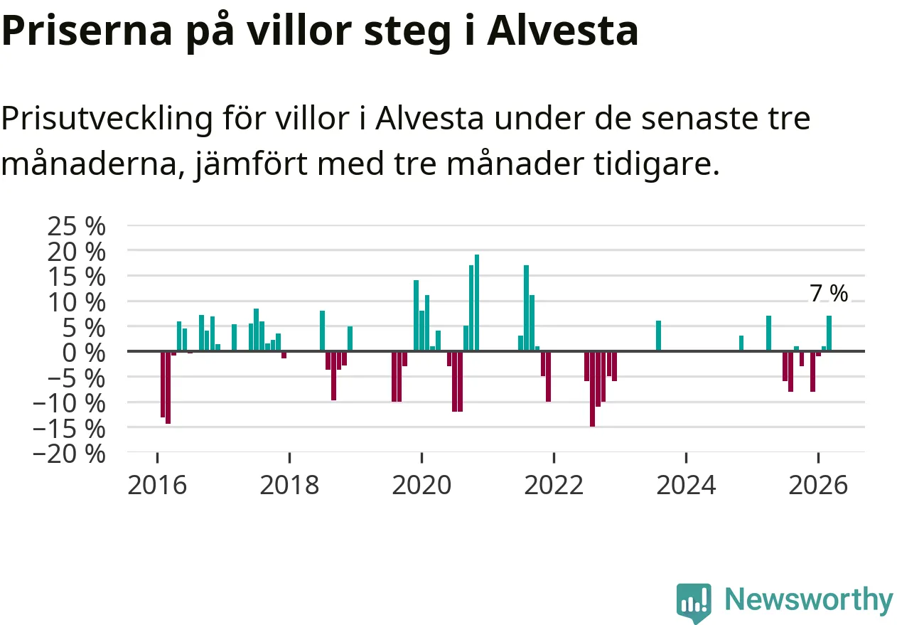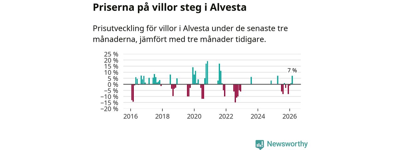 Statistiken visar även på en kännbar prisuppgång i Alvesta kommun. Medelpriset på försäljningarna av villor i kommunen var 7 procent högre än för tre månader sedan. I hela Kronoberg däremot ligger villapriserna stilla.
