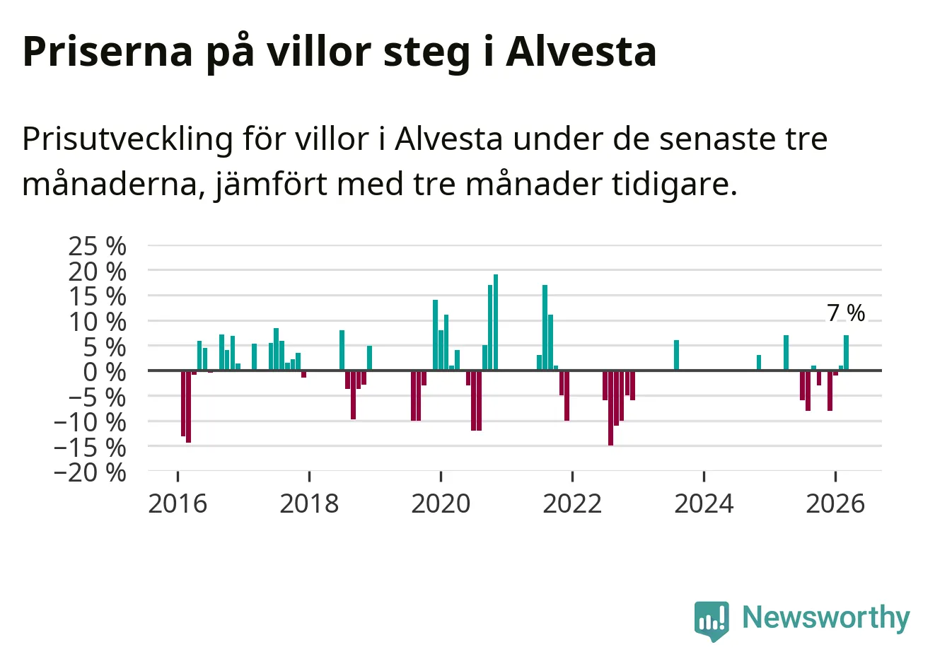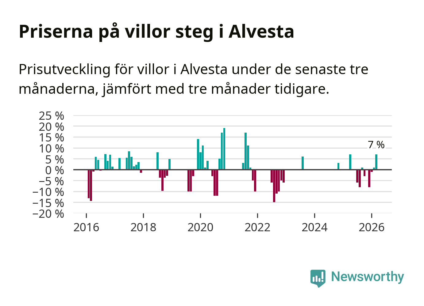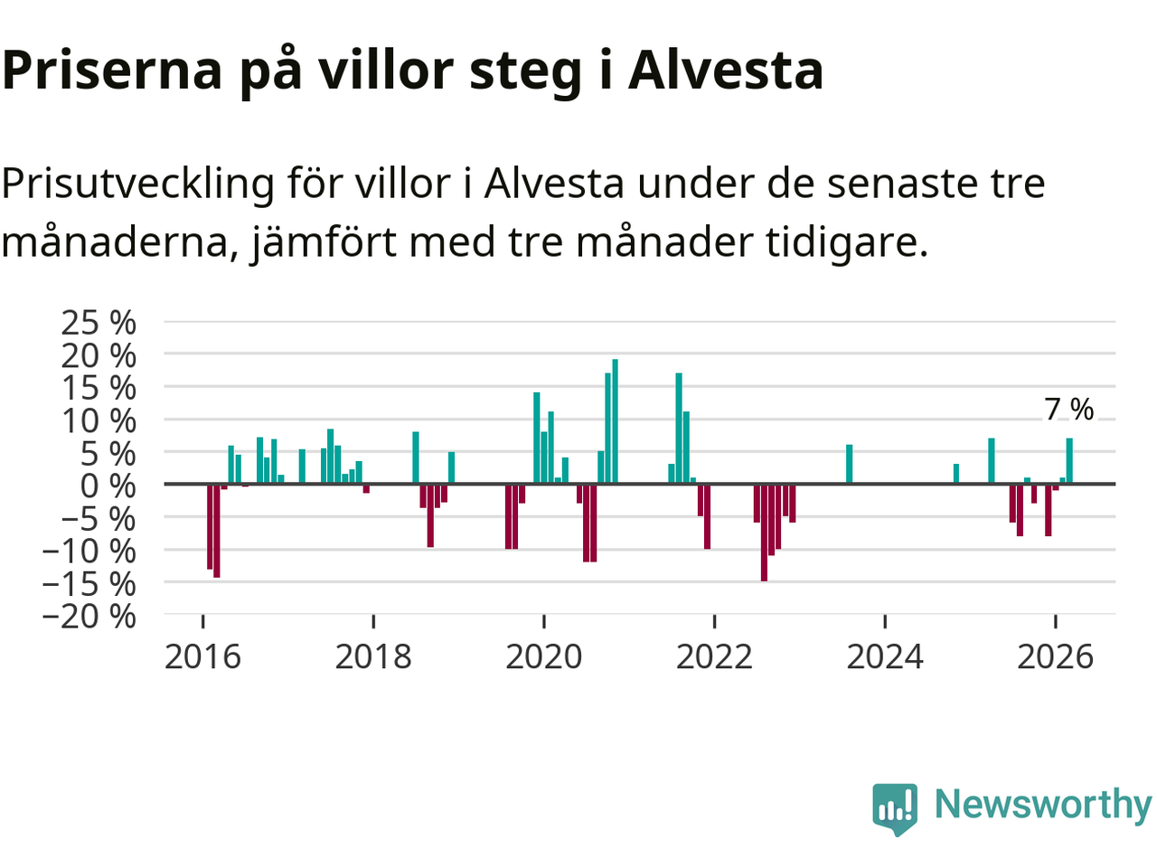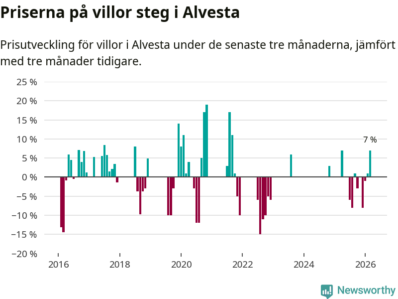 Statistiken visar även på en kännbar prisuppgång i Alvesta kommun. Medelpriset på försäljningarna av villor i kommunen var 7 procent högre än för tre månader sedan. I hela Kronoberg däremot ligger villapriserna stilla.