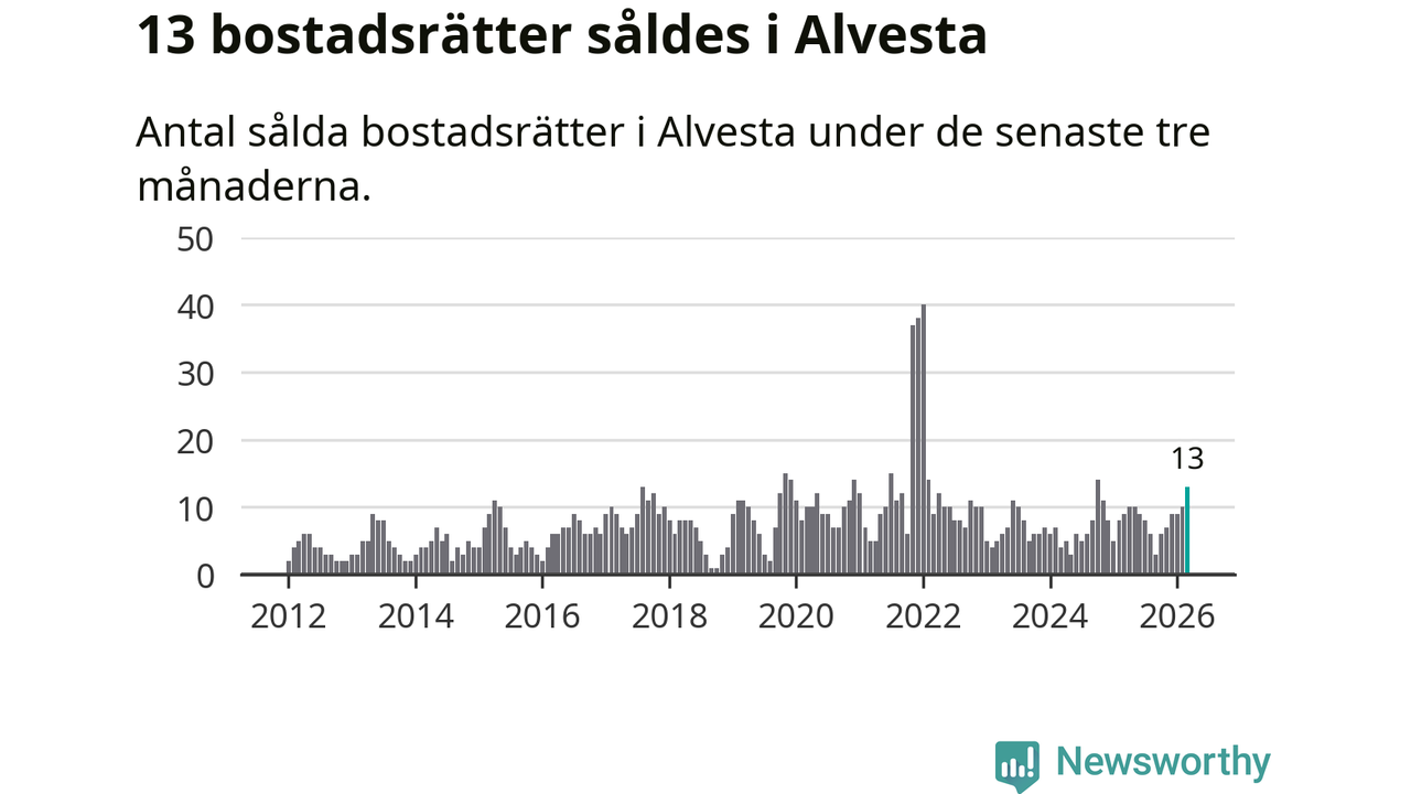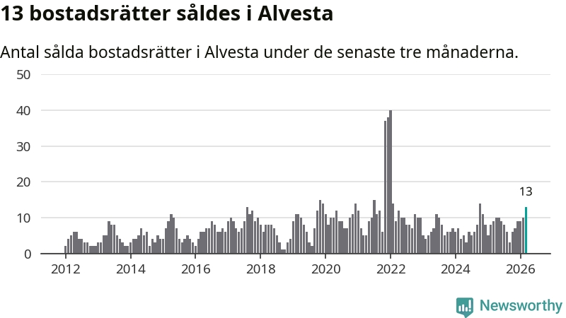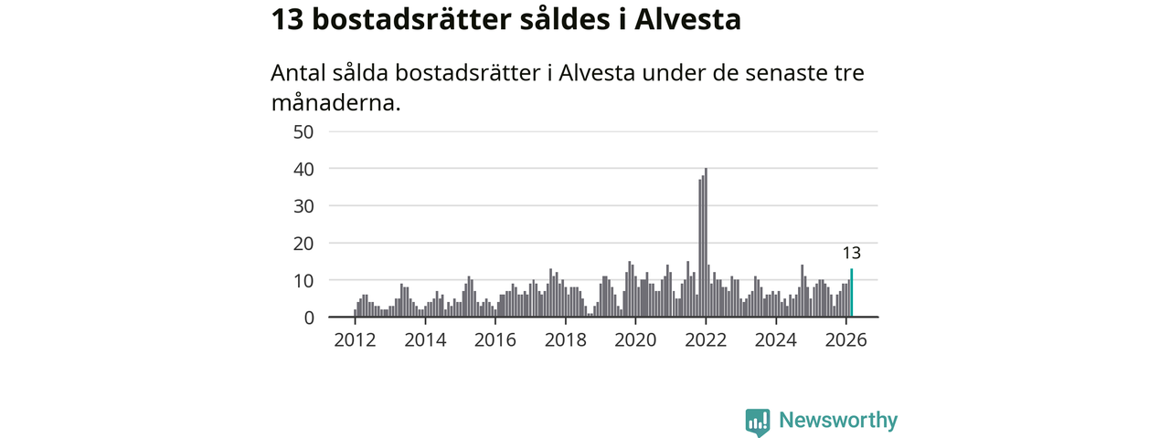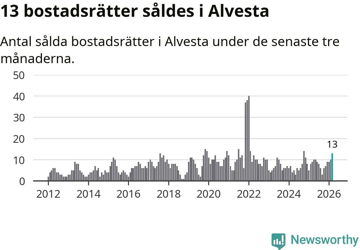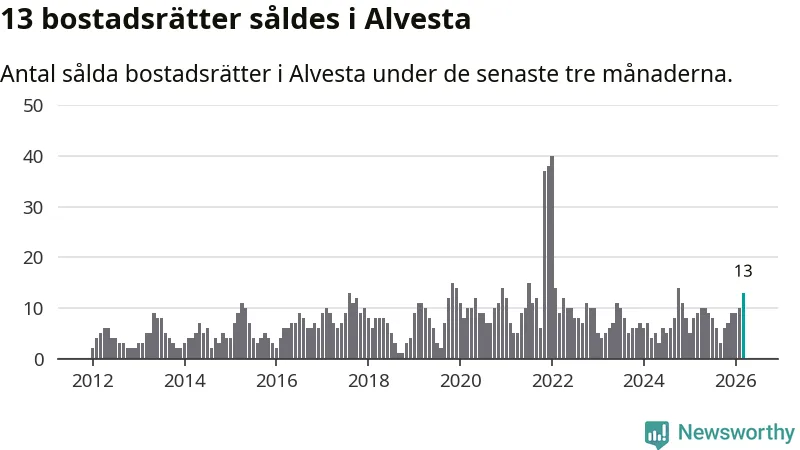 Mellan januari och mars gjordes sammanlagt 13 affärer med bostadsrätter i Alvesta kommun. Det kan jämföras med nio vid motsvarande tid i fjol.