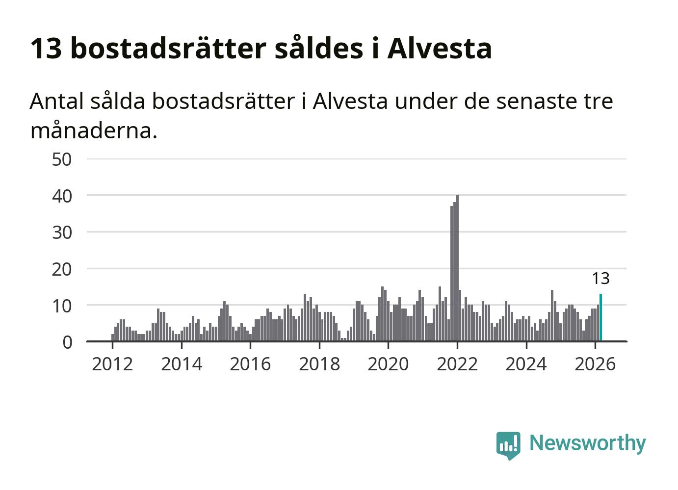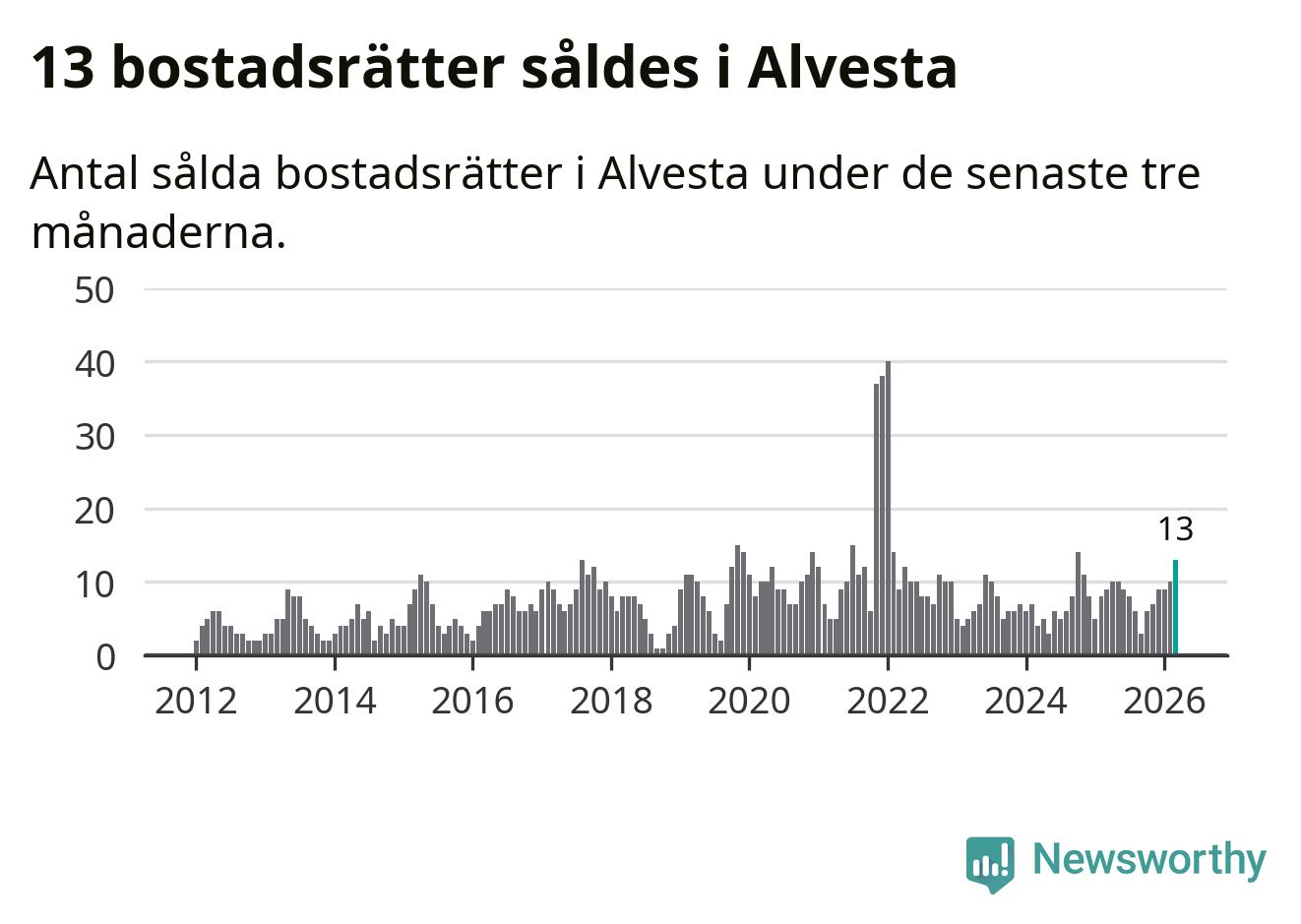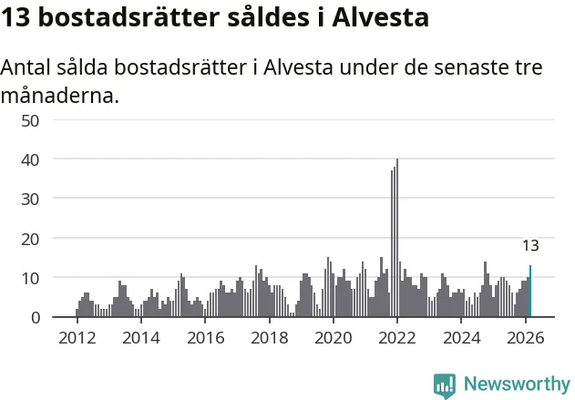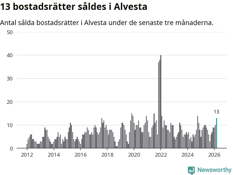 Mellan januari och mars gjordes sammanlagt 13 affärer med bostadsrätter i Alvesta kommun. Det kan jämföras med nio vid motsvarande tid i fjol.