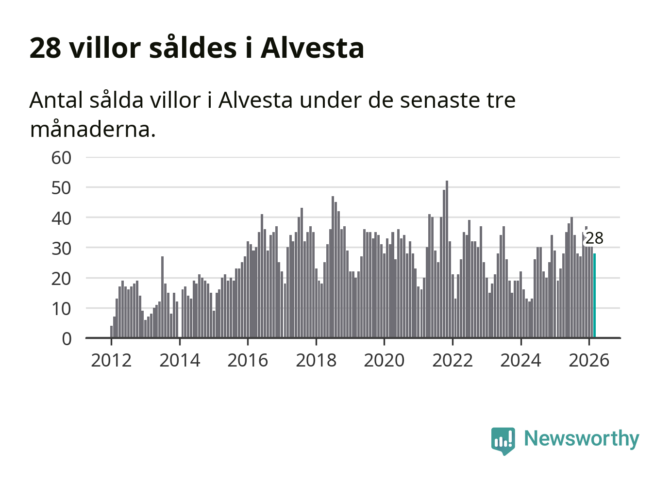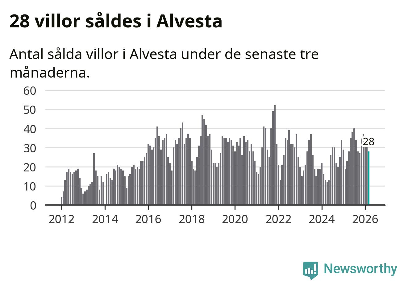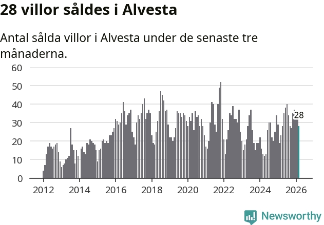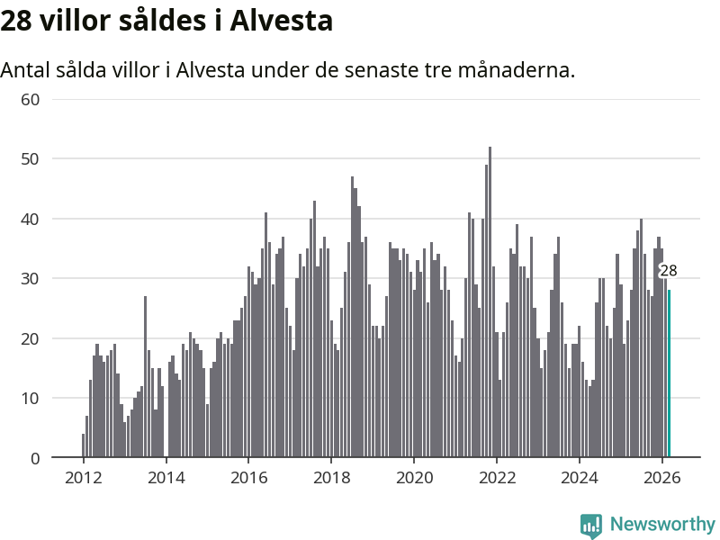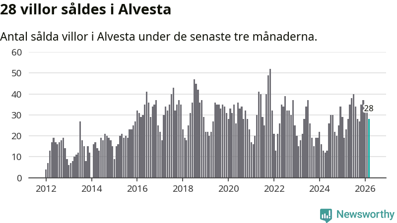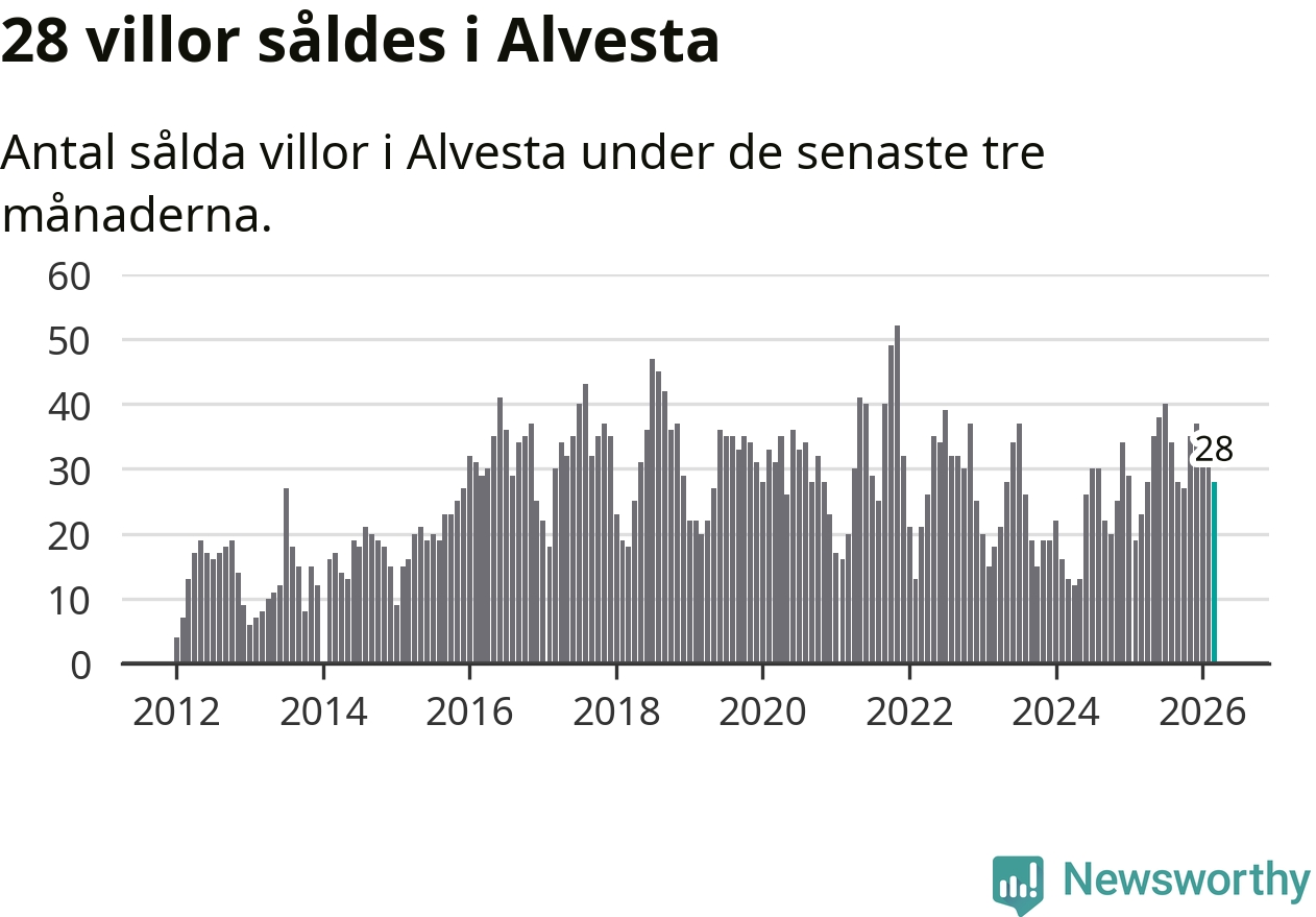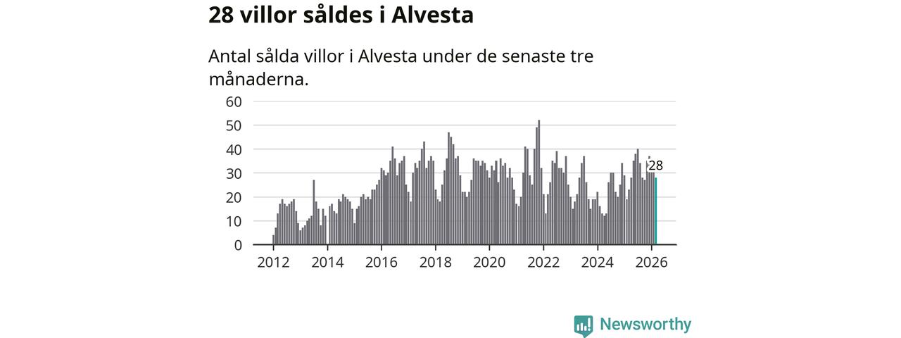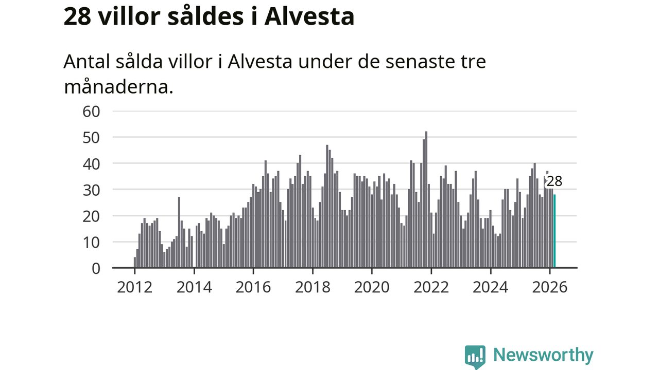 Mellan januari och mars gjordes sammanlagt 28 affärer med villor i Alvesta kommun. Det kan jämföras med 23 vid motsvarande tid i fjol.