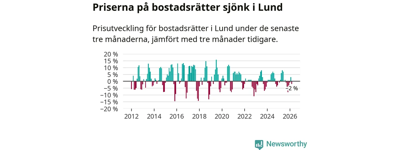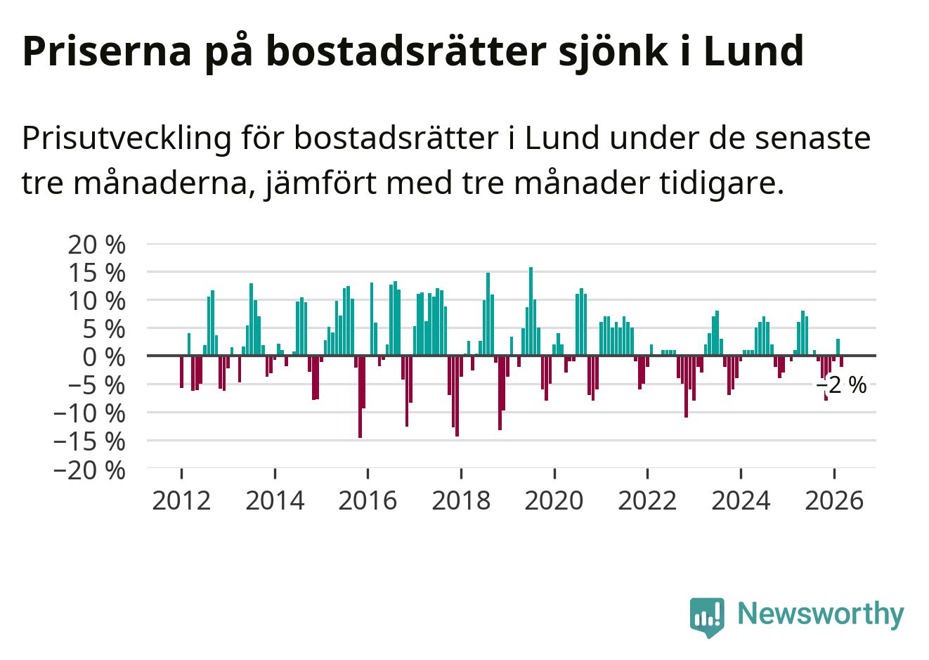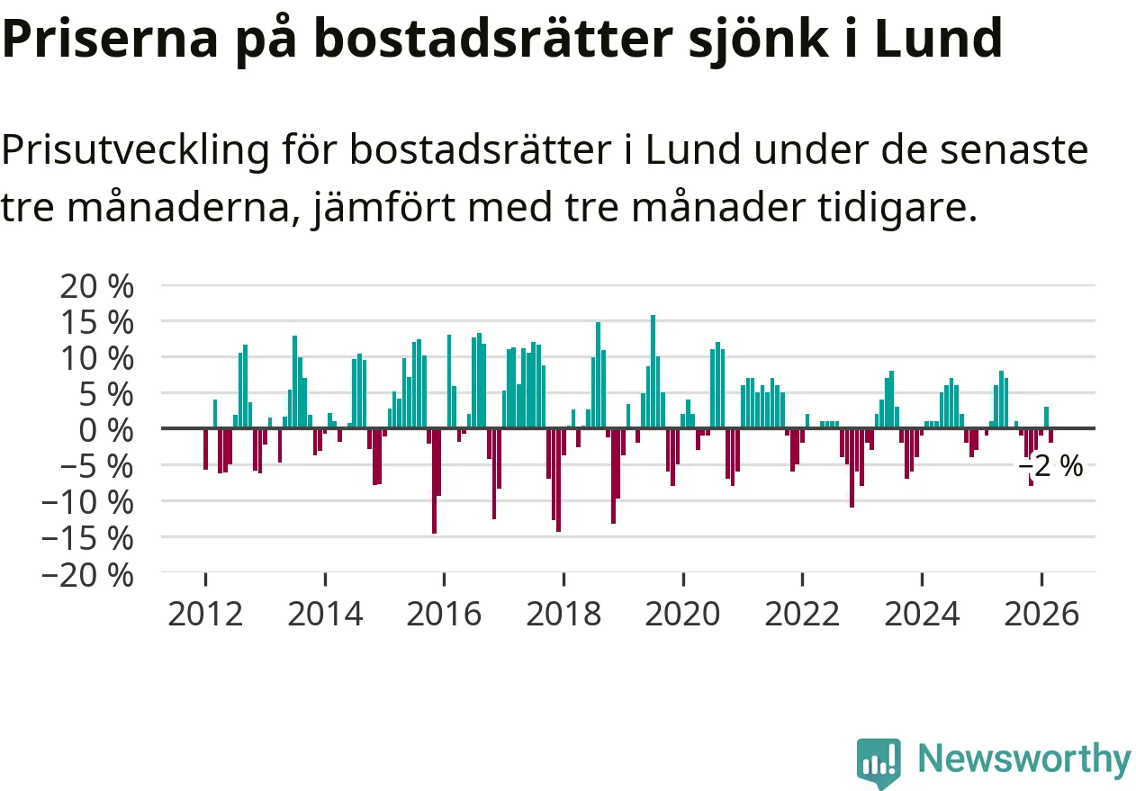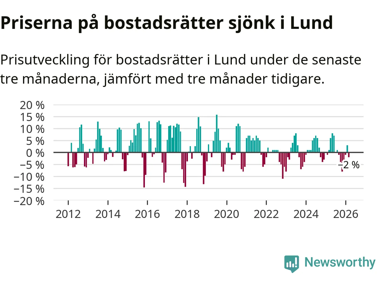 Priserna på bostadsrätter har gått ner i Lunds kommun. Medelpriset på försäljningarna under de senaste tre månaderna visar på en nedgång med 2 procent.