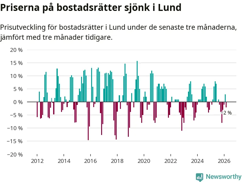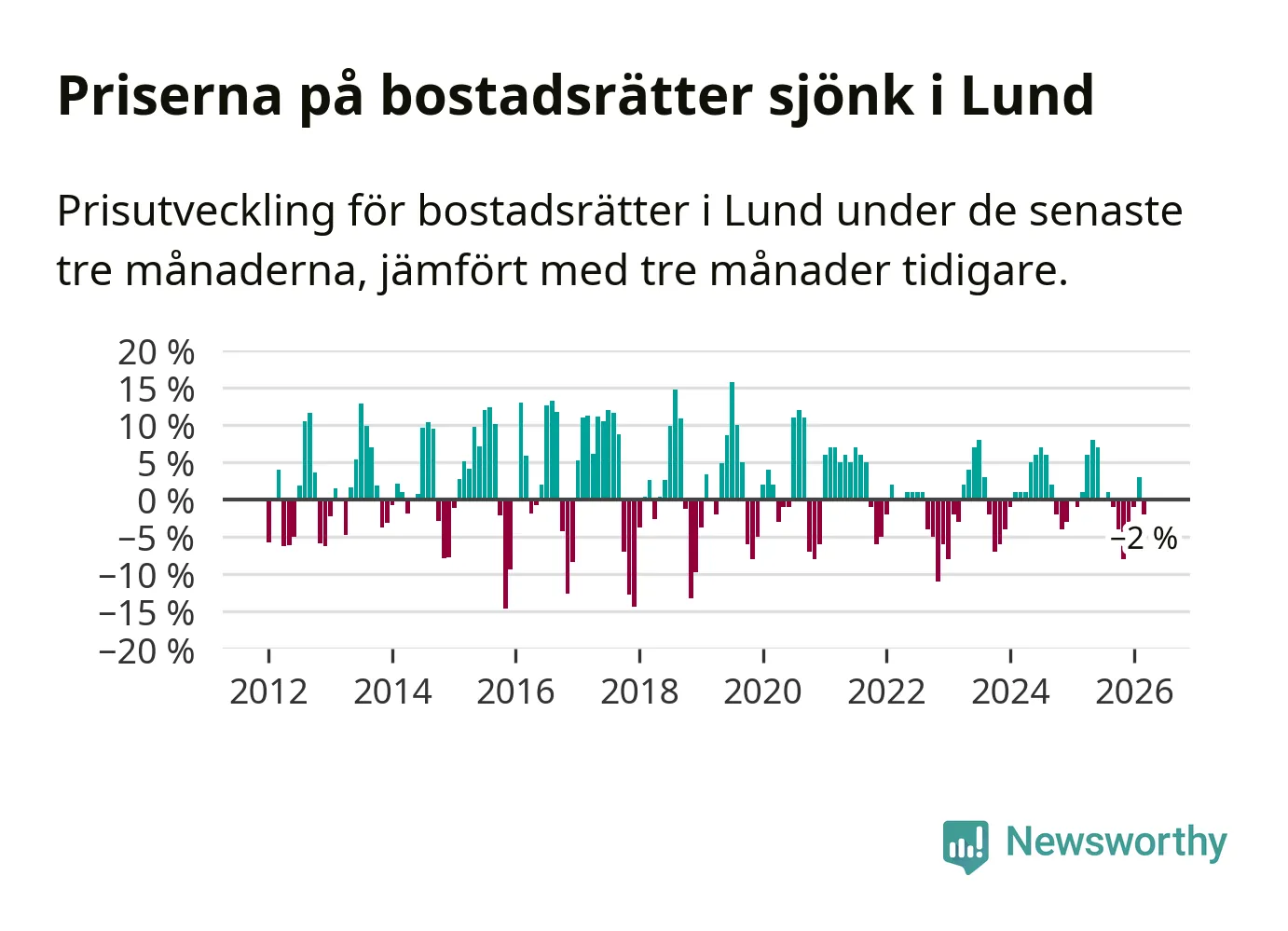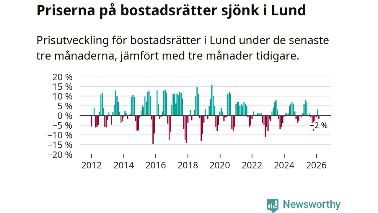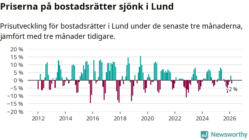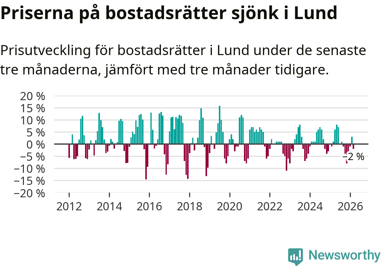 Priserna på bostadsrätter har gått ner i Lunds kommun. Medelpriset på försäljningarna under de senaste tre månaderna visar på en nedgång med 2 procent.
