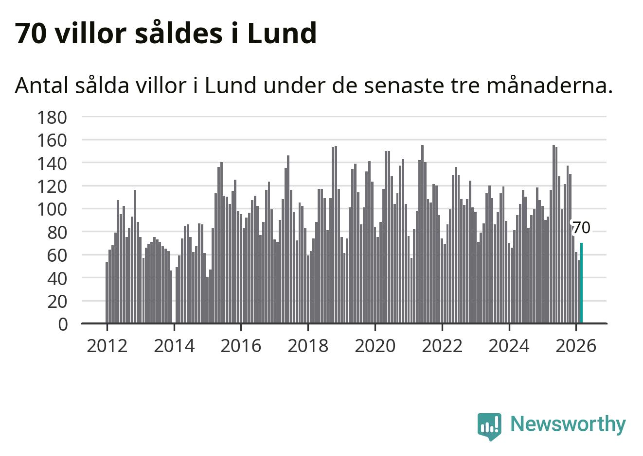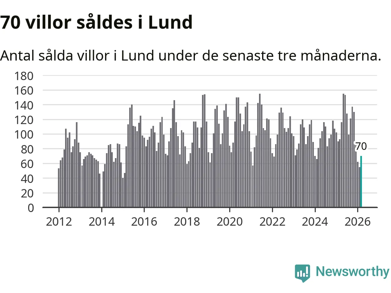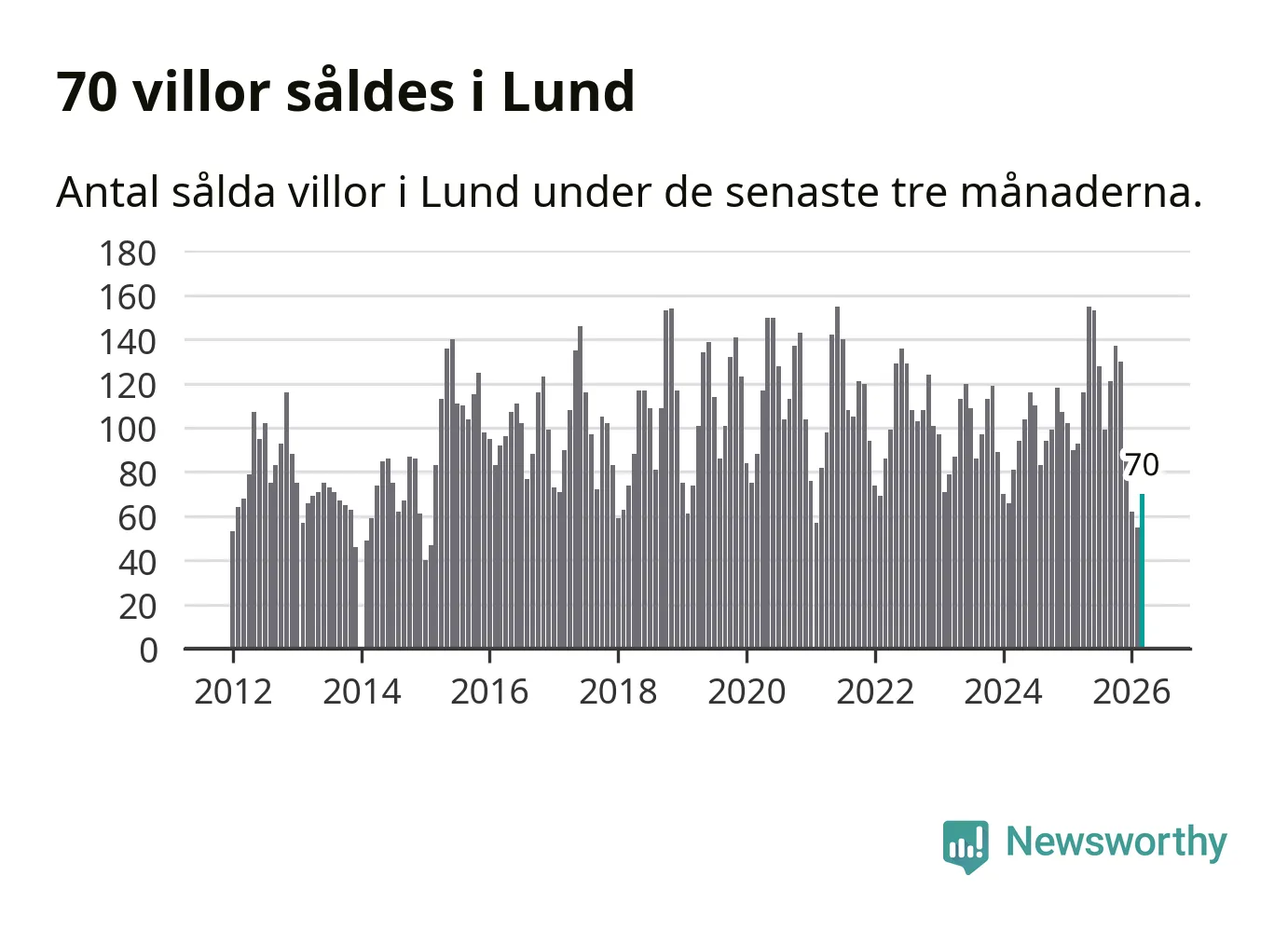 Sammanlagt såldes 70 villor i Lunds kommun mellan januari och mars till ett genomsnittligt pris på 5,8 miljoner kronor. I fjol gjordes 93 affärer vid den här tiden på året.