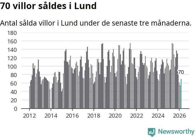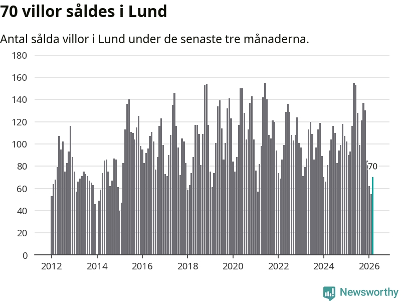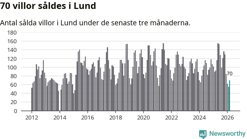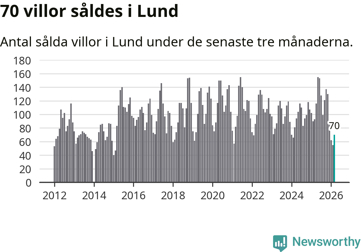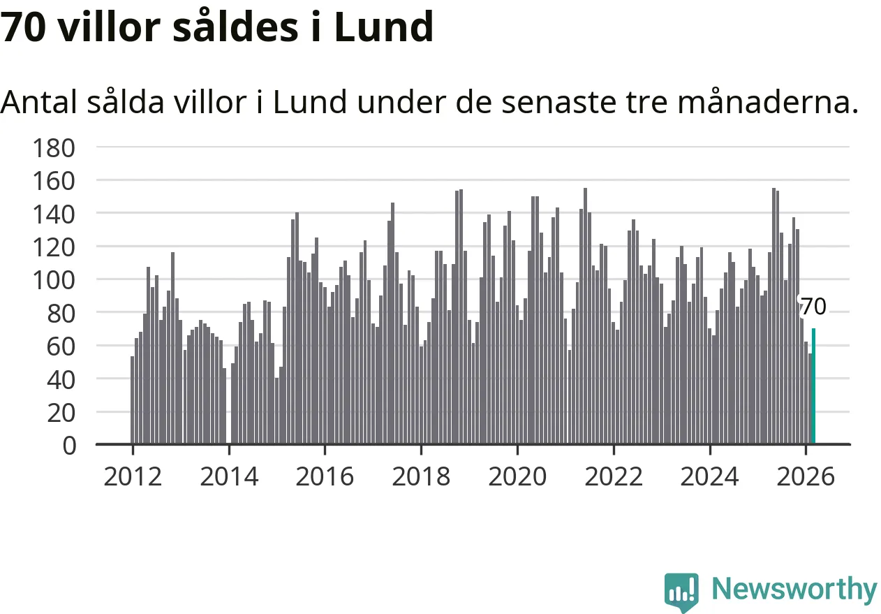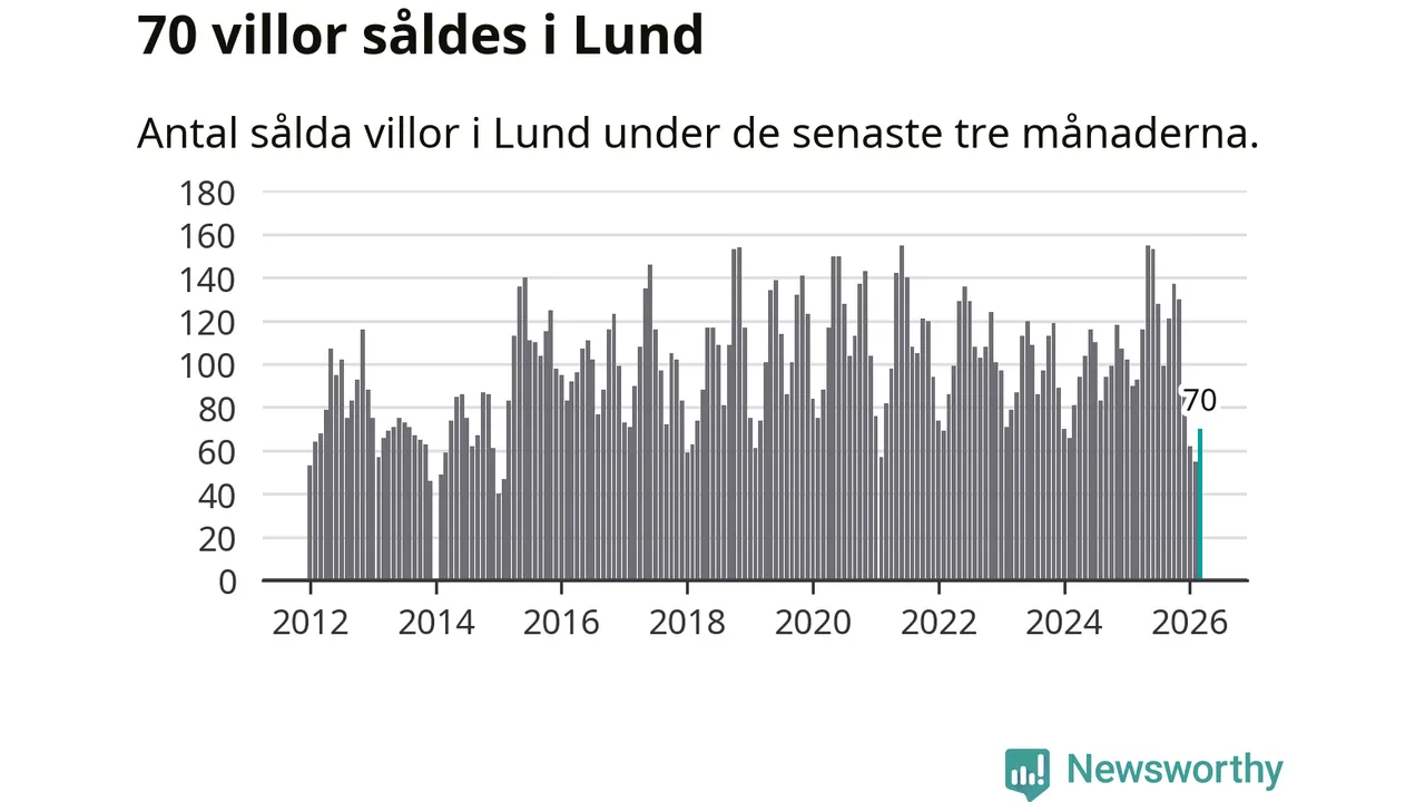 Sammanlagt såldes 70 villor i Lunds kommun mellan januari och mars till ett genomsnittligt pris på 5,8 miljoner kronor. I fjol gjordes 93 affärer vid den här tiden på året.