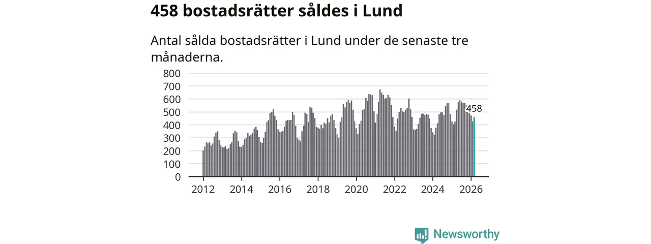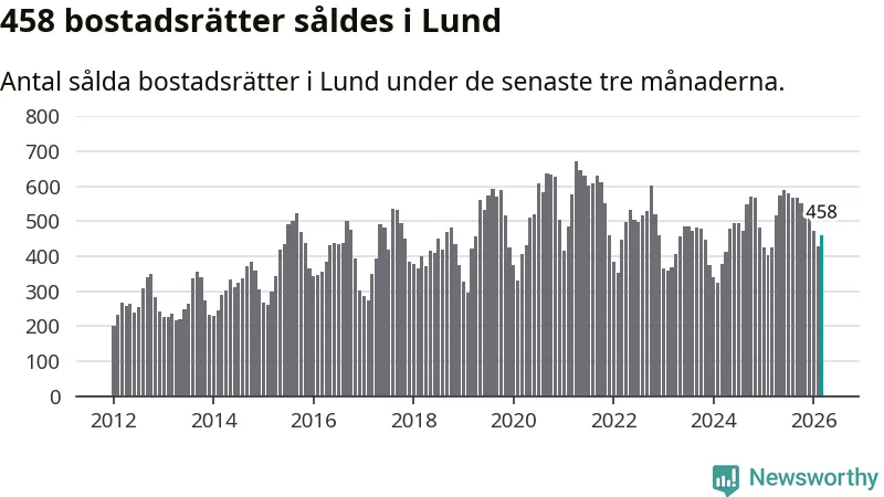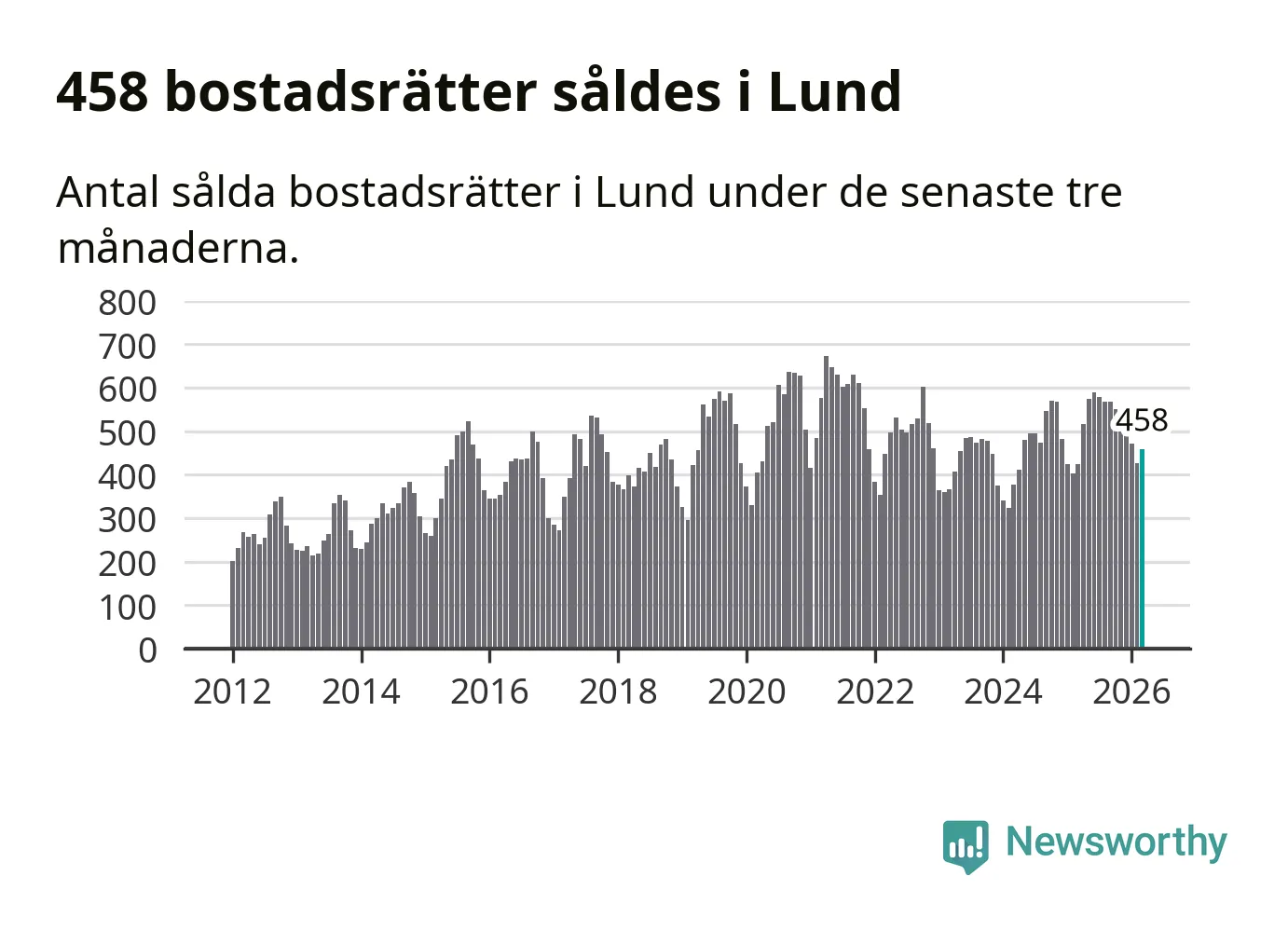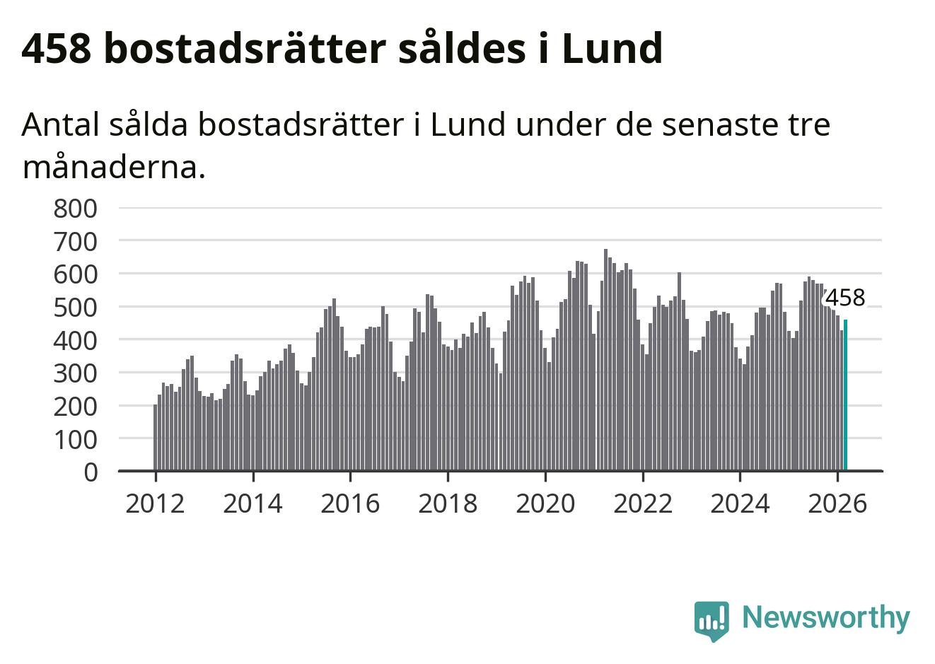 Sammanlagt såldes 458 bostadsrätter i Lunds kommun mellan januari och mars till ett genomsnittligt pris på 2,8 miljoner kronor. I fjol gjordes 425 affärer vid den här tiden på året.