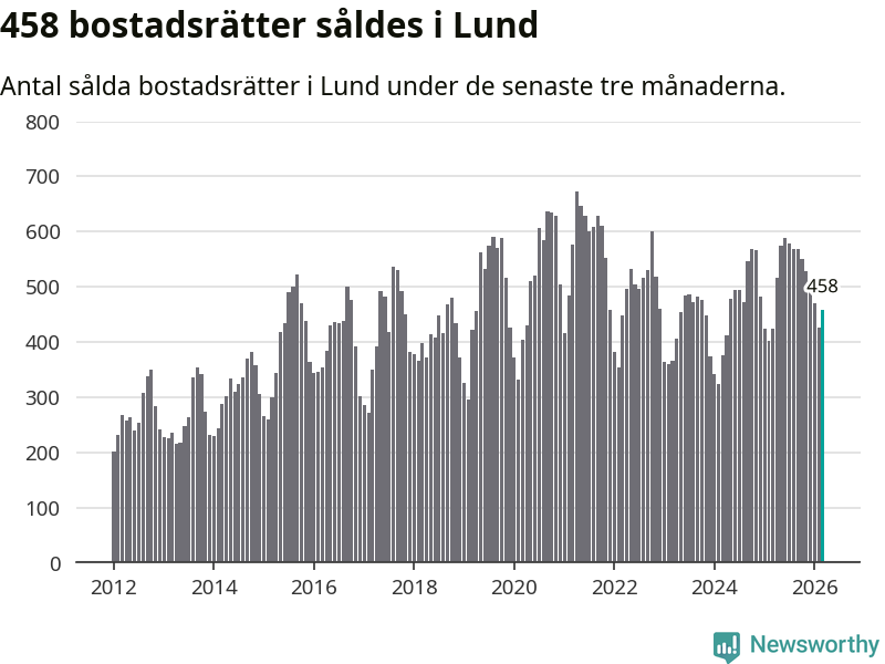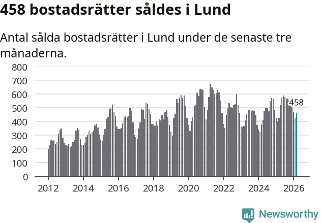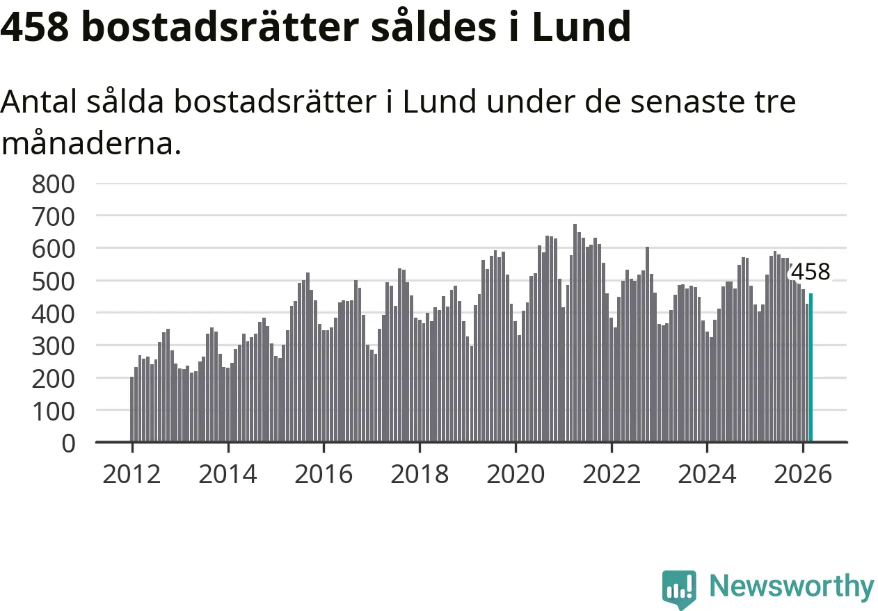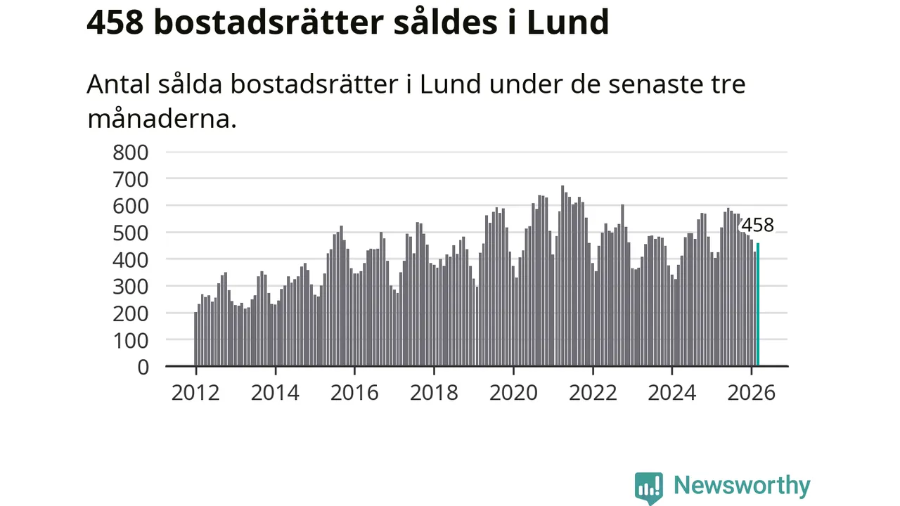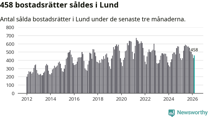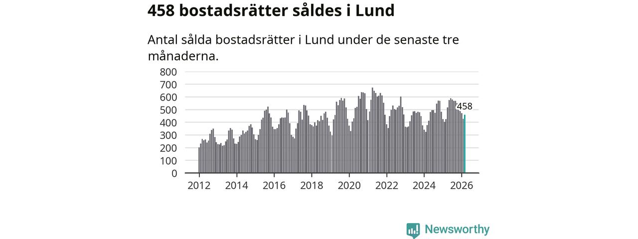 Sammanlagt såldes 458 bostadsrätter i Lunds kommun mellan januari och mars till ett genomsnittligt pris på 2,8 miljoner kronor. I fjol gjordes 425 affärer vid den här tiden på året.