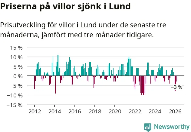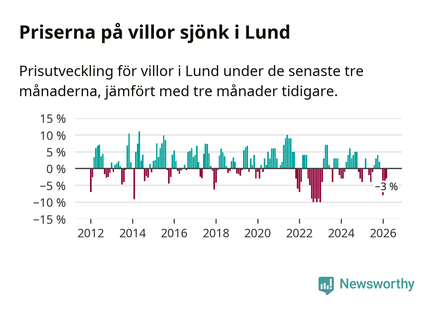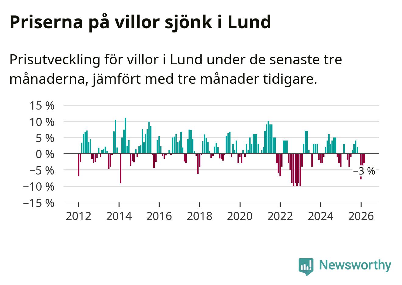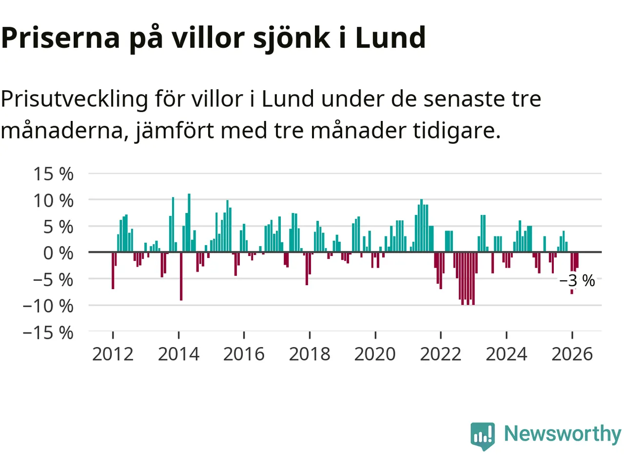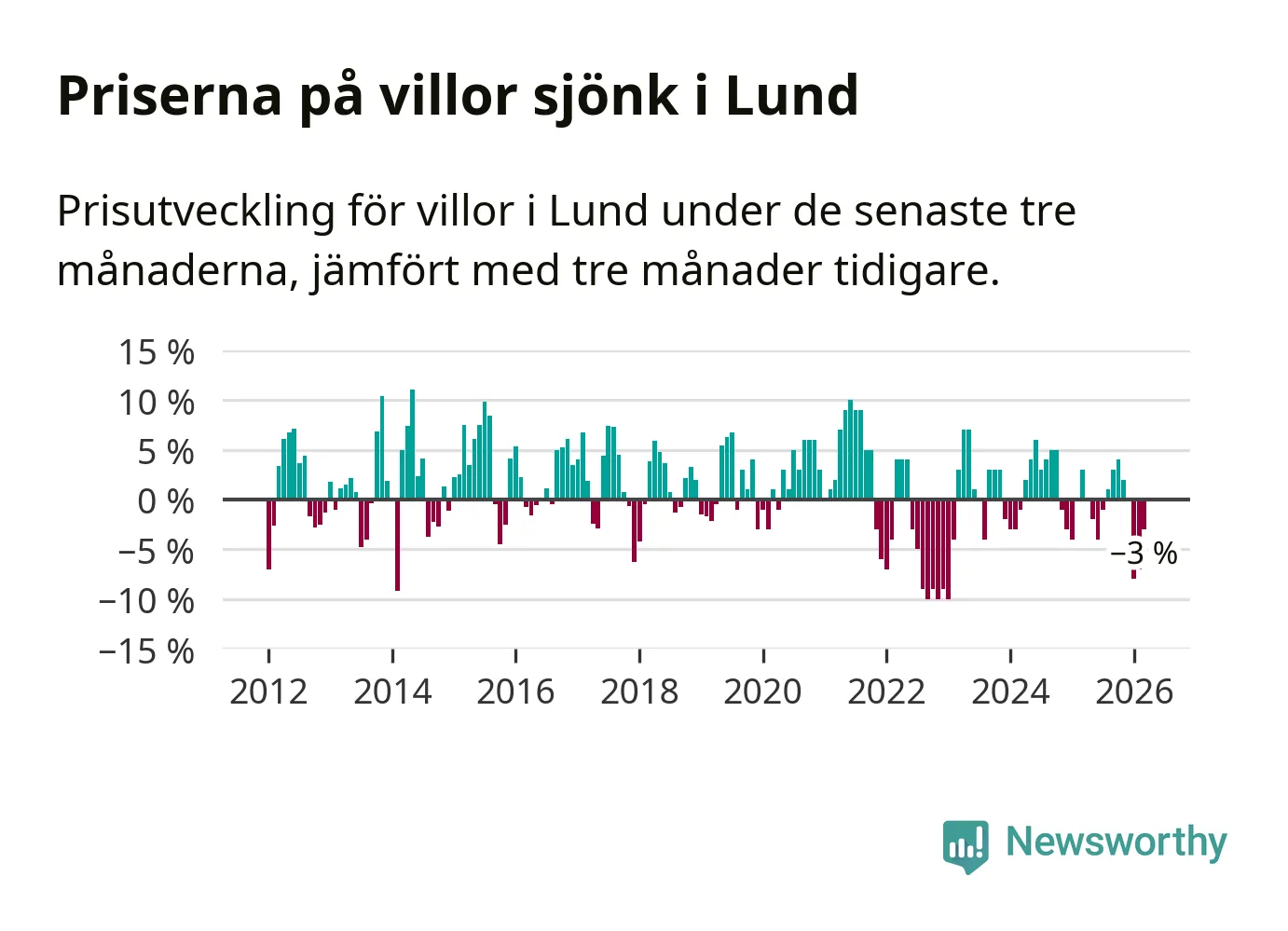 Villapriserna har gått ner i Lunds kommun. Medelpriset på försäljningarna under de senaste tre månaderna visar på en nedgång med 3 procent.