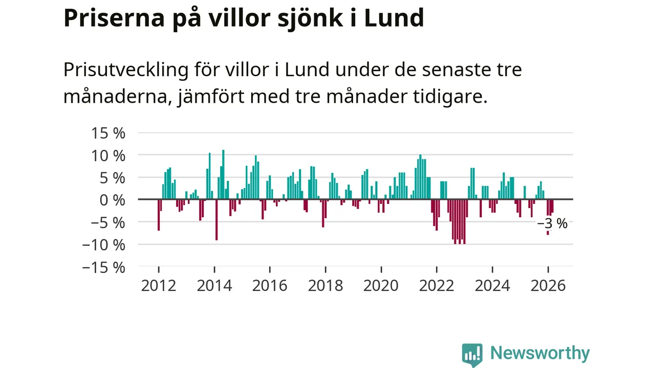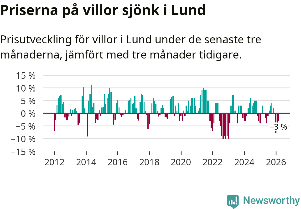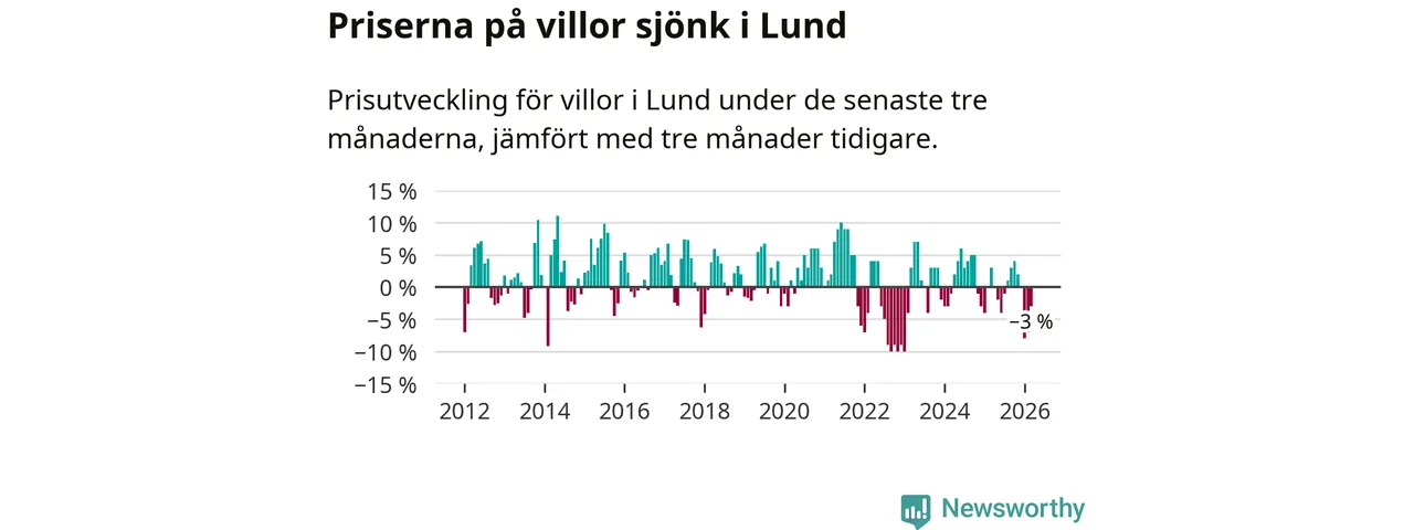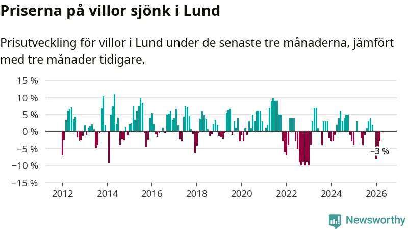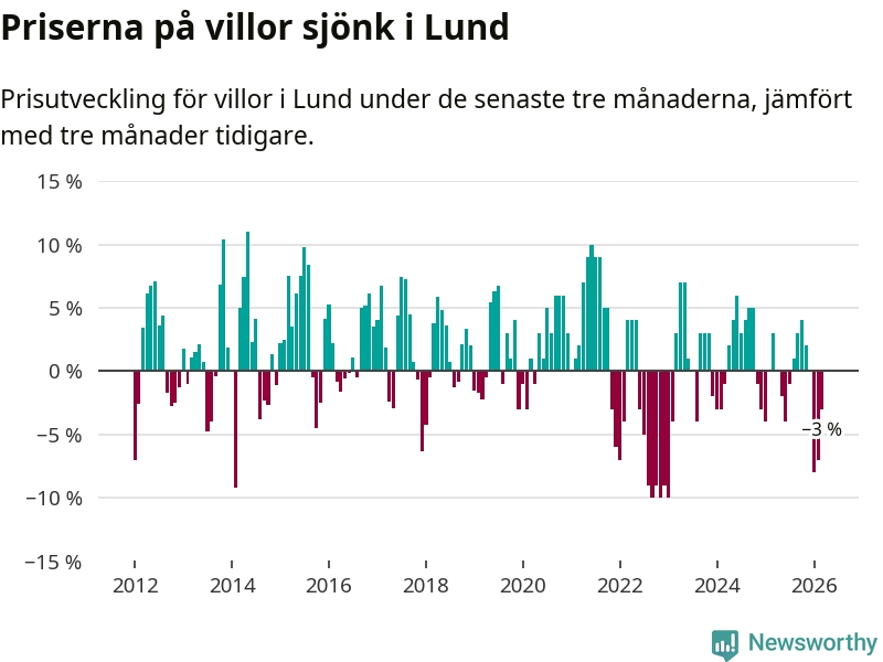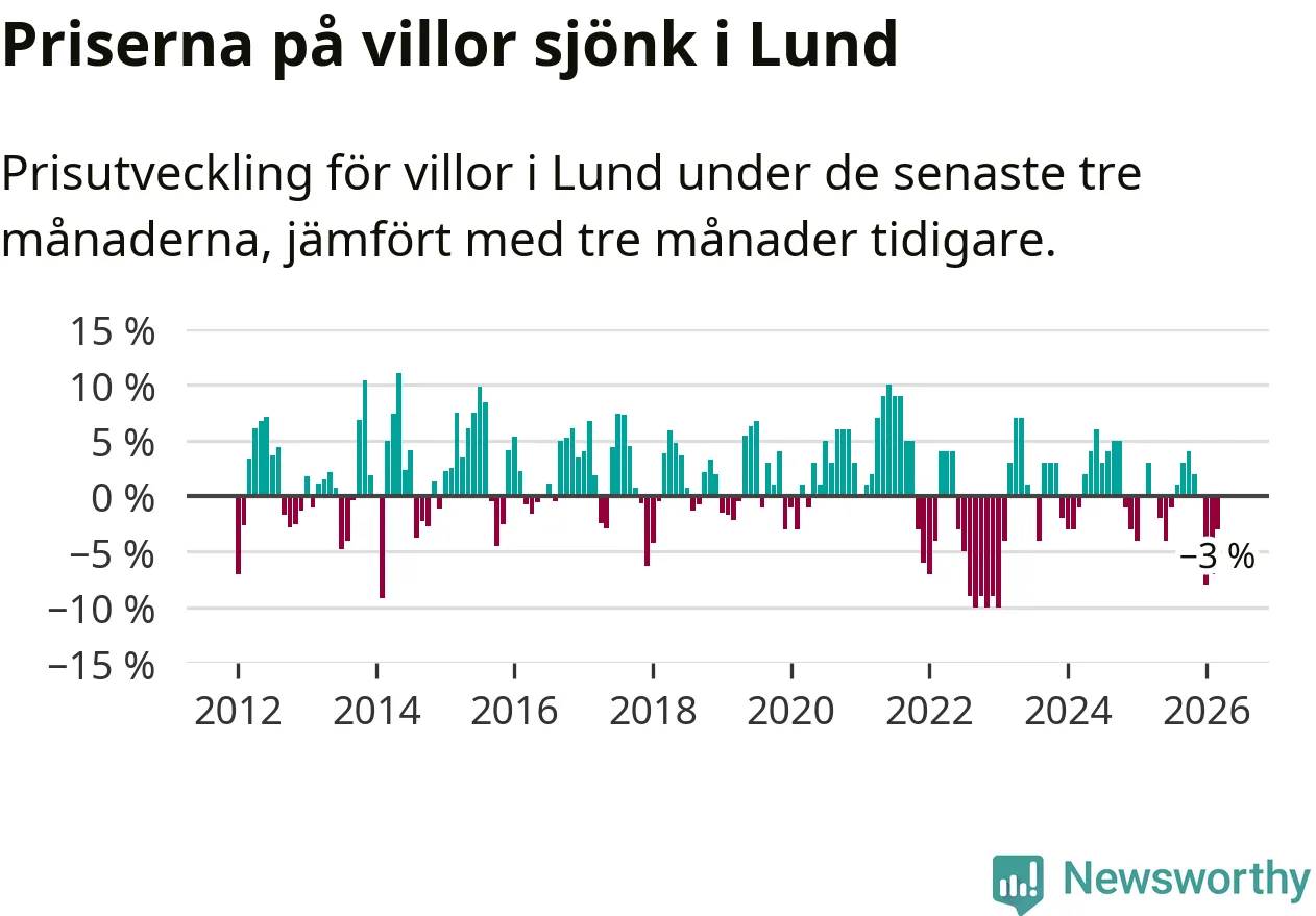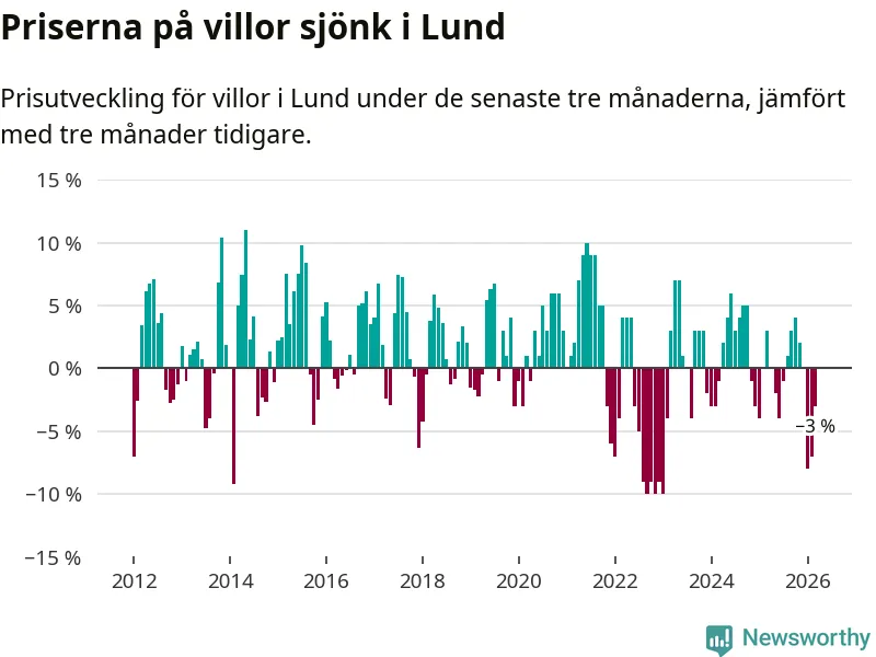 Villapriserna har gått ner i Lunds kommun. Medelpriset på försäljningarna under de senaste tre månaderna visar på en nedgång med 3 procent.