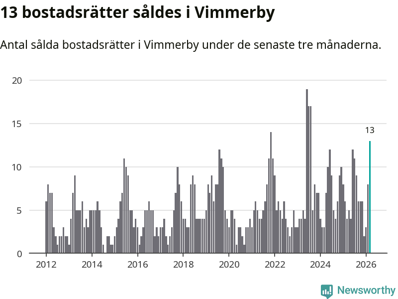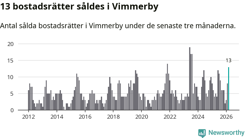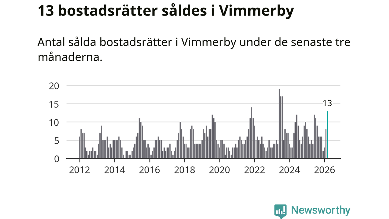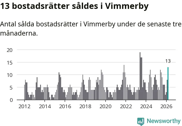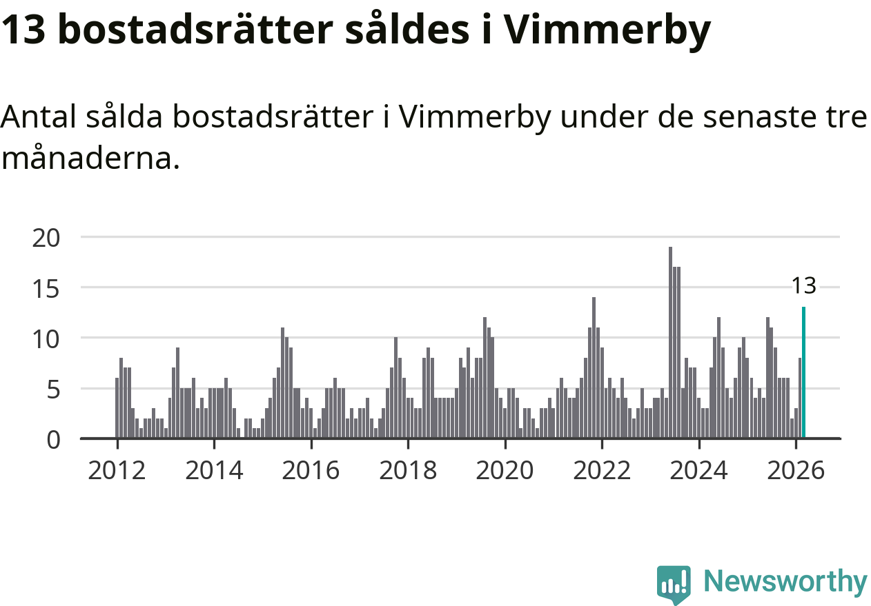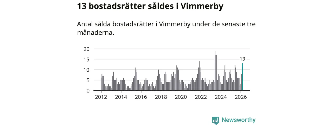 Mellan januari och mars gjordes sammanlagt 13 affärer med bostadsrätter i Vimmerby kommun. Det kan jämföras med fyra vid motsvarande tid i fjol.