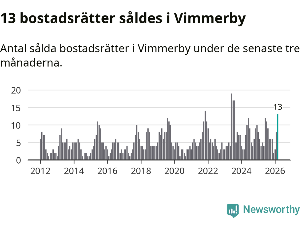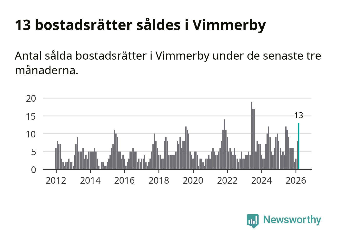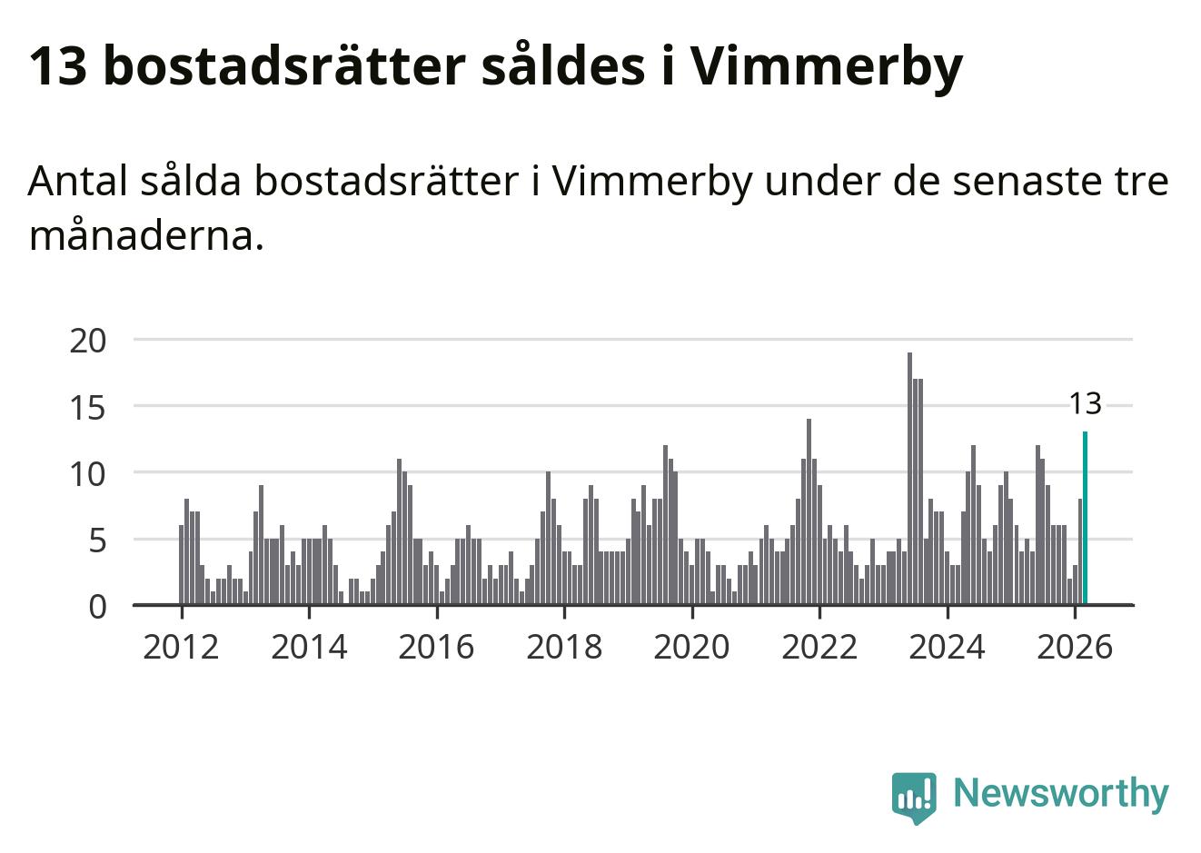 Mellan januari och mars gjordes sammanlagt 13 affärer med bostadsrätter i Vimmerby kommun. Det kan jämföras med fyra vid motsvarande tid i fjol.