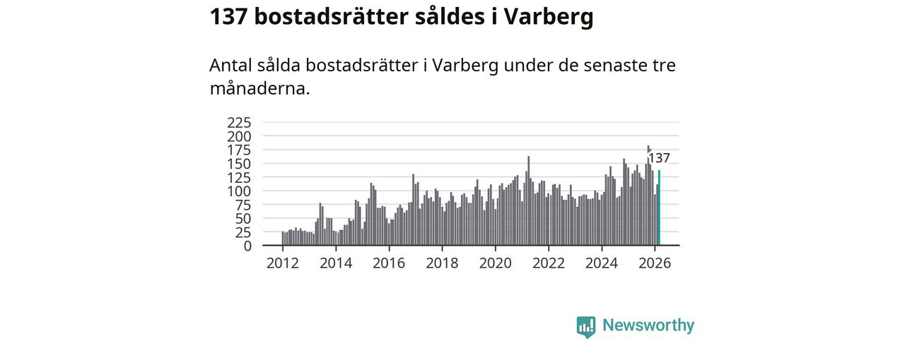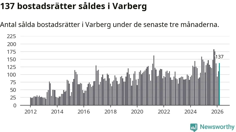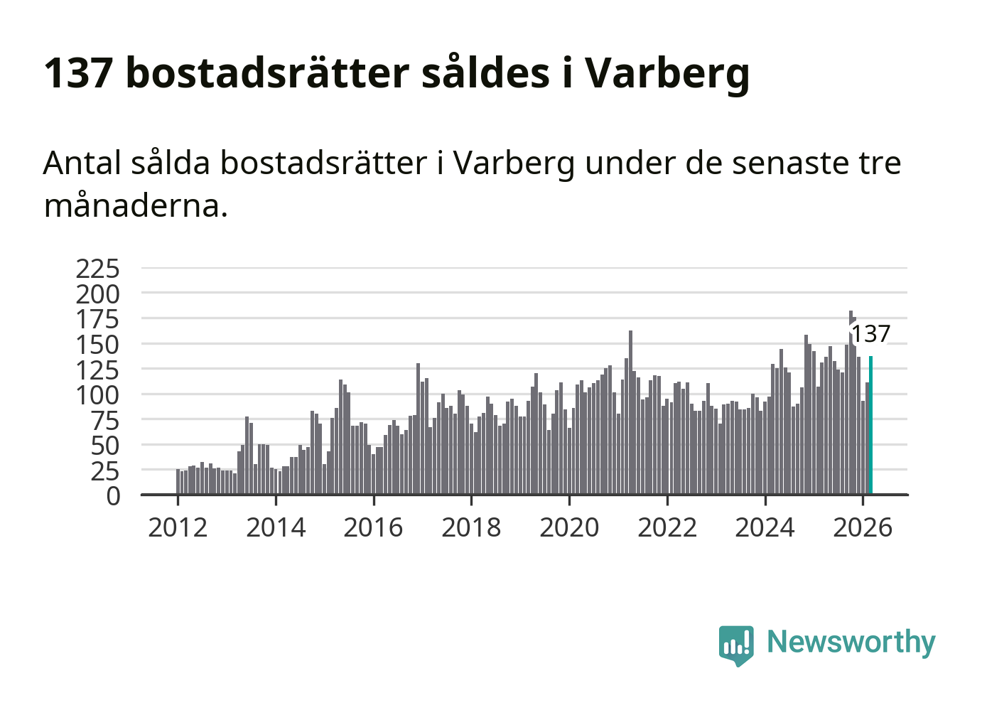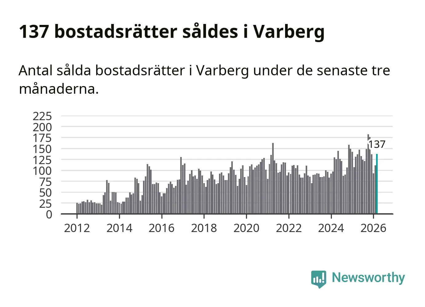 Sammanlagt såldes 137 bostadsrätter i Varbergs kommun mellan januari och mars till ett genomsnittligt pris på 3,1 miljoner kronor. I fjol gjordes 131 affärer vid den här tiden på året.