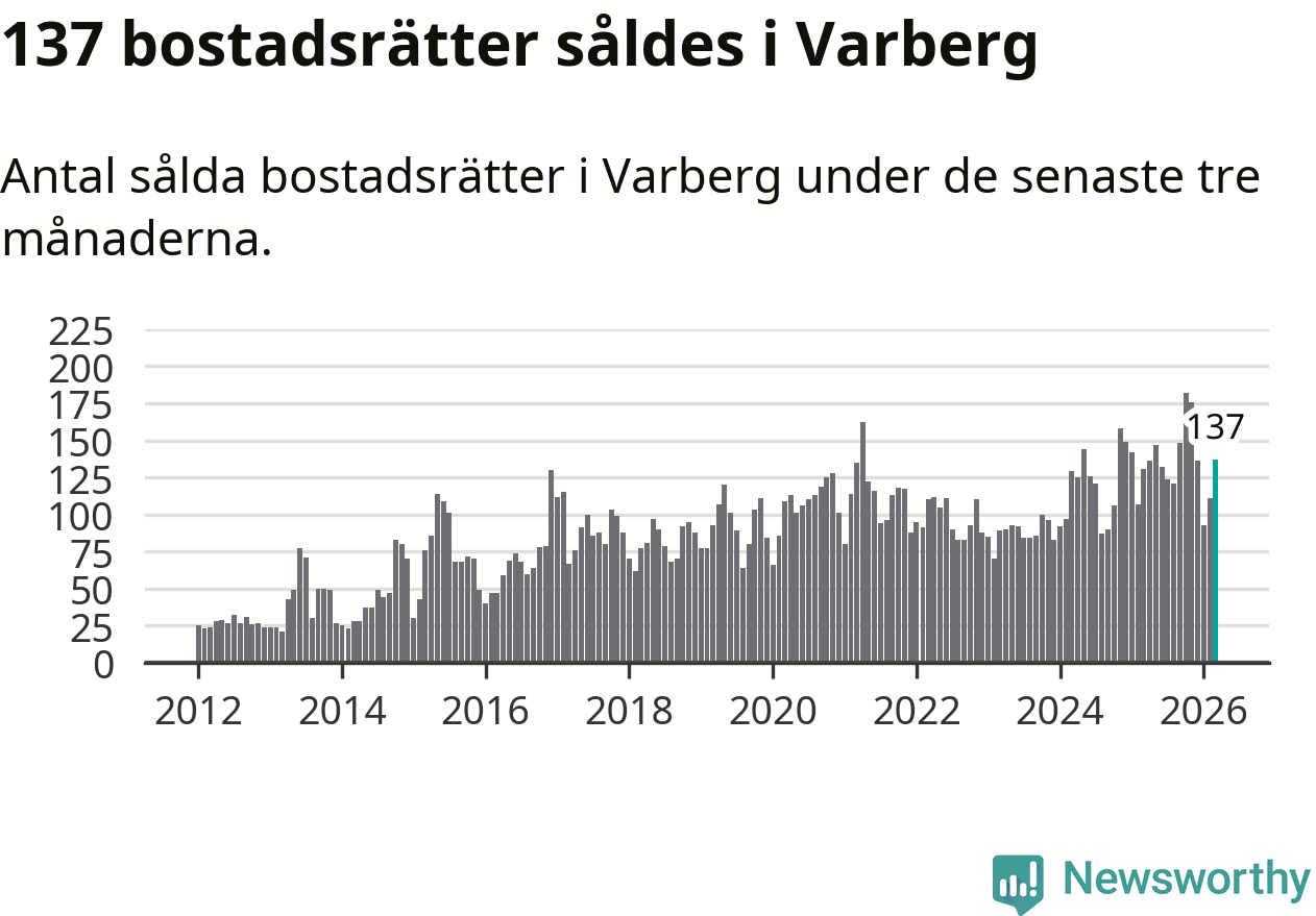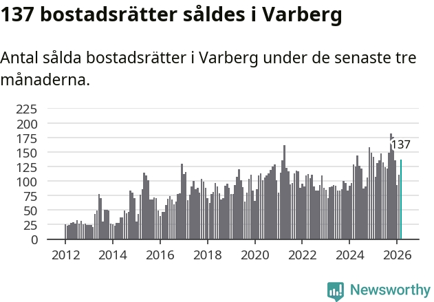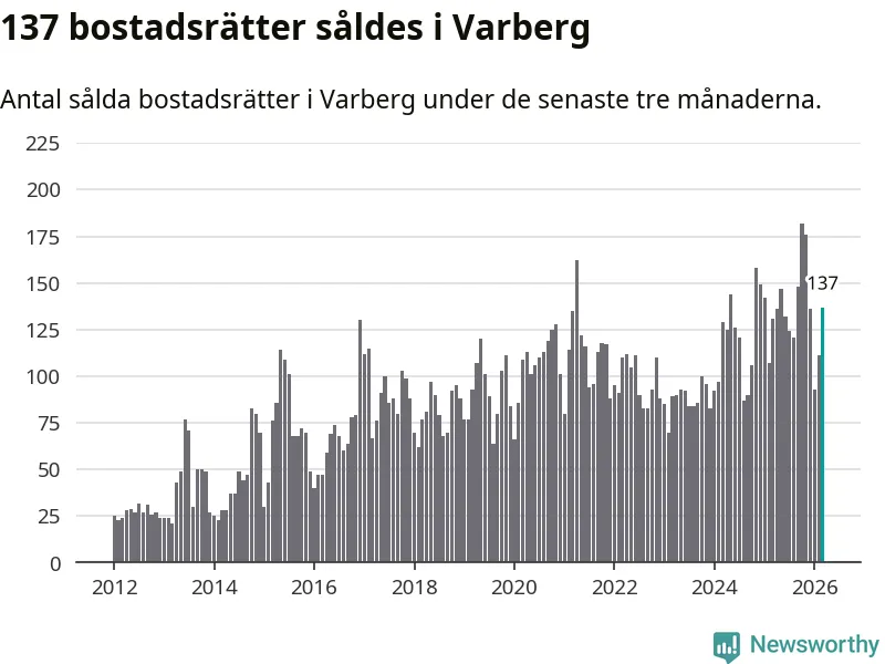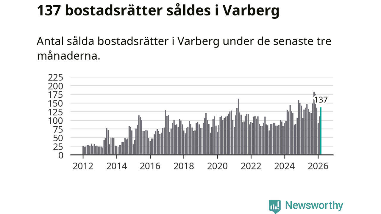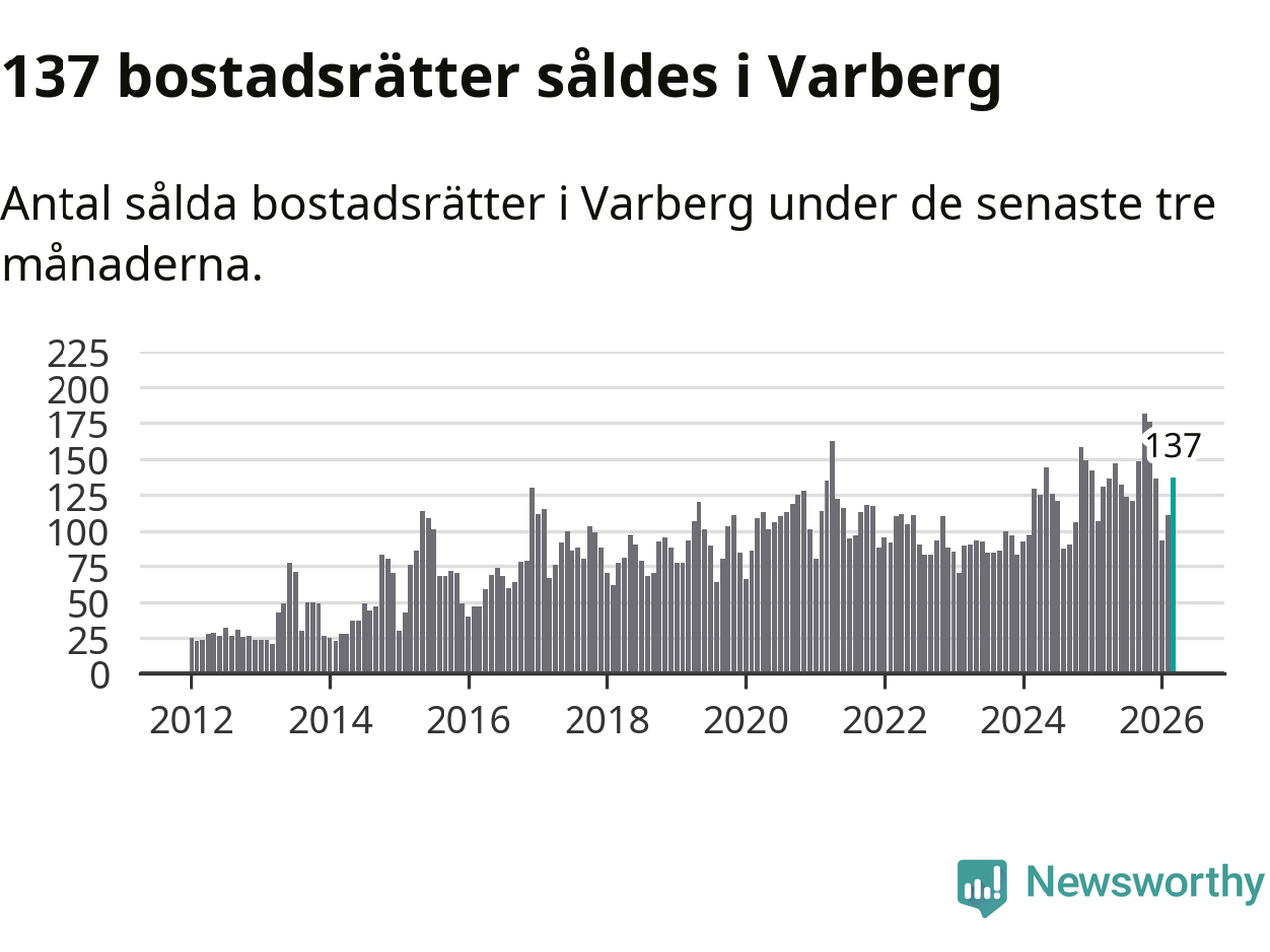 Sammanlagt såldes 137 bostadsrätter i Varbergs kommun mellan januari och mars till ett genomsnittligt pris på 3,1 miljoner kronor. I fjol gjordes 131 affärer vid den här tiden på året.