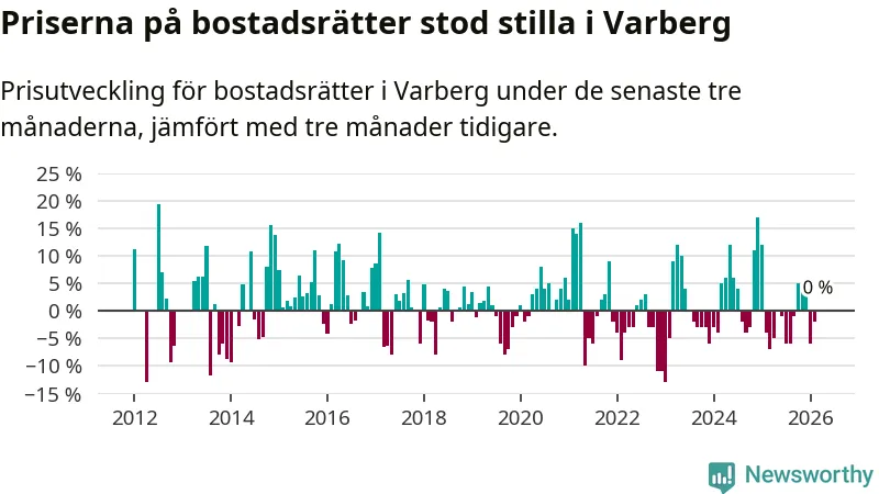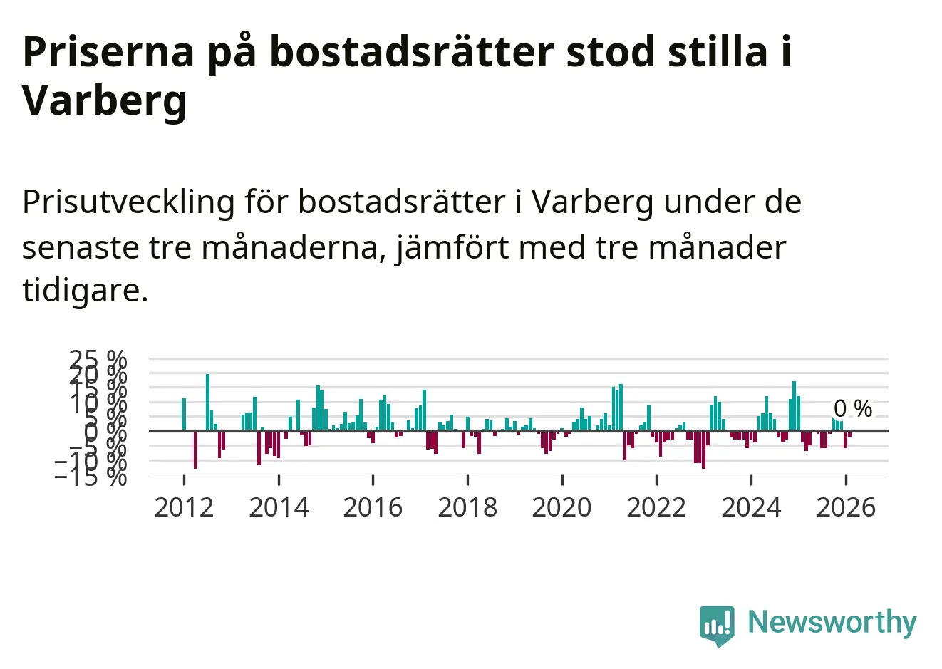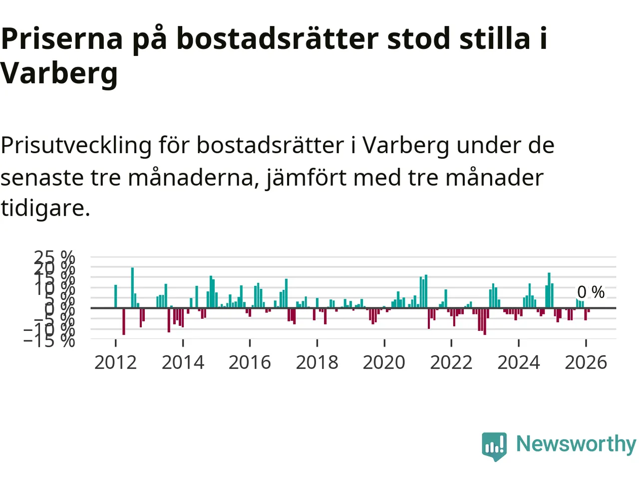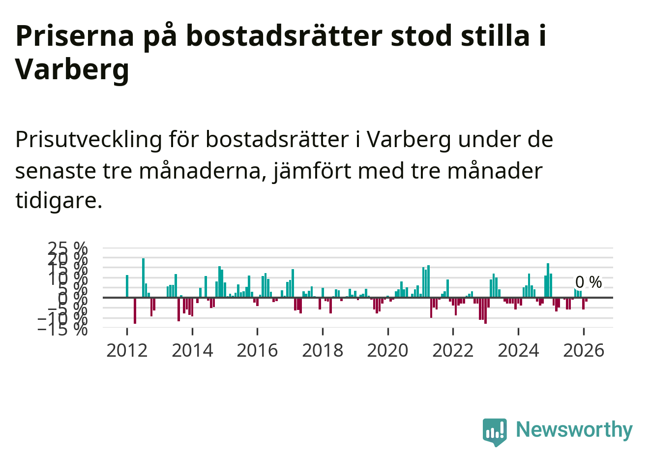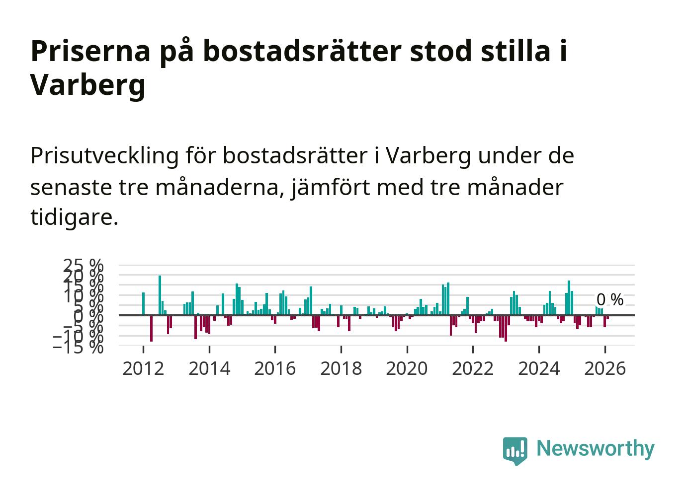 Priserna på bostadsrätter står i stort sett stilla i Varbergs kommun. Medelpriset på de på försäljningarna under de senaste tre månaderna låg på samma nivå som för tre månader sedan.