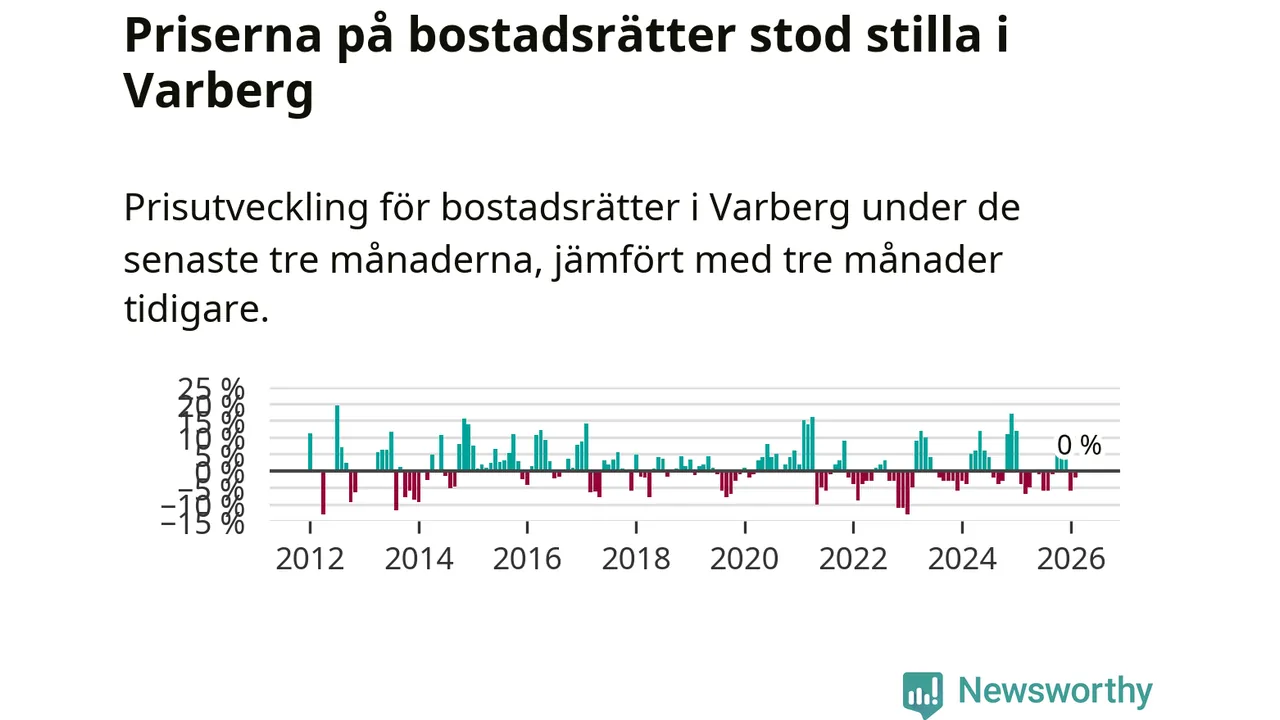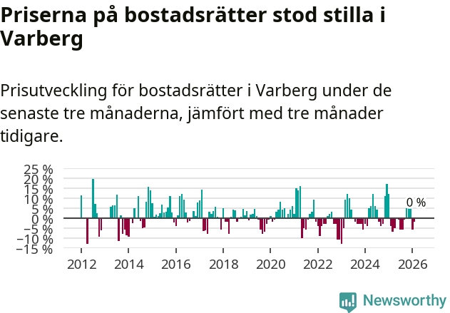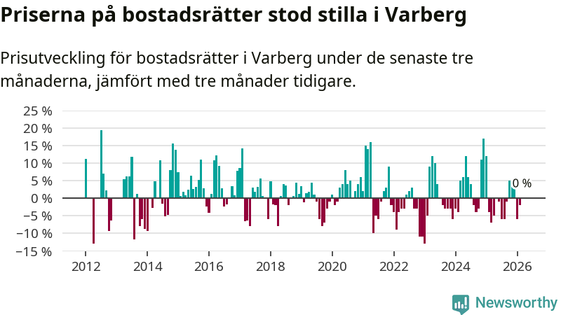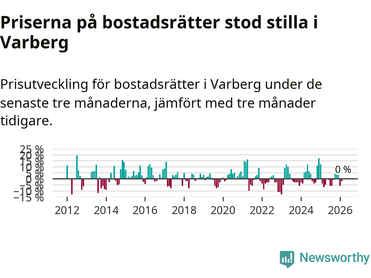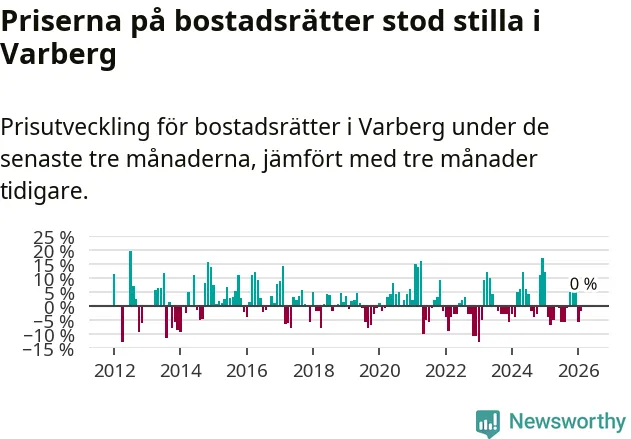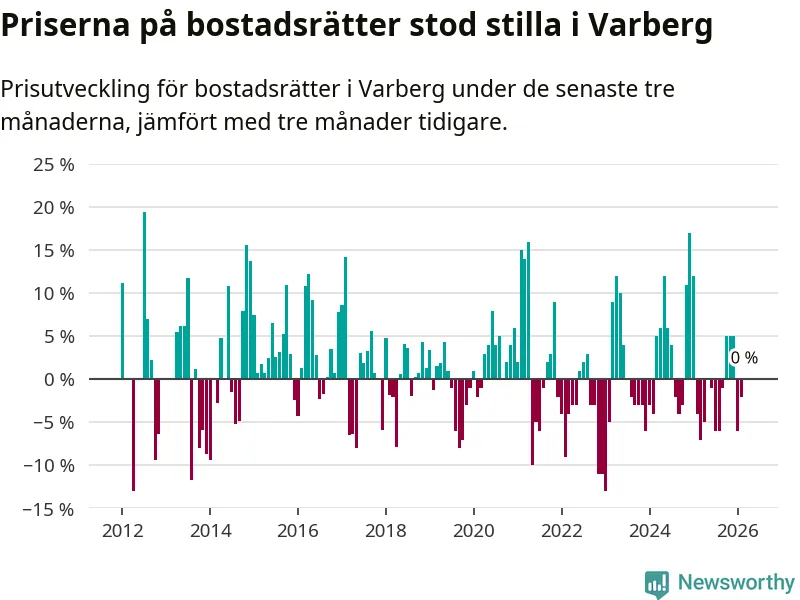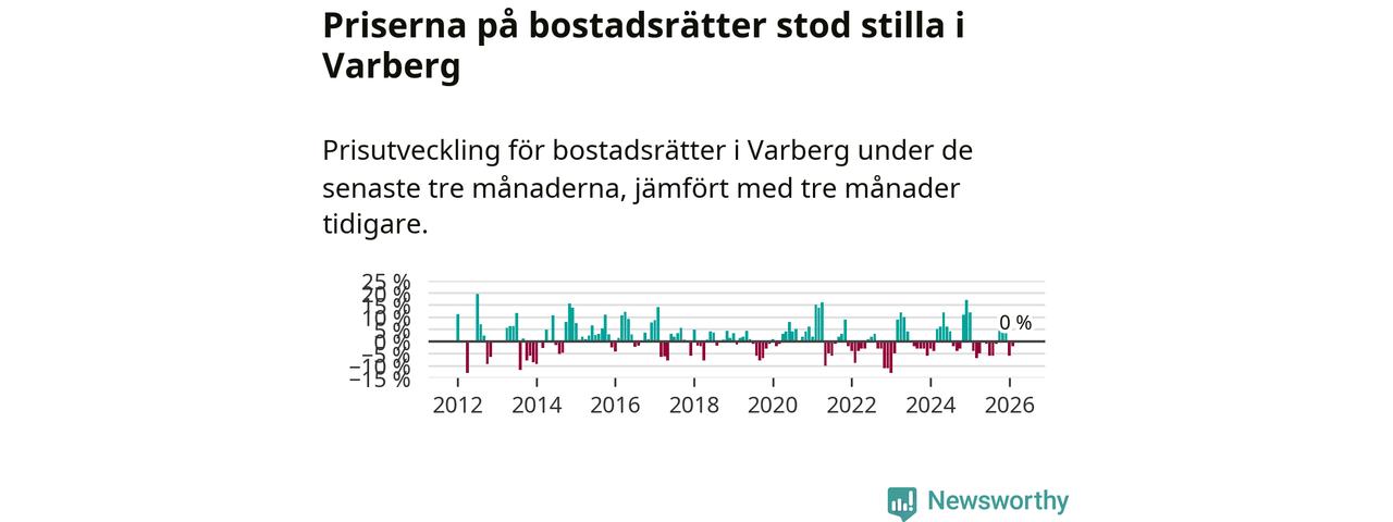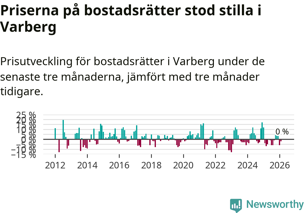 Priserna på bostadsrätter står i stort sett stilla i Varbergs kommun. Medelpriset på de på försäljningarna under de senaste tre månaderna låg på samma nivå som för tre månader sedan.