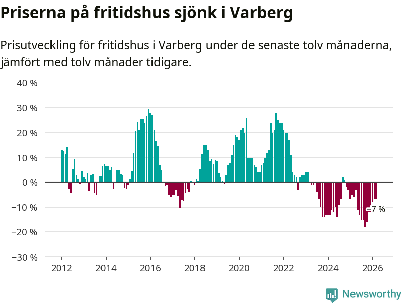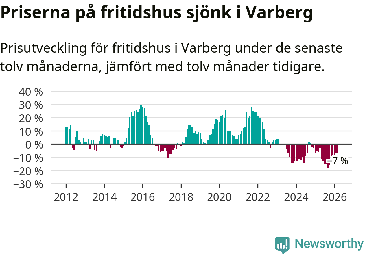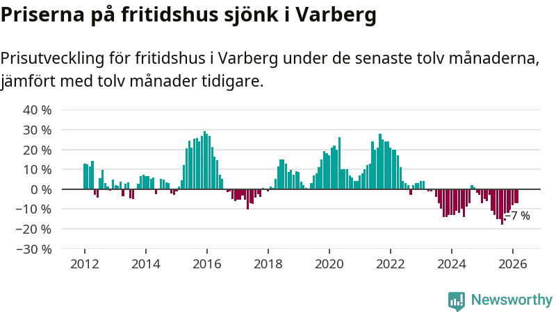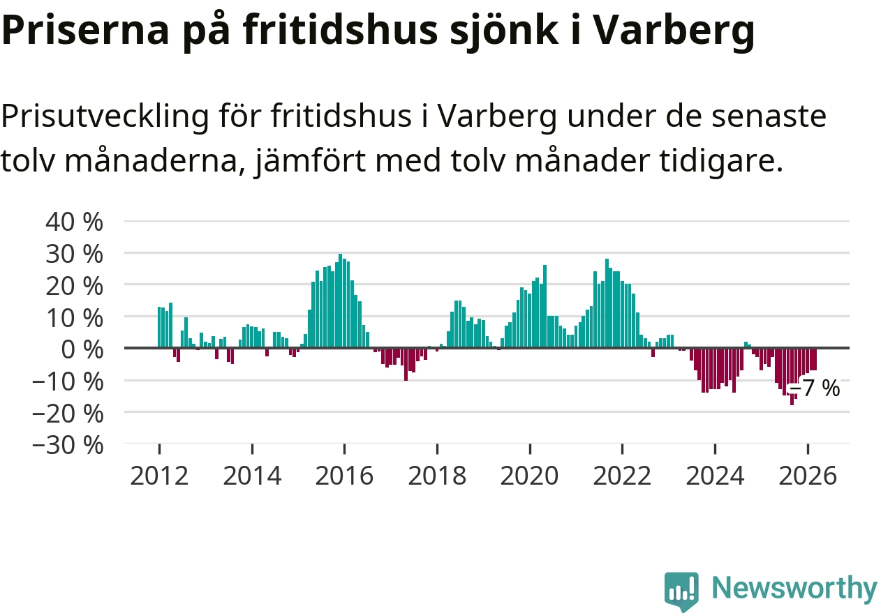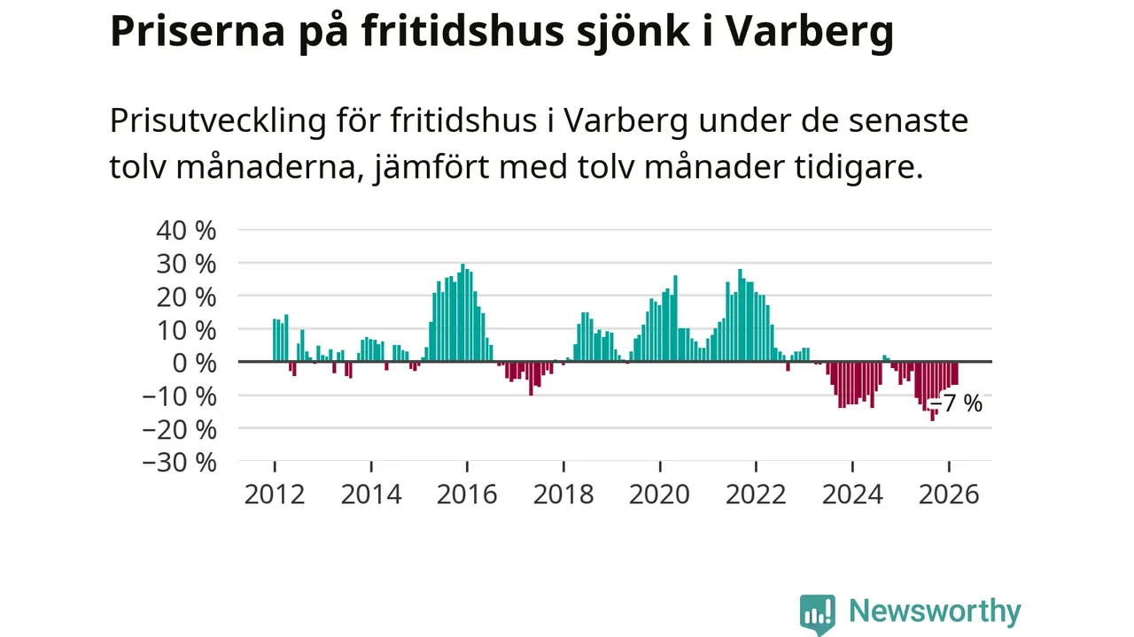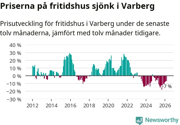 Priserna på fritidshus har gått ner i Varbergs kommun. Medelpriset på försäljningarna under de senaste tolv månaderna visar på en nedgång med 7 procent.