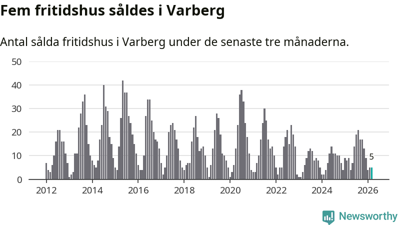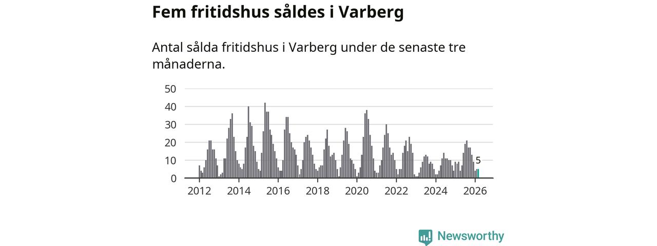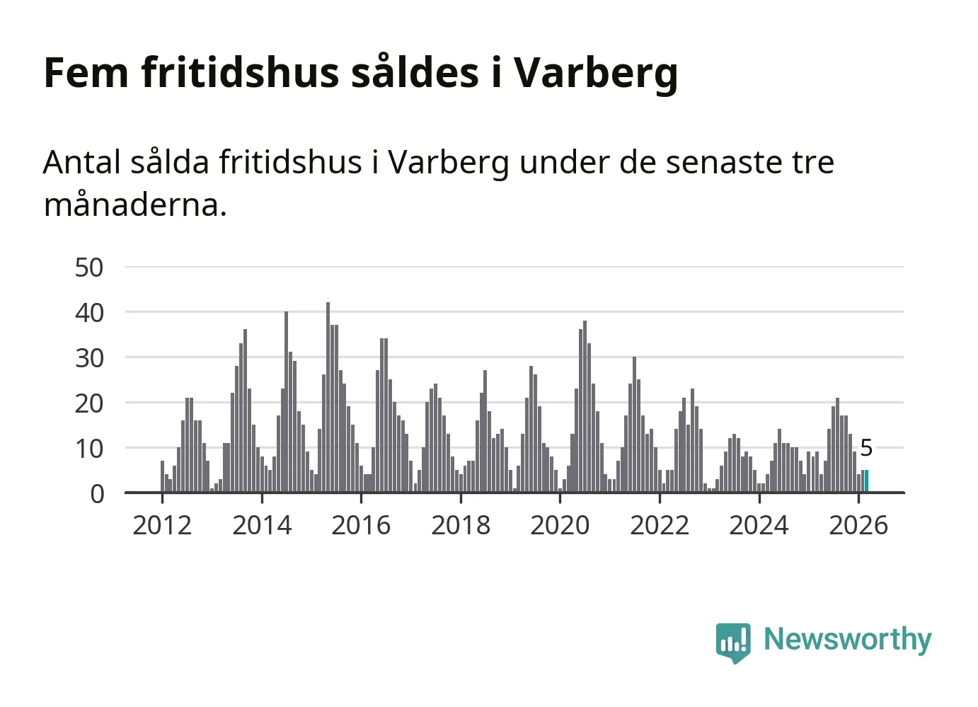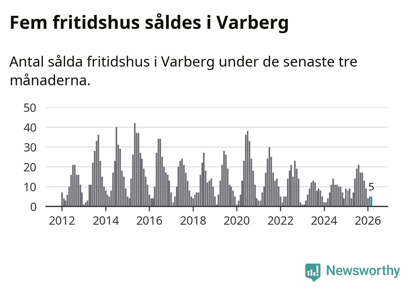 Sammanlagt såldes fem fritidshus i Varbergs kommun mellan januari och mars till ett genomsnittligt pris på 2,8 miljoner kronor. I fjol gjordes nio affärer vid den här tiden på året.