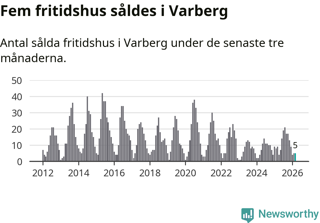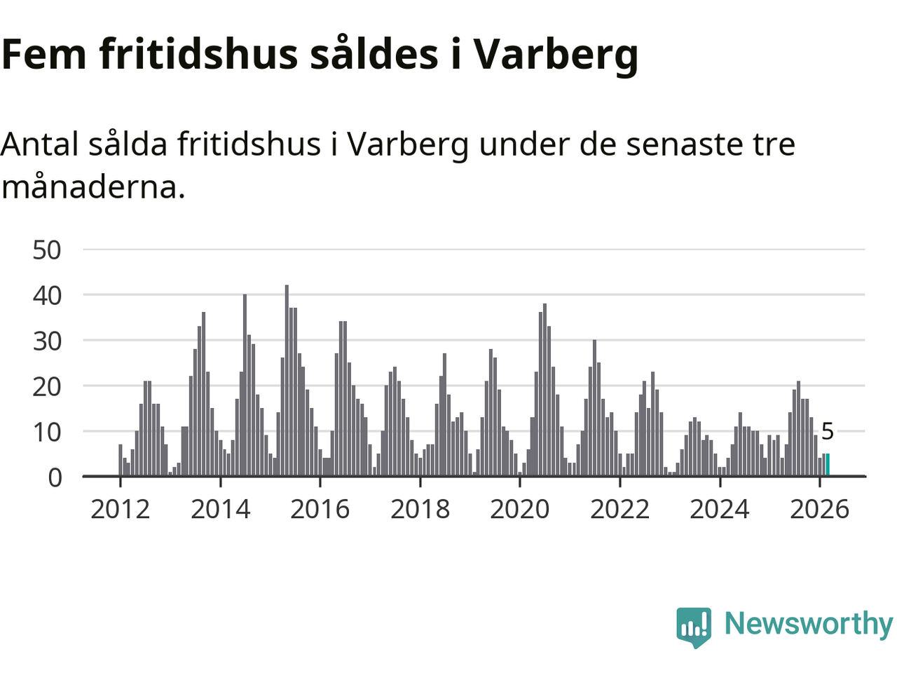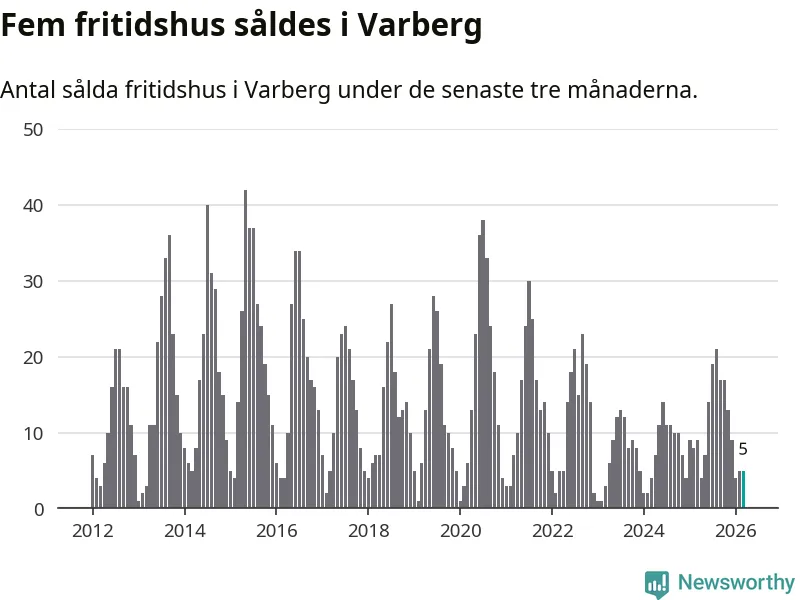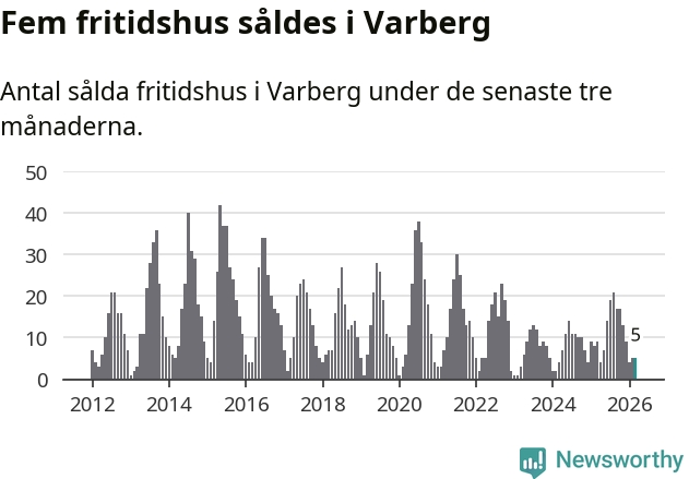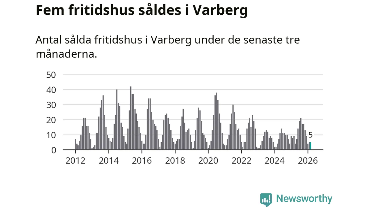 Sammanlagt såldes fem fritidshus i Varbergs kommun mellan januari och mars till ett genomsnittligt pris på 2,8 miljoner kronor. I fjol gjordes nio affärer vid den här tiden på året.