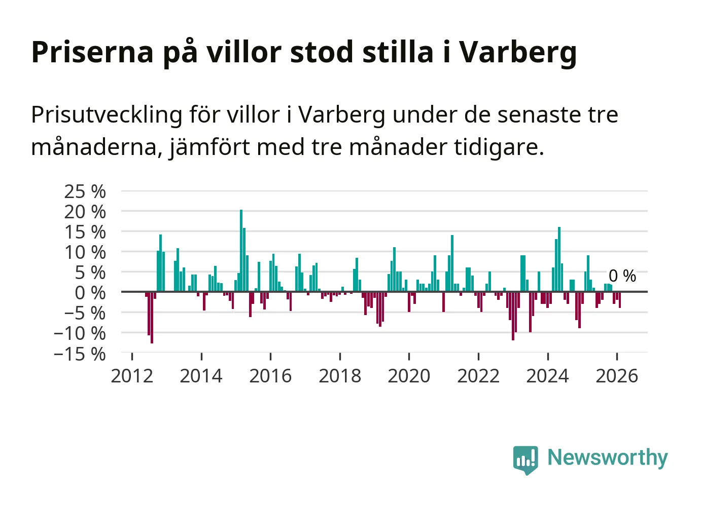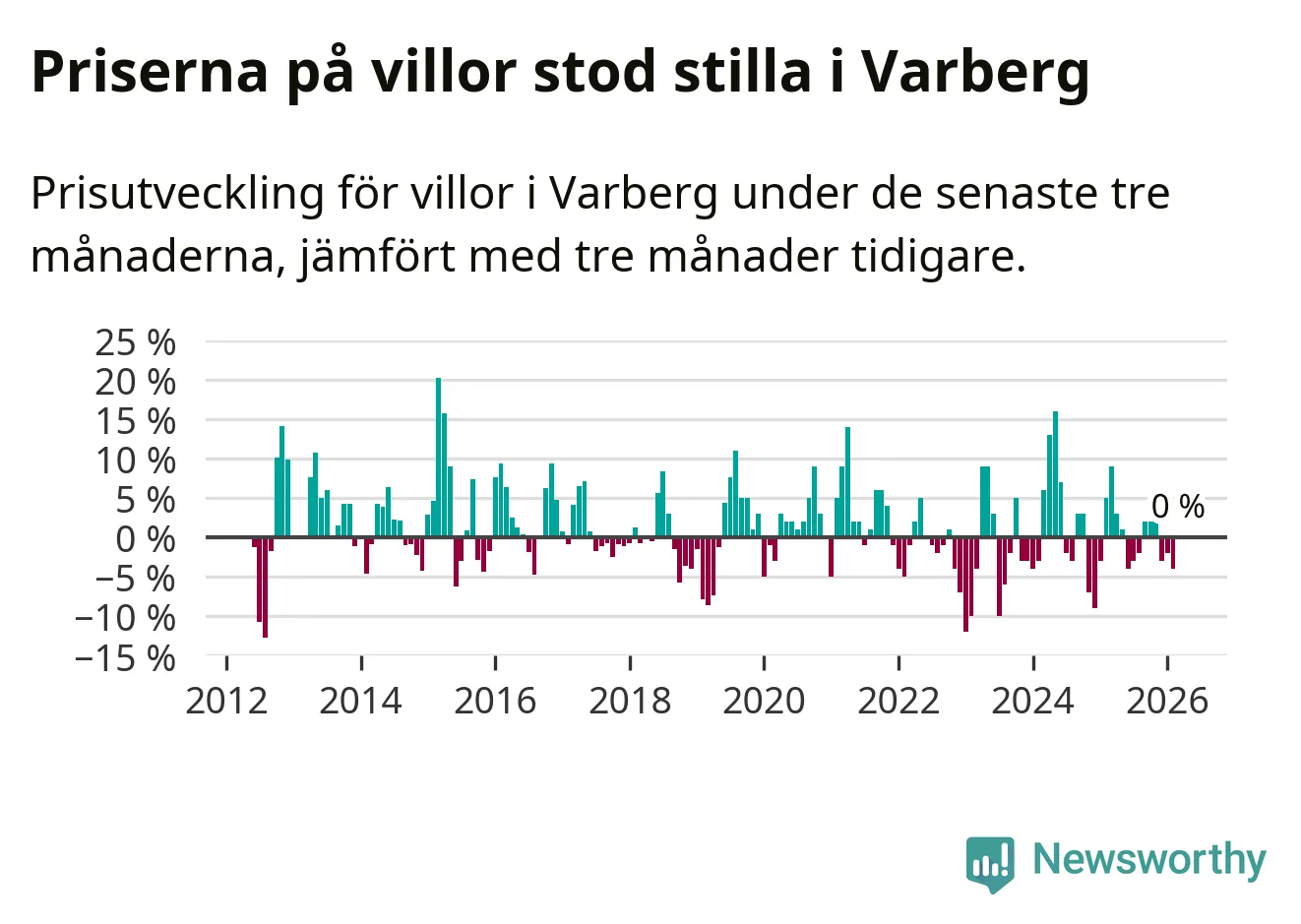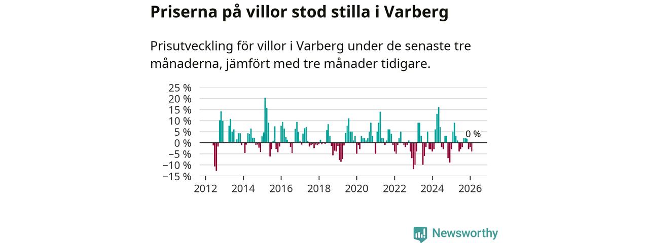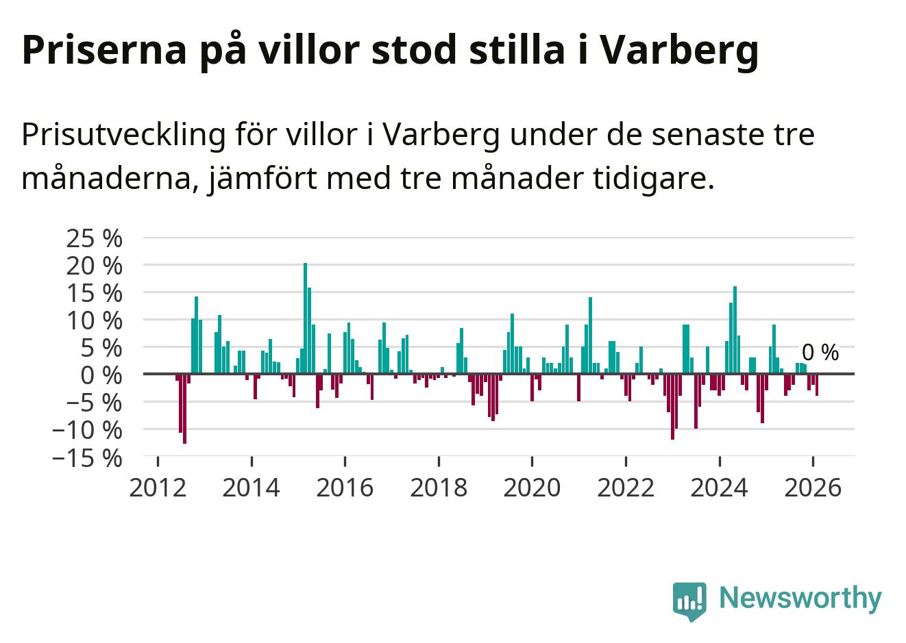 Villapriserna står i stort sett stilla i Varbergs kommun. Medelpriset på de på försäljningarna under de senaste tre månaderna låg på samma nivå som för tre månader sedan.