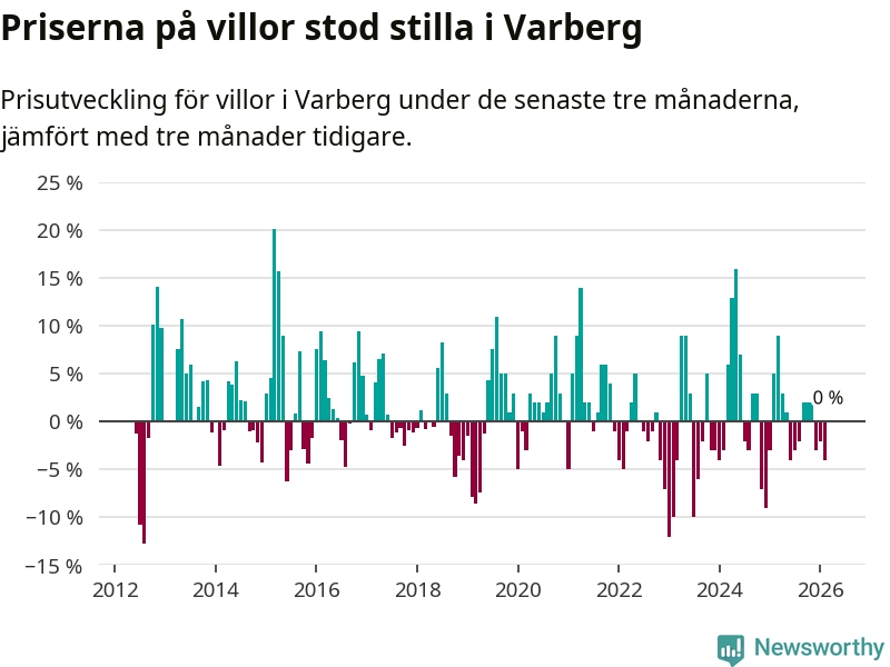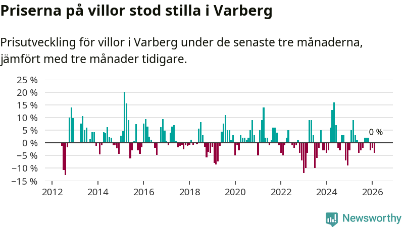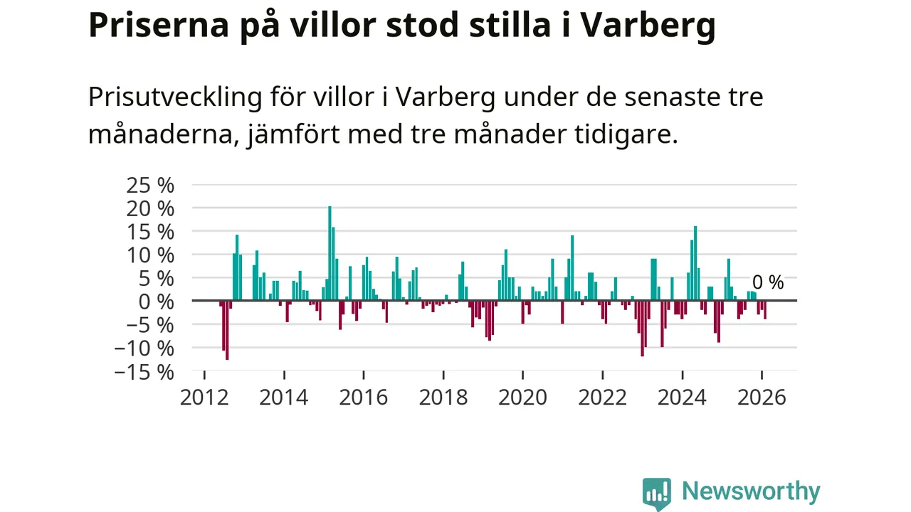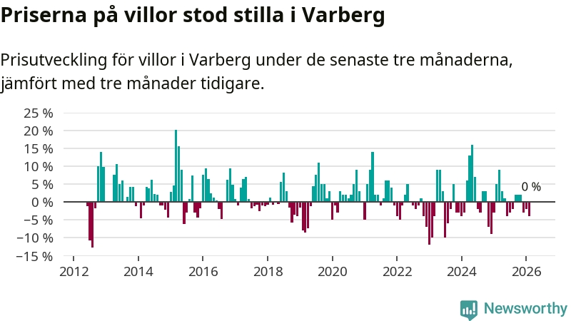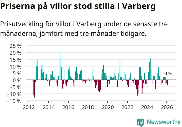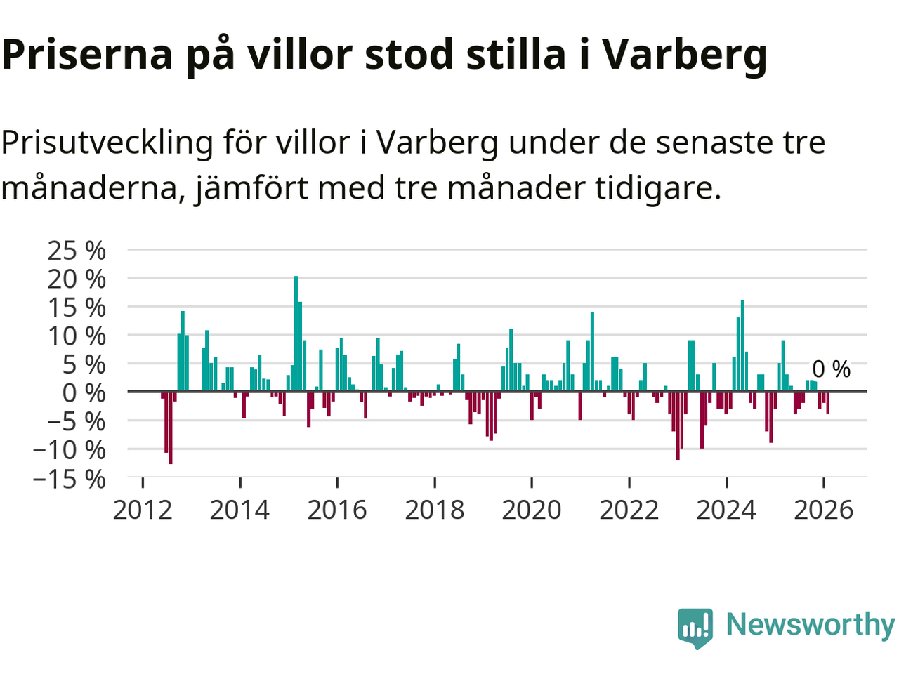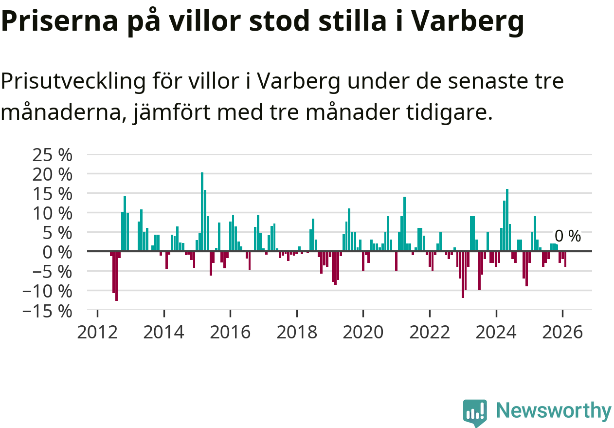 Villapriserna står i stort sett stilla i Varbergs kommun. Medelpriset på de på försäljningarna under de senaste tre månaderna låg på samma nivå som för tre månader sedan.
