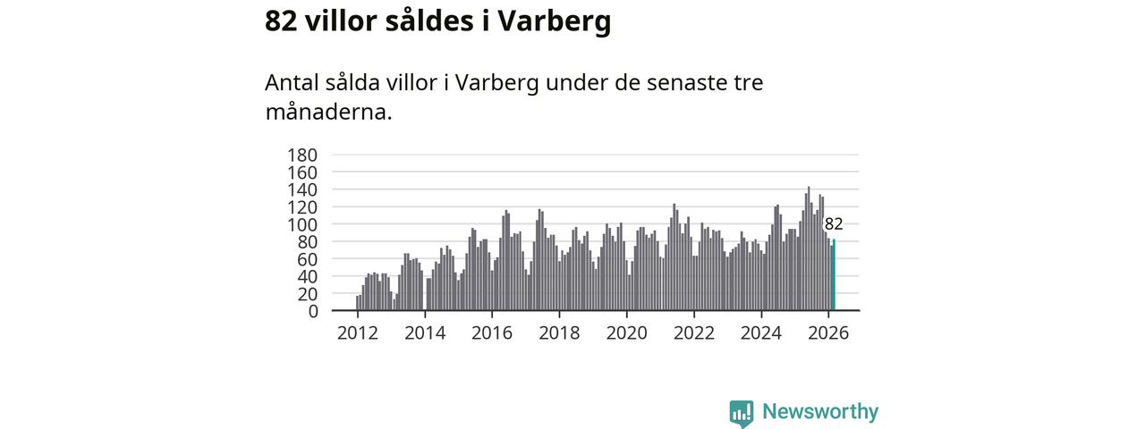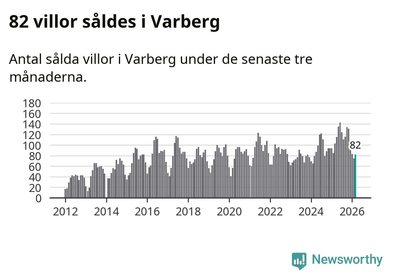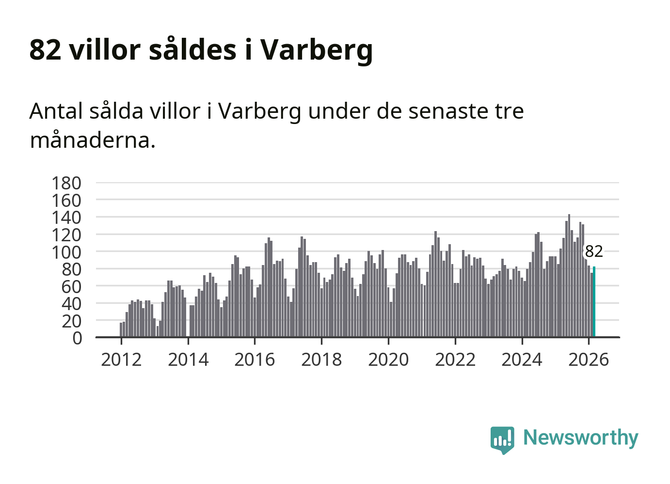 Sammanlagt såldes 82 villor i Varbergs kommun mellan januari och mars till ett genomsnittligt pris på 4,6 miljoner kronor. I fjol gjordes 103 affärer vid den här tiden på året.