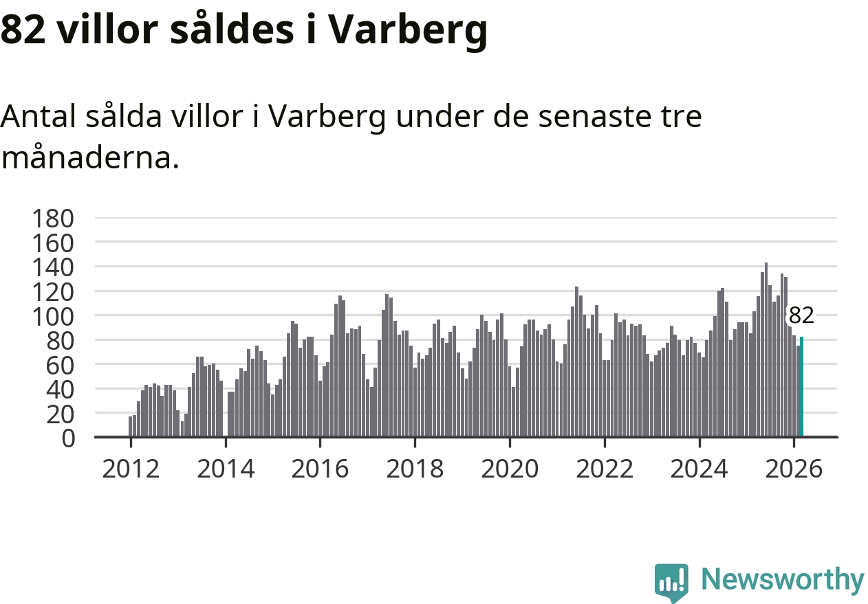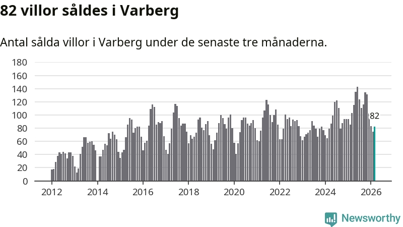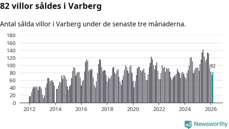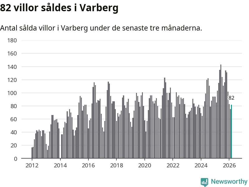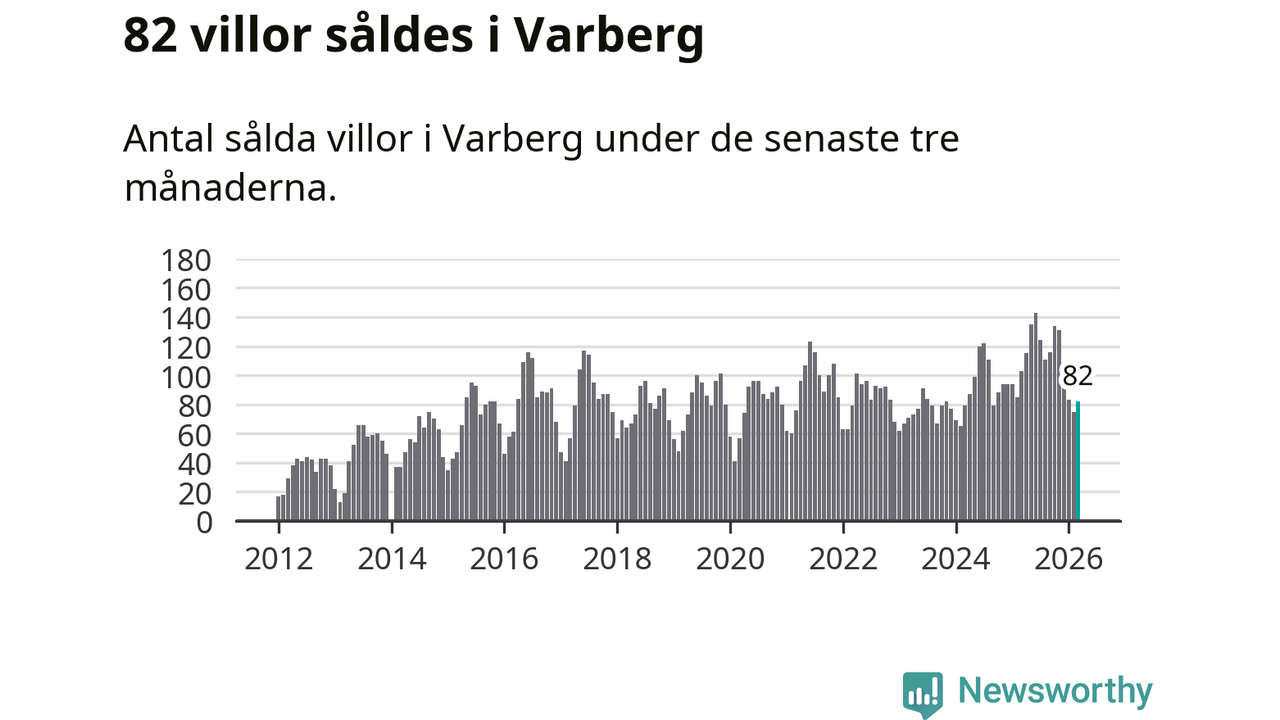 Sammanlagt såldes 82 villor i Varbergs kommun mellan januari och mars till ett genomsnittligt pris på 4,6 miljoner kronor. I fjol gjordes 103 affärer vid den här tiden på året.