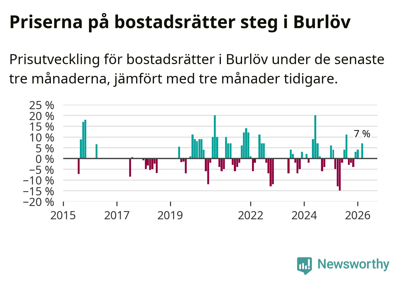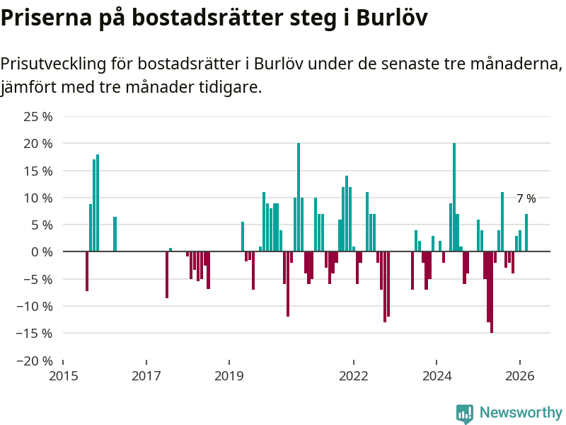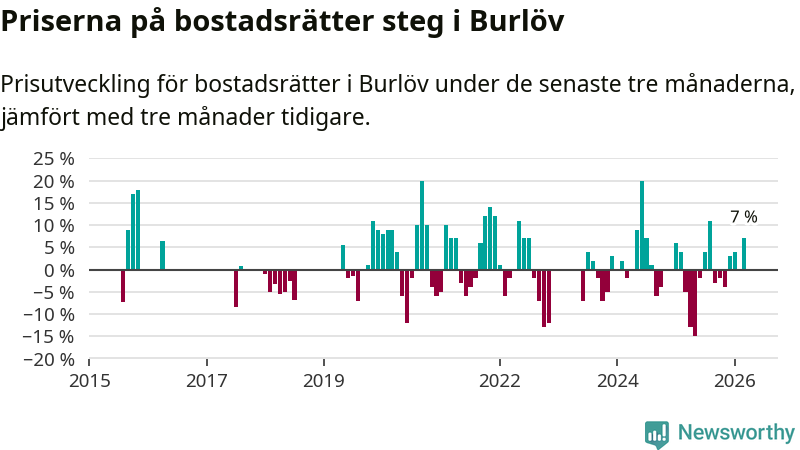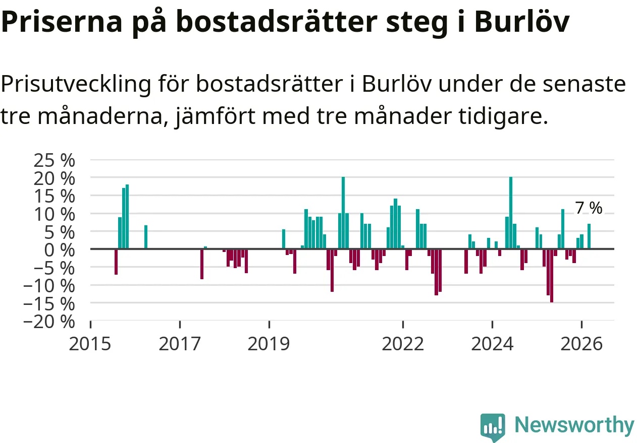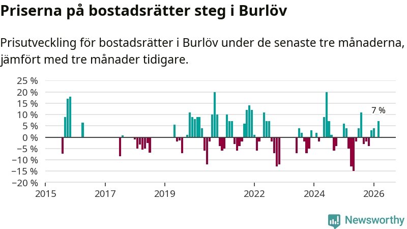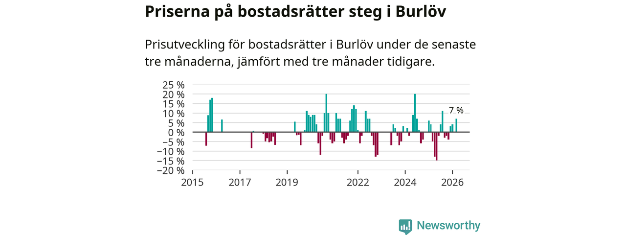 Statistiken visar även på en kännbar prisuppgång i Burlövs kommun. Medelpriset på försäljningarna av bostadsrätter i kommunen var 7 procent högre än för tre månader sedan. Även i hela Skåne ökar priserna på bostadsrätter. I hela länet noterades en prisuppgång på 2 procent.