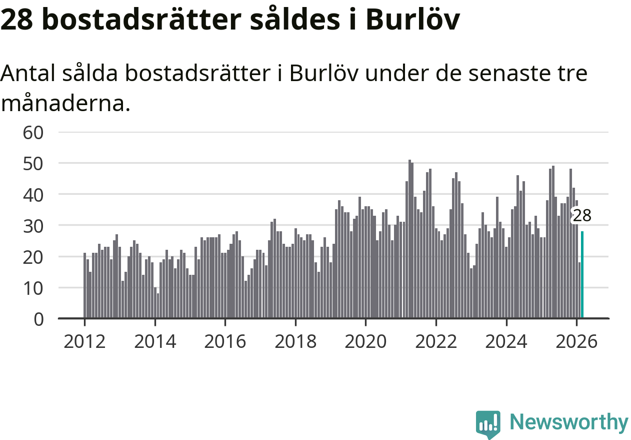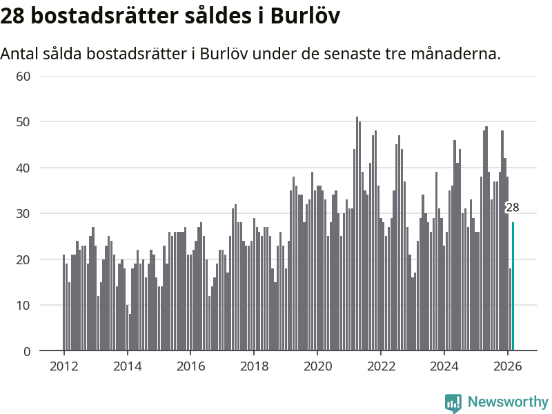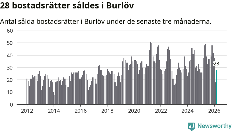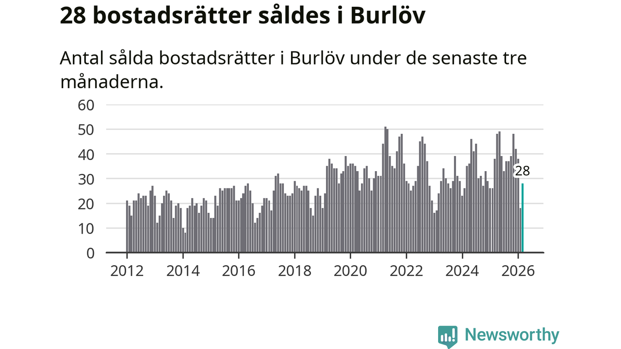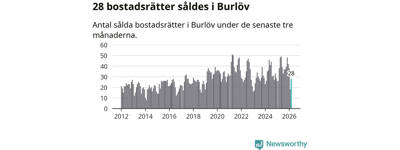Mellan januari och mars såldes 28 bostadsrätter i Burlövs kommun. Det är relativt få sett till aktiviteten på bostadsmarknaden i kommunen under de senaste tolv månaderna, samt det historiska snittet för den här tiden på året.