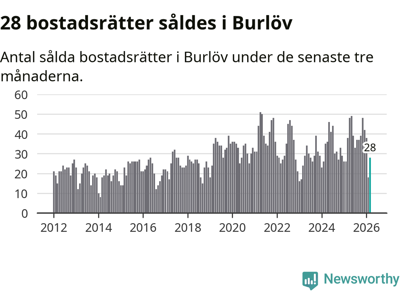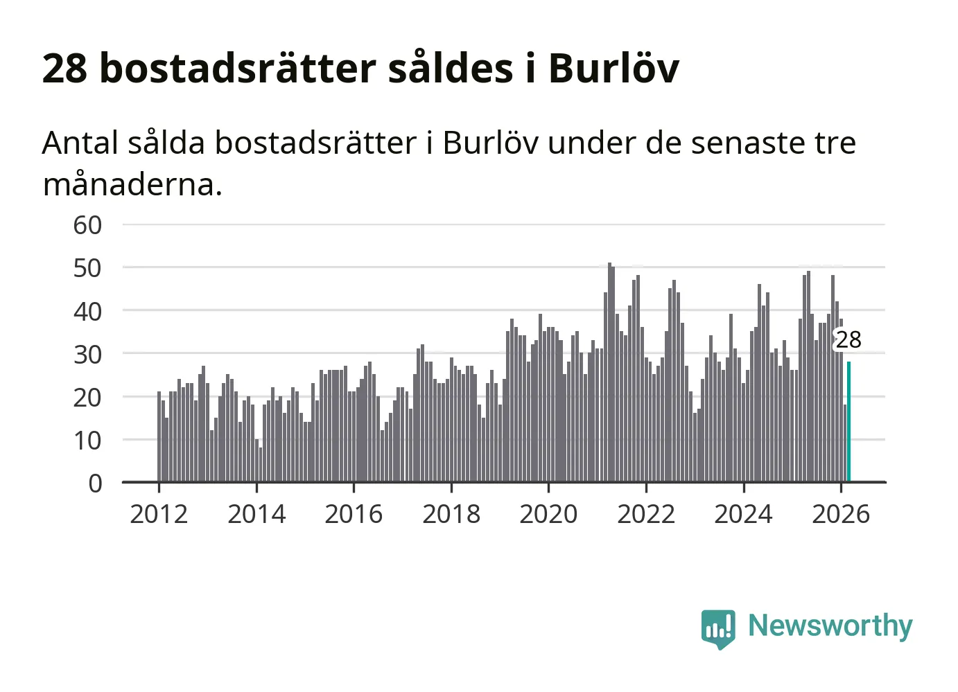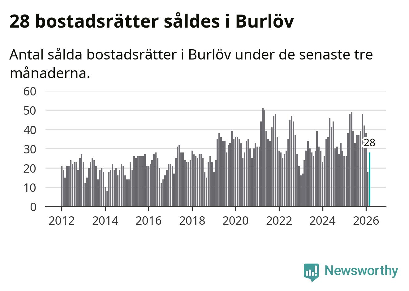 Mellan januari och mars såldes 28 bostadsrätter i Burlövs kommun. Det är relativt få sett till aktiviteten på bostadsmarknaden i kommunen under de senaste tolv månaderna, samt det historiska snittet för den här tiden på året.