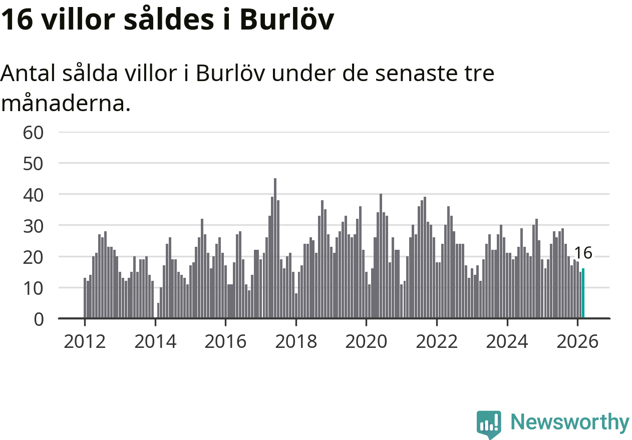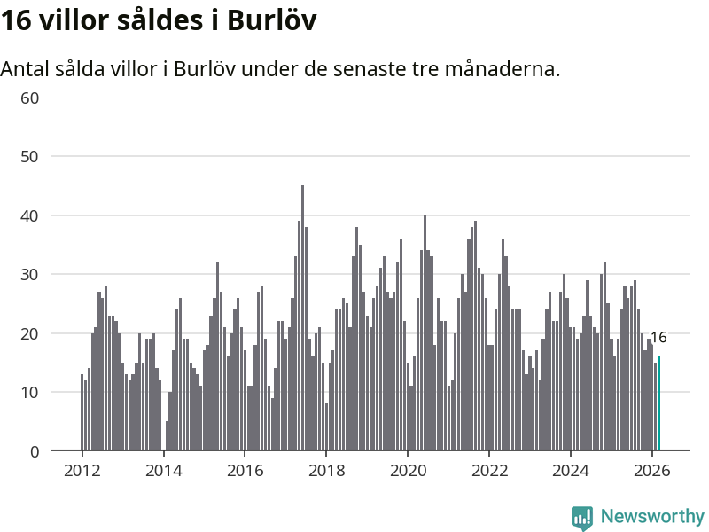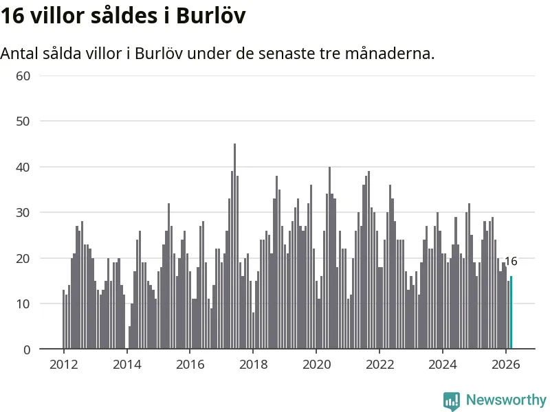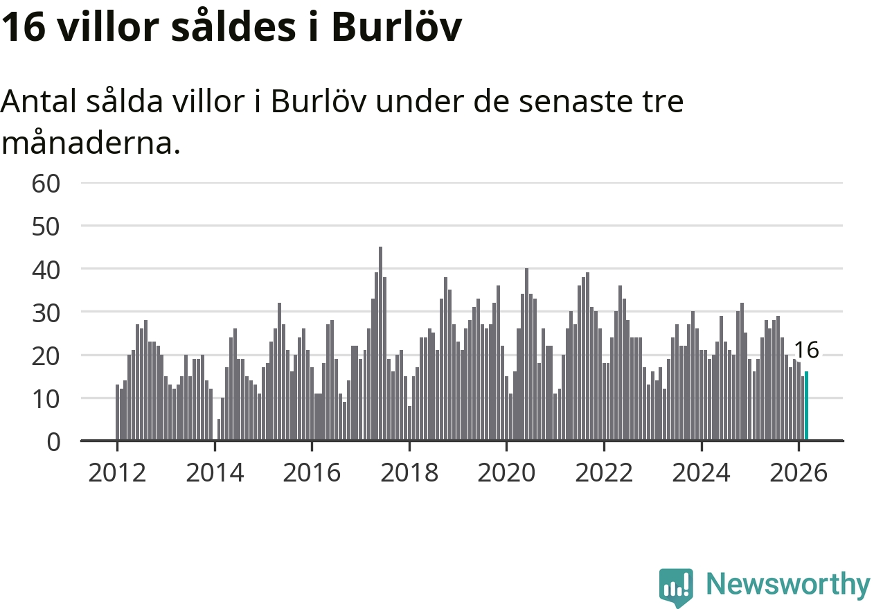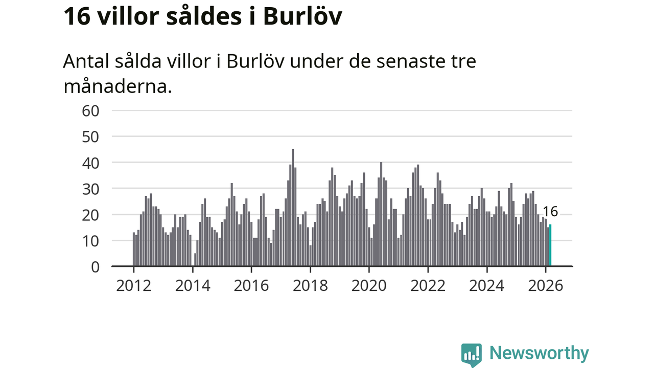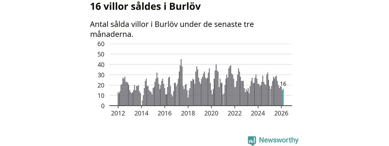 Mellan januari och mars gjordes sammanlagt 16 affärer med villor i Burlövs kommun. Det kan jämföras med 19 vid motsvarande tid i fjol.